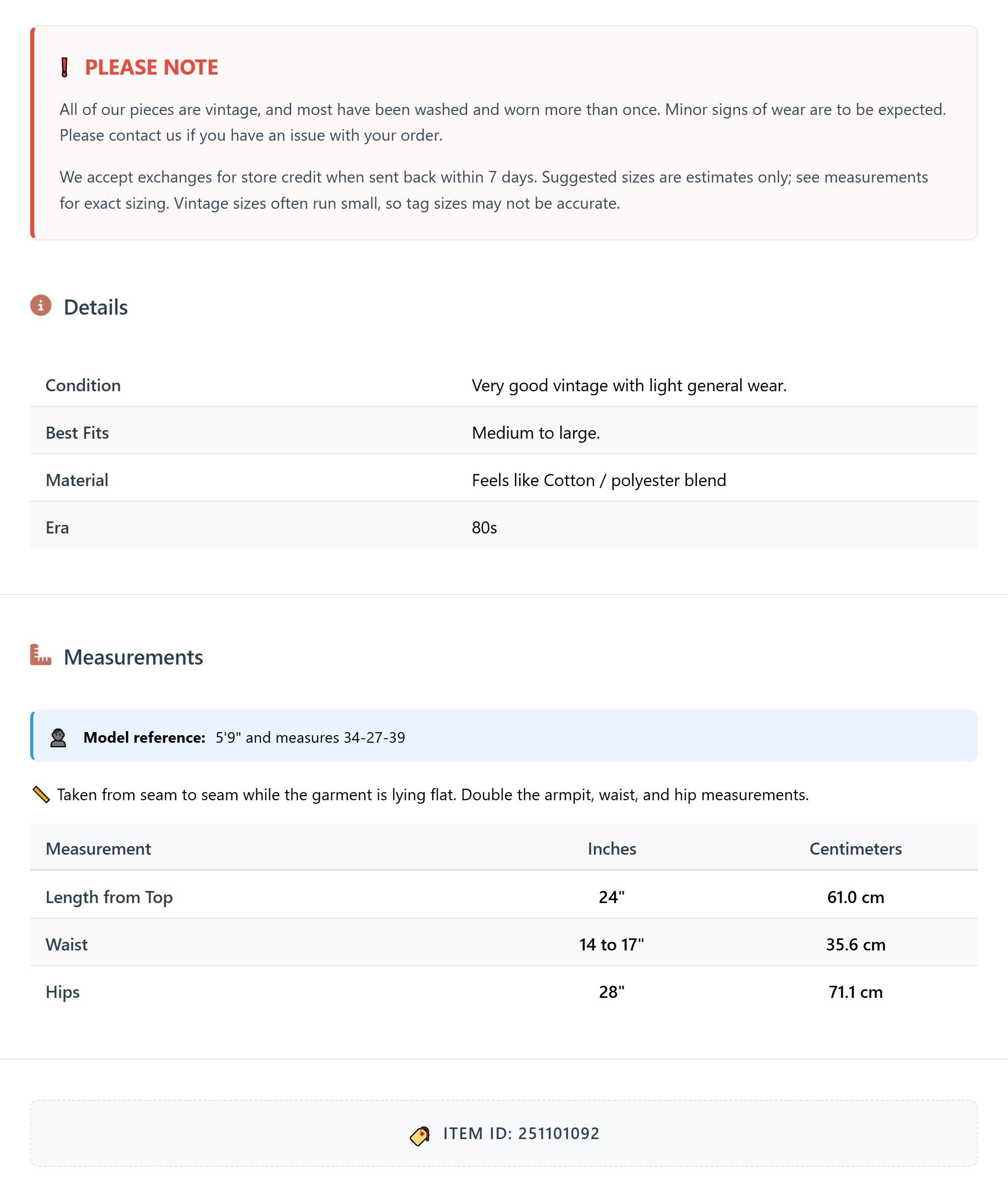 Suggested sizes are estimates only; see measurements for exact sizing. Vintage sizes often run small, so tag sizes may not be accurate.