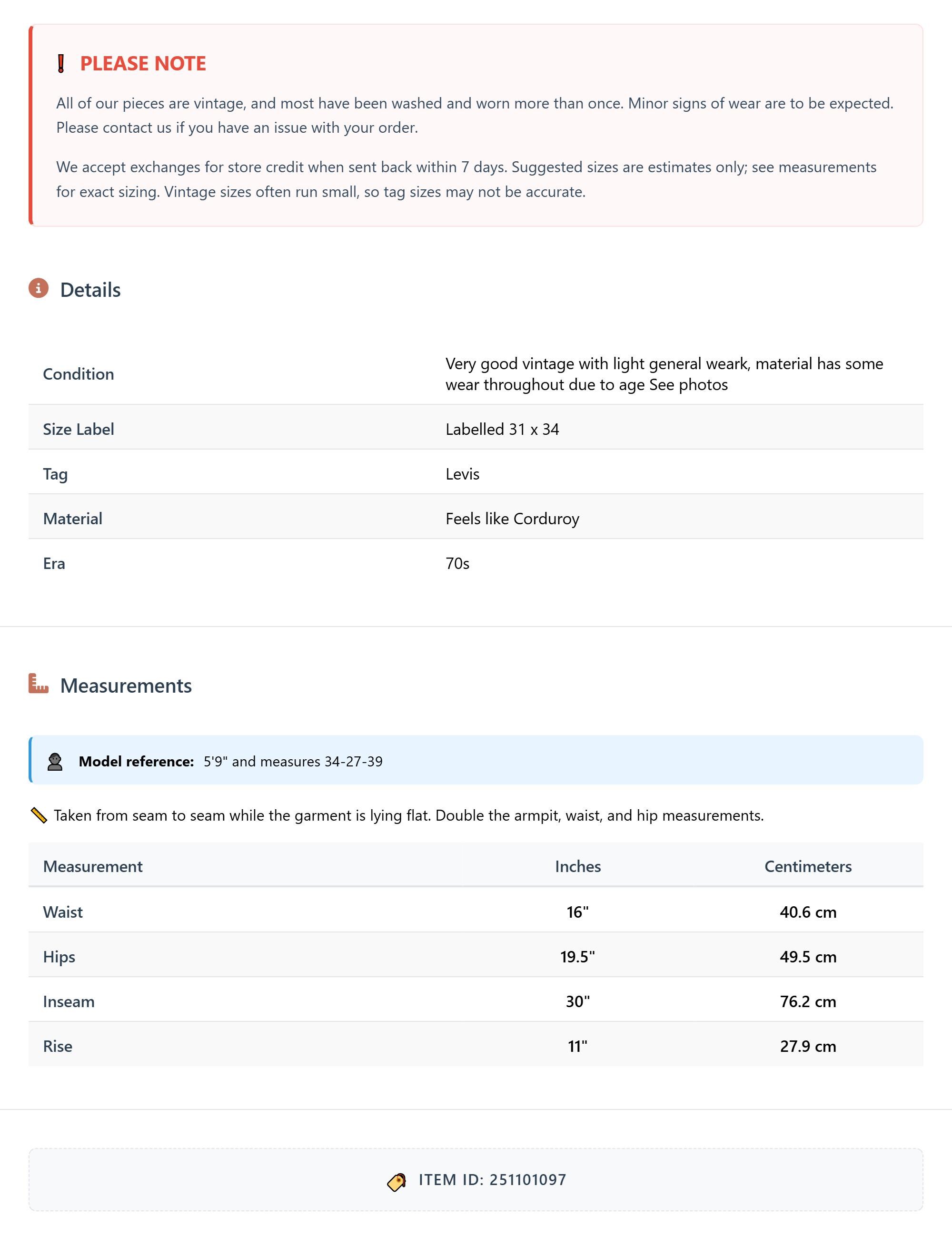Vintage denim was usually made without any stretch, unlike modern jeans. Check the measurements to ensure proper fit, and remember to give yourself a little wiggle room in the waist and hips, depending on your preferred fit.