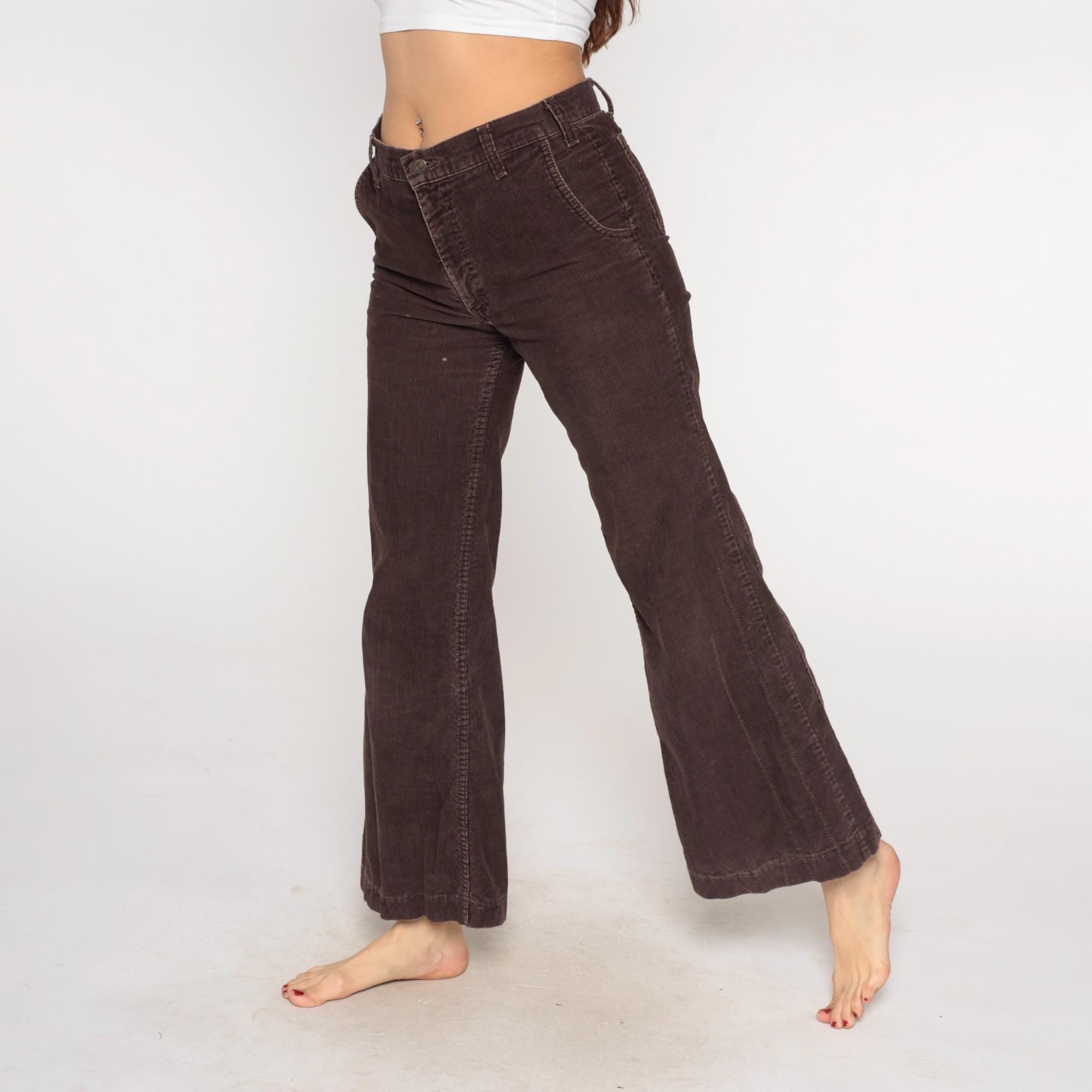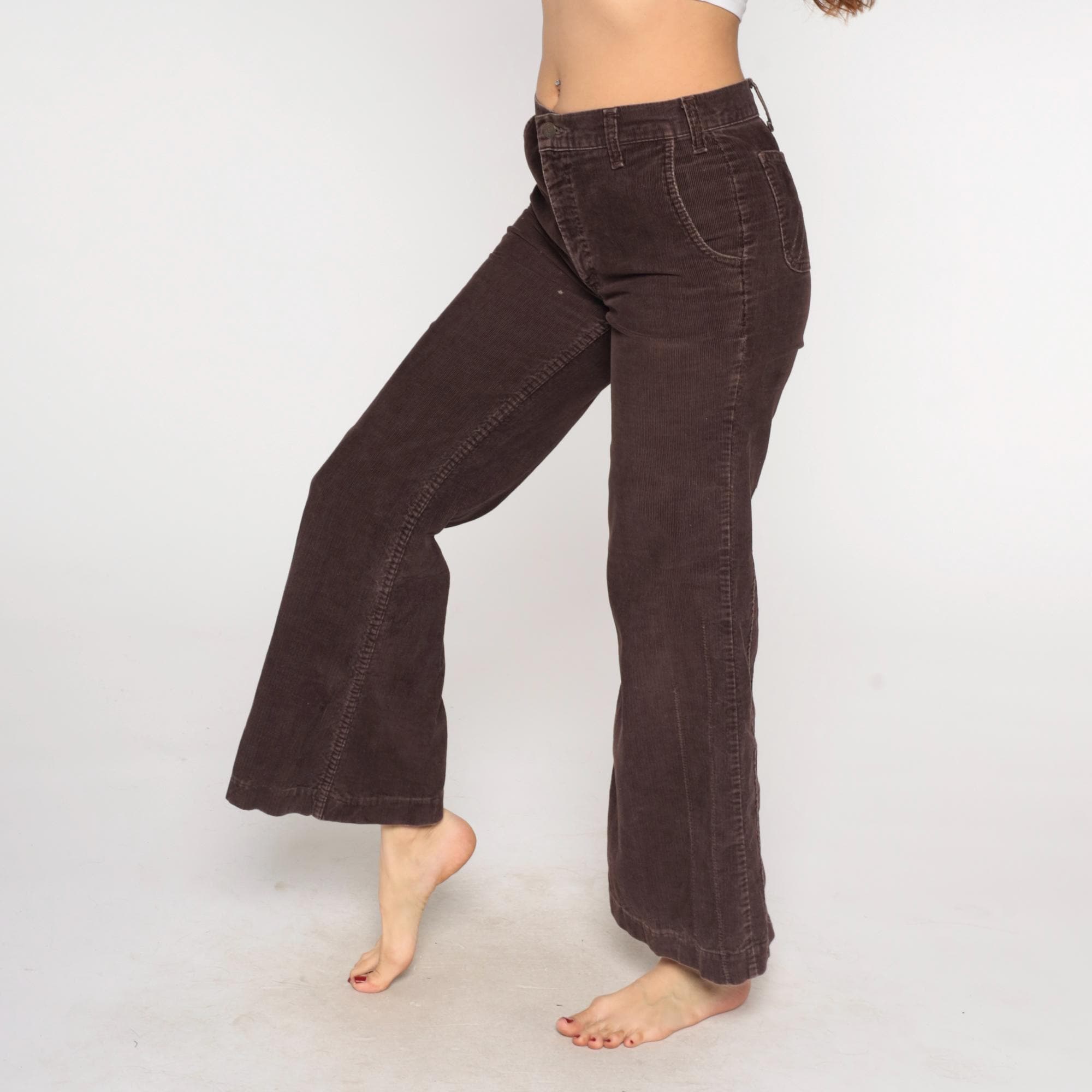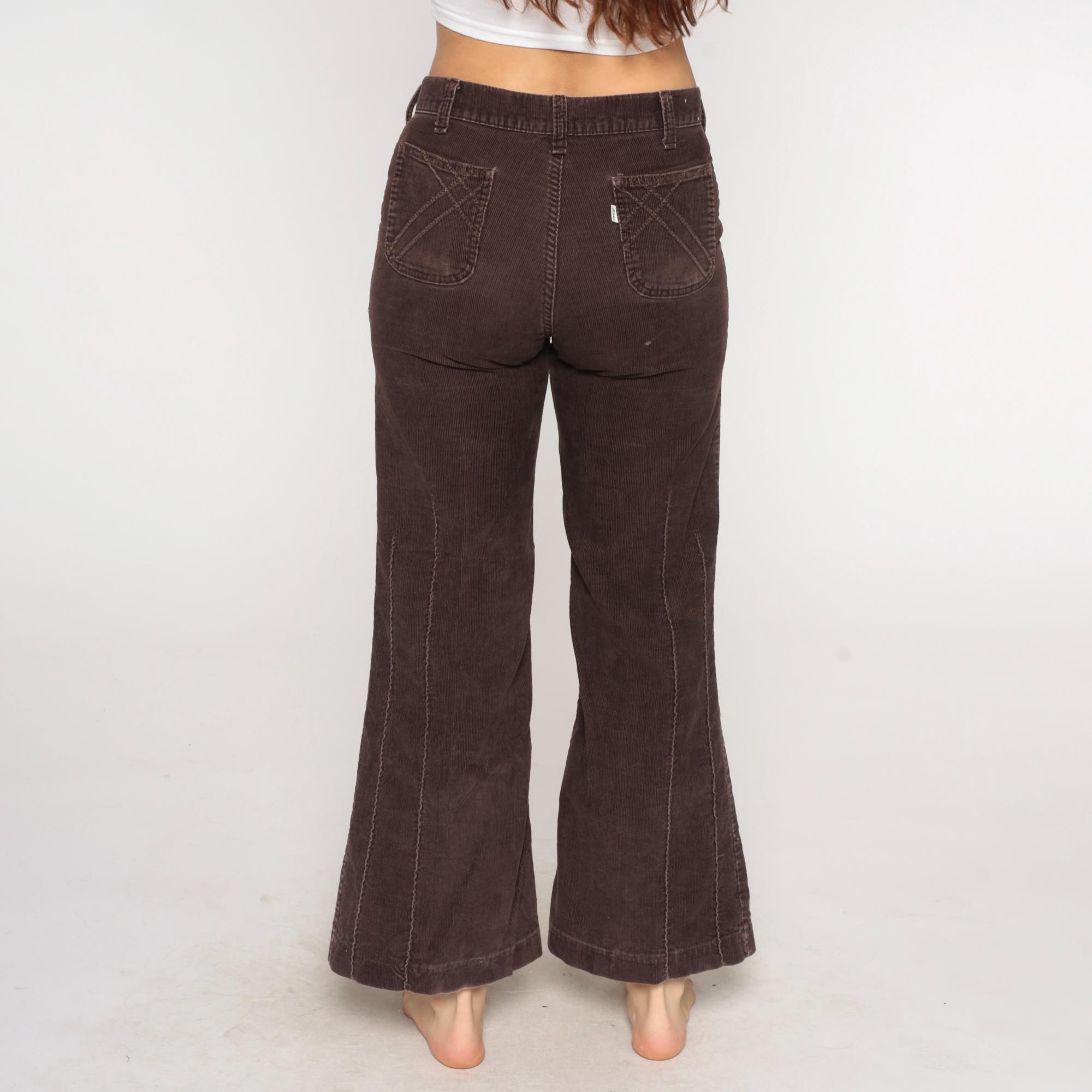 70s brown corduroy flared pants from Levi's with button fly closure and curved back pockets. Wide flared leg opening with classic bootcut silhouette.