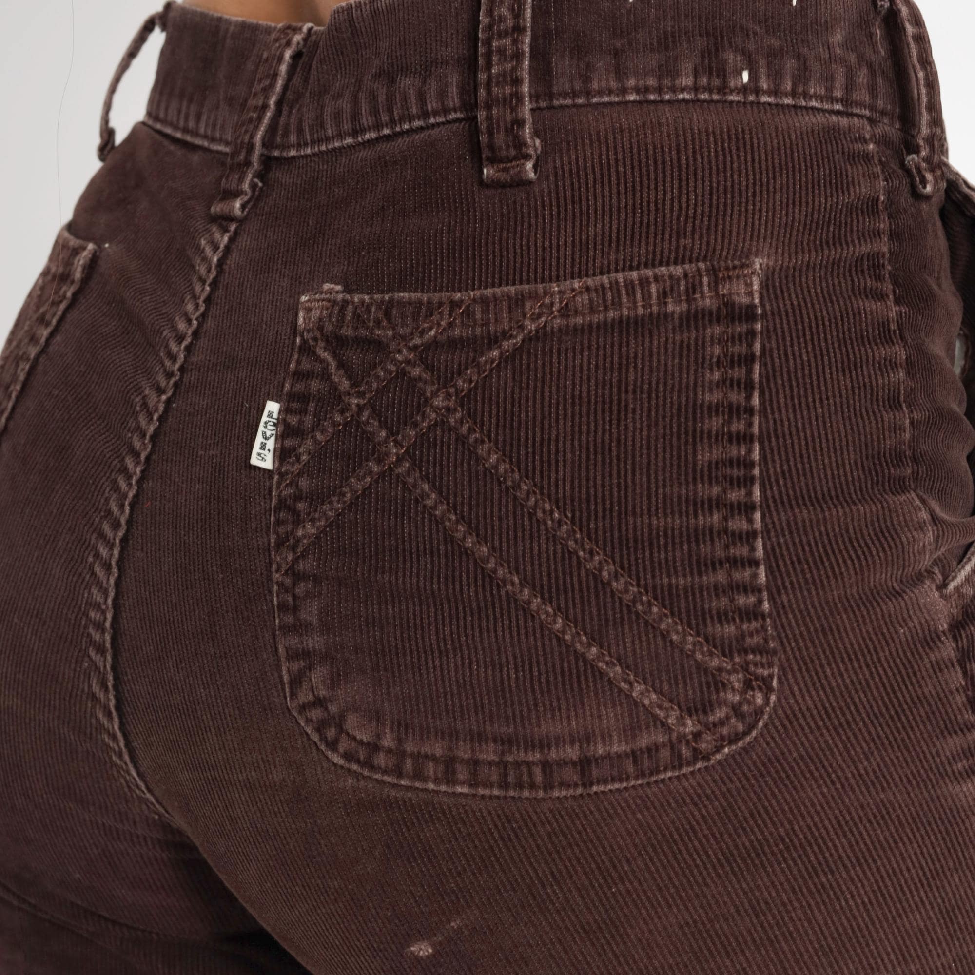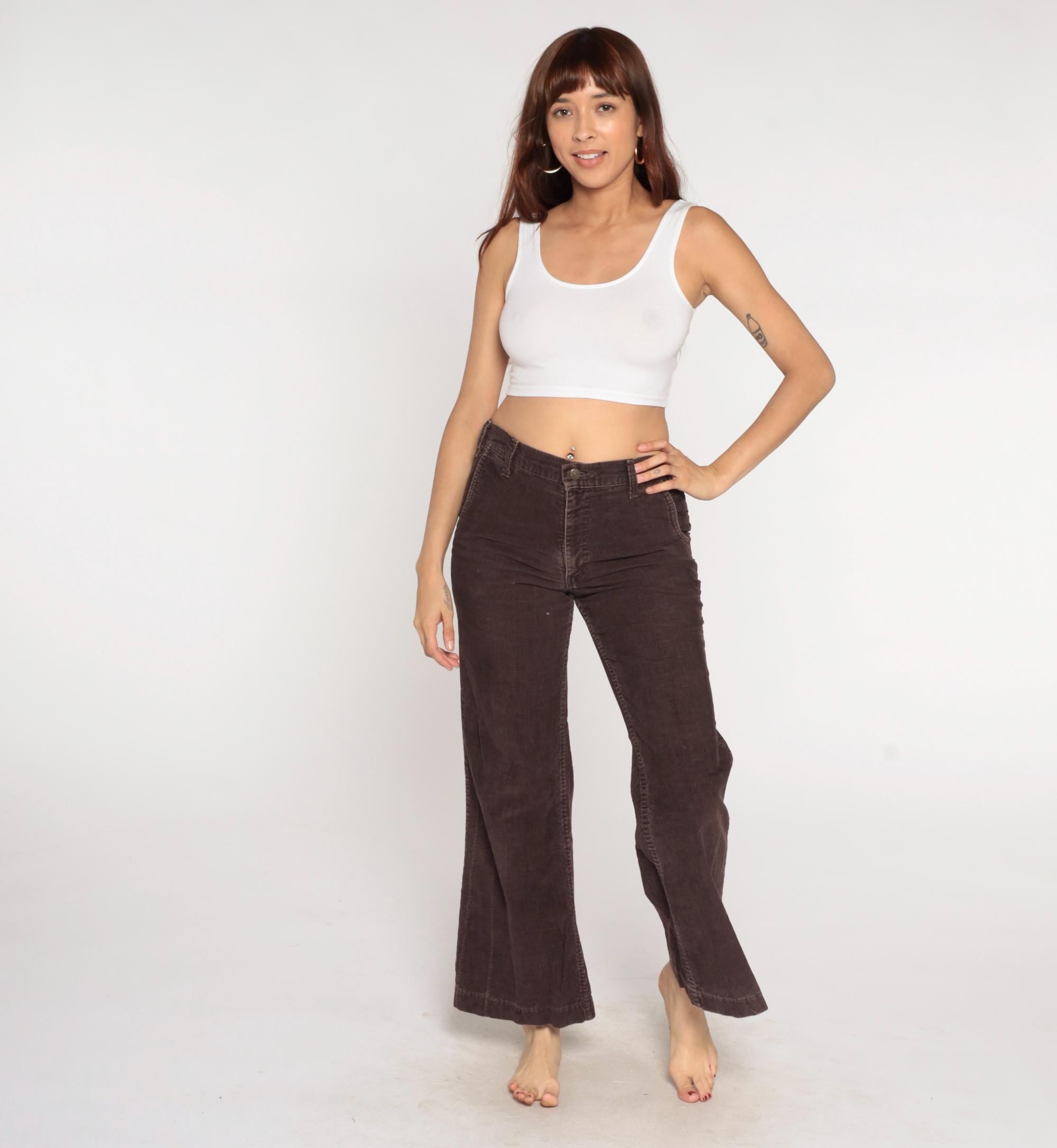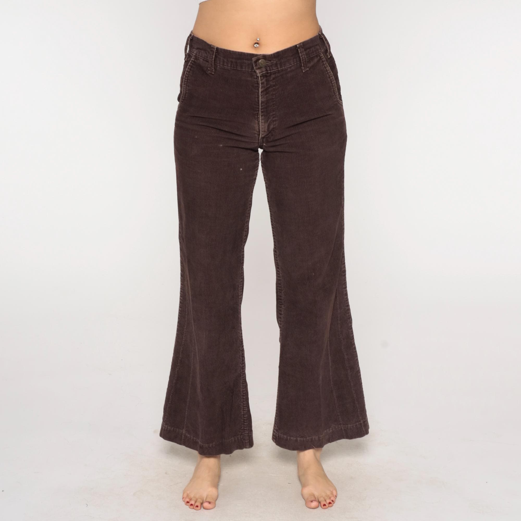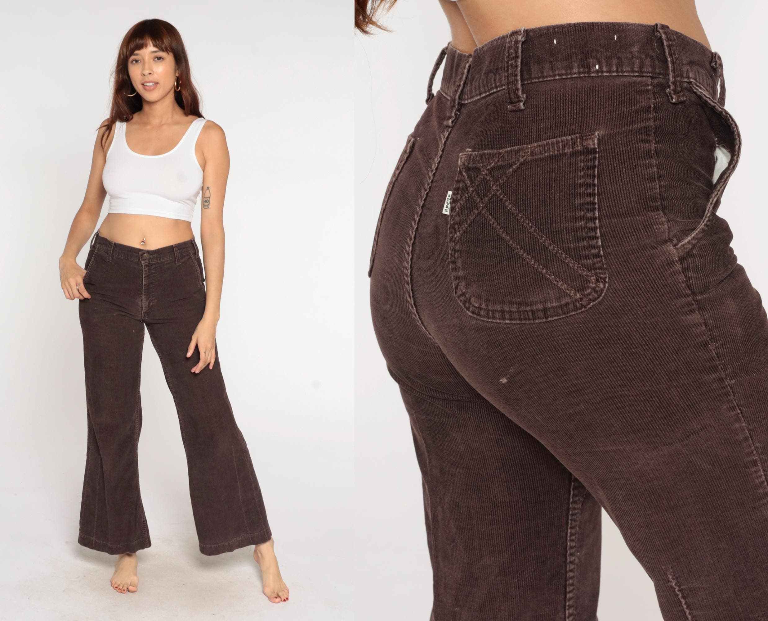 70s brown corduroy flared pants from Levi's with button fly closure and curved back pockets. Wide flared leg opening with classic bootcut silhouette.