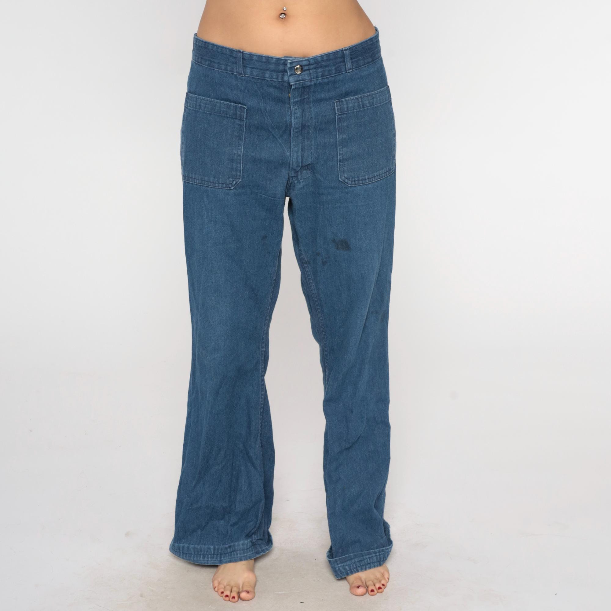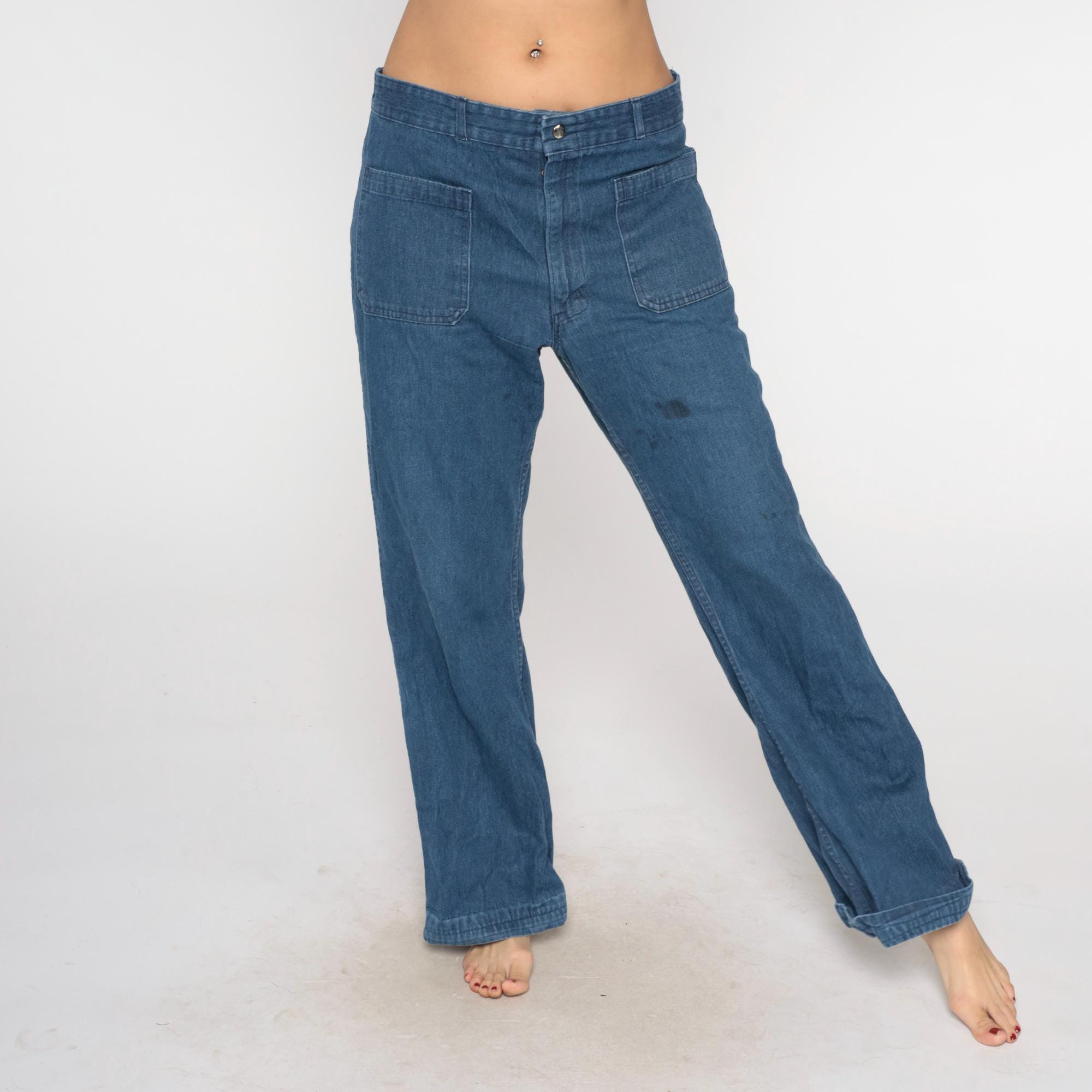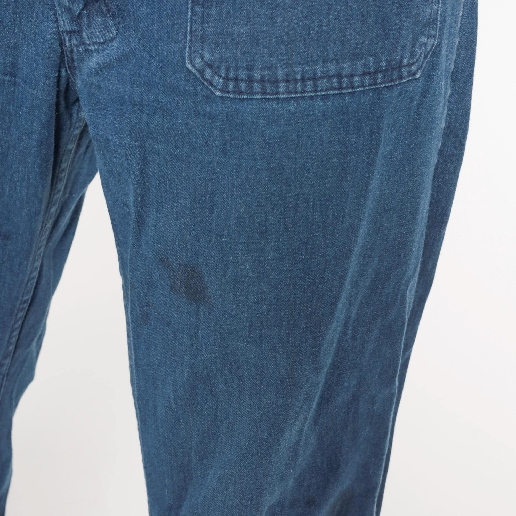 70s blue denim pants from Seafarer with straight wide leg cut and high rise waist. Front button and zip fly closure with two patch pockets at front, back patch pockets.