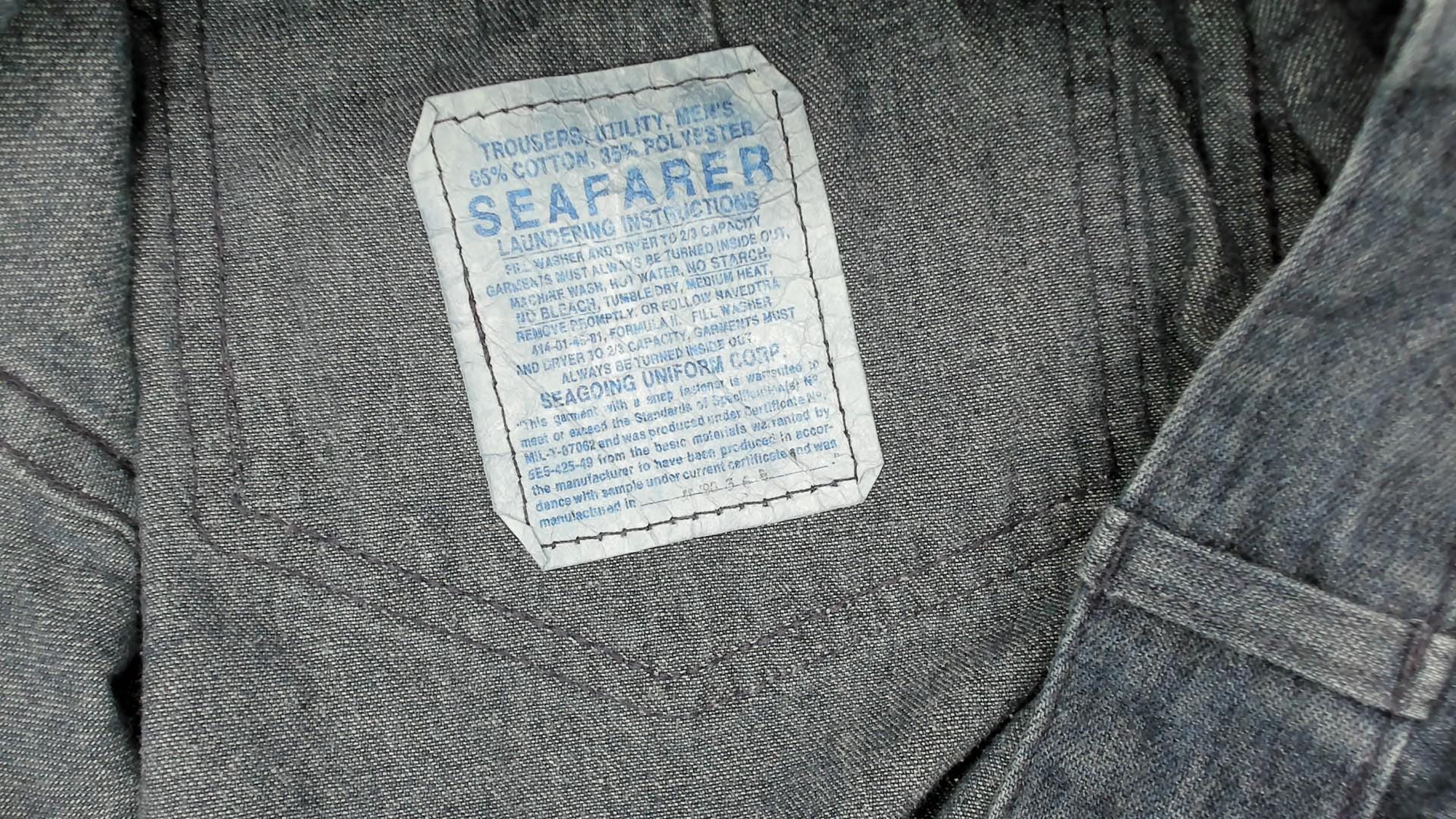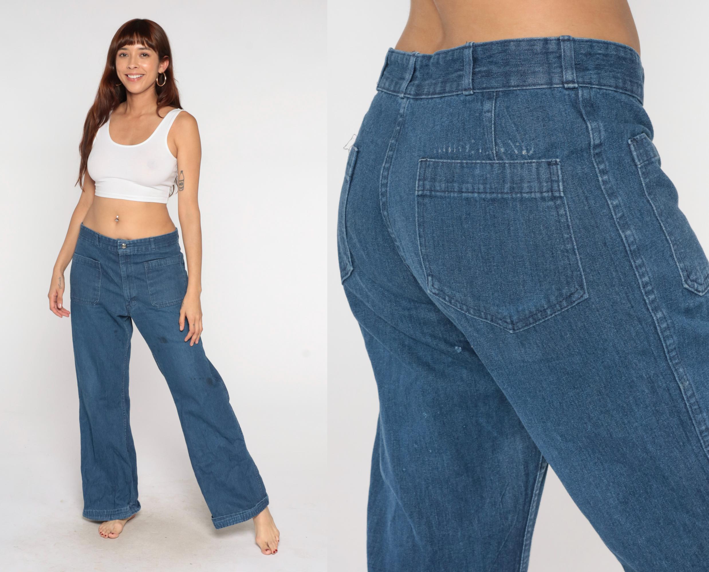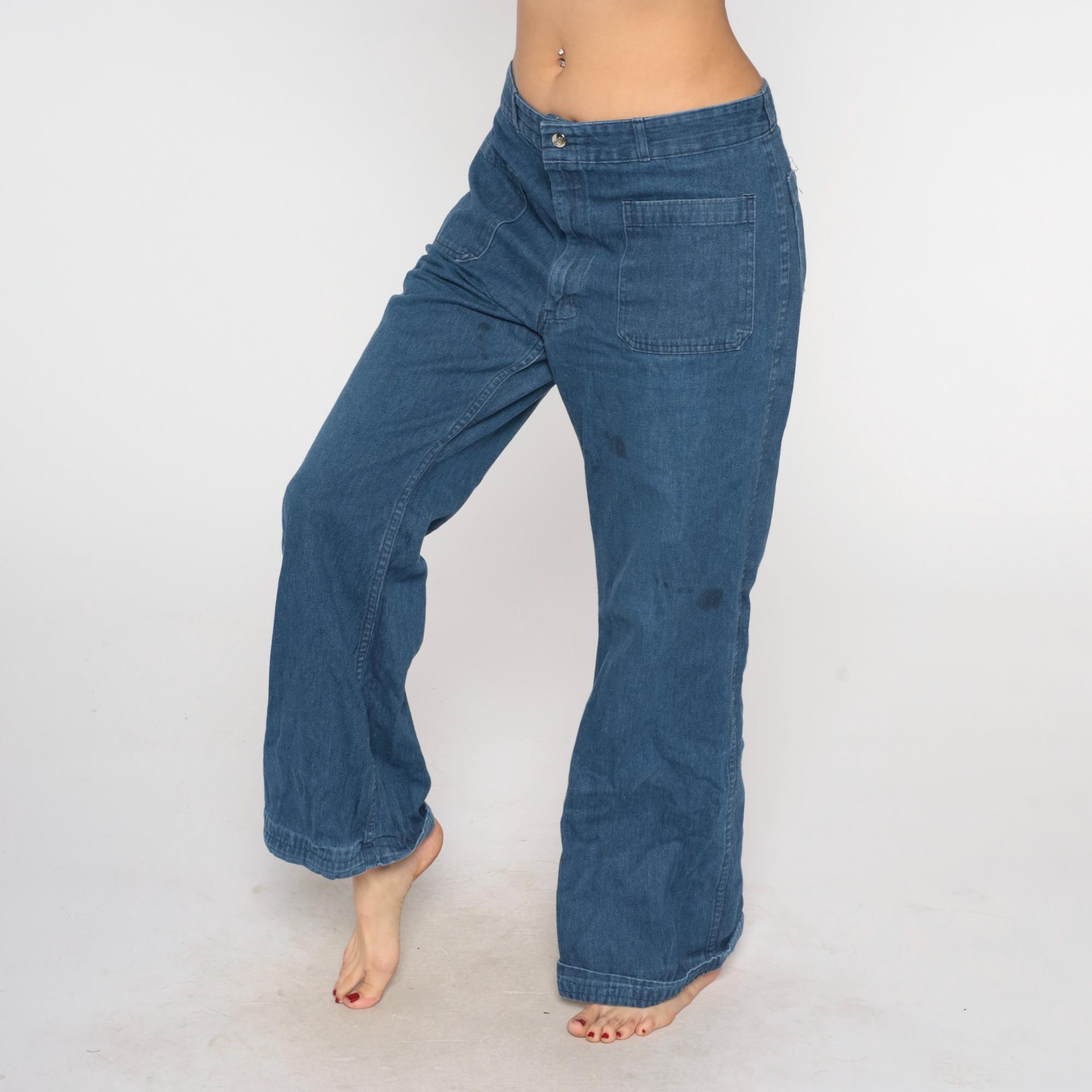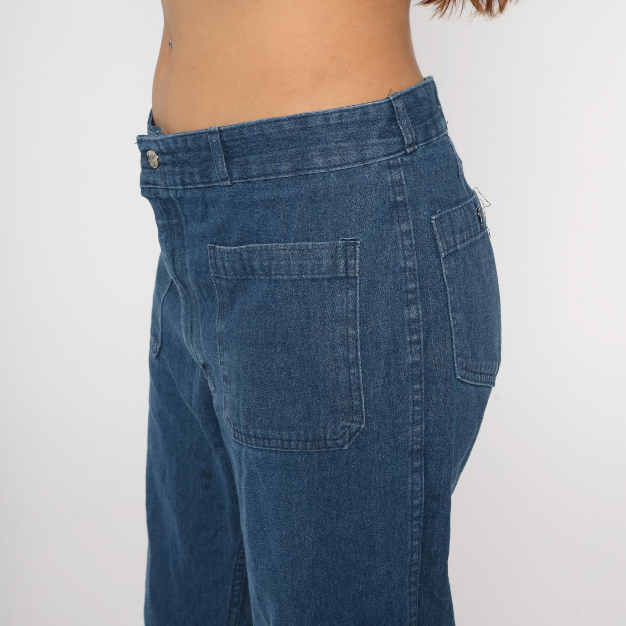 70s blue denim pants from Seafarer with straight wide leg cut and high rise waist. Front button and zip fly closure with two patch pockets at front, back patch pockets.