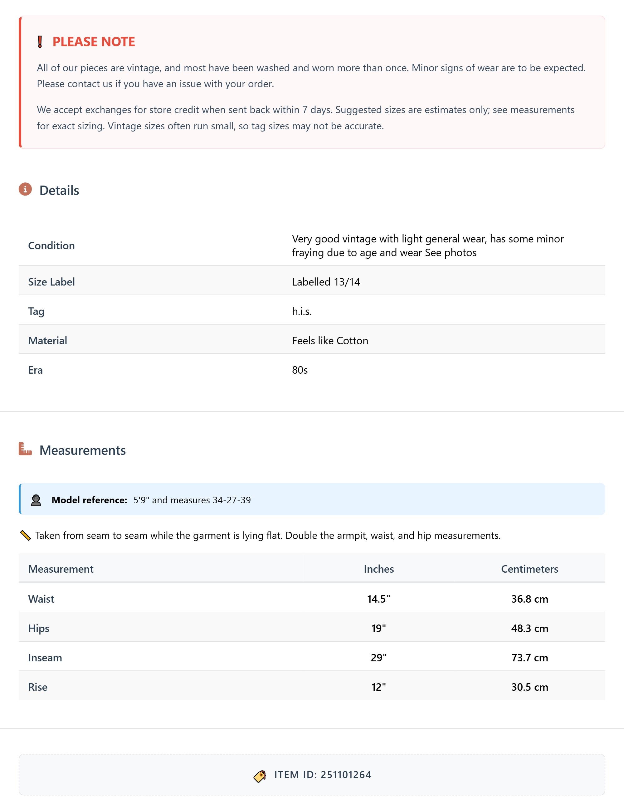 Vintage denim was usually made without any stretch, unlike modern jeans. Check the measurements to ensure proper fit, and remember to give yourself a little wiggle room in the waist and hips, depending on your preferred fit.