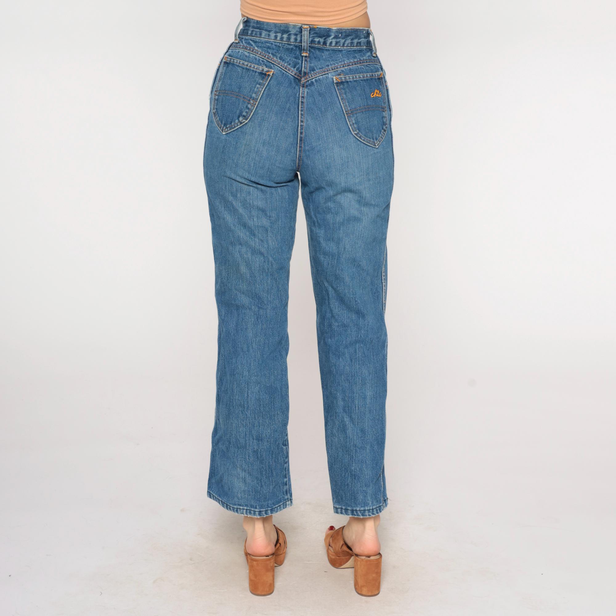 80s high-waisted straight leg jeans from h.i.s in medium blue denim with worn, faded finish. Orange "chic" embroidered script logo on back pocket with scalloped pocket design. Five-pocket styling with zipper fly and button closure.