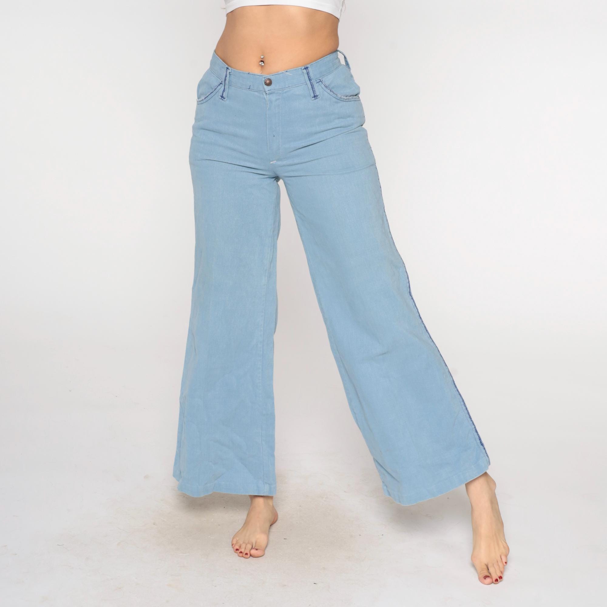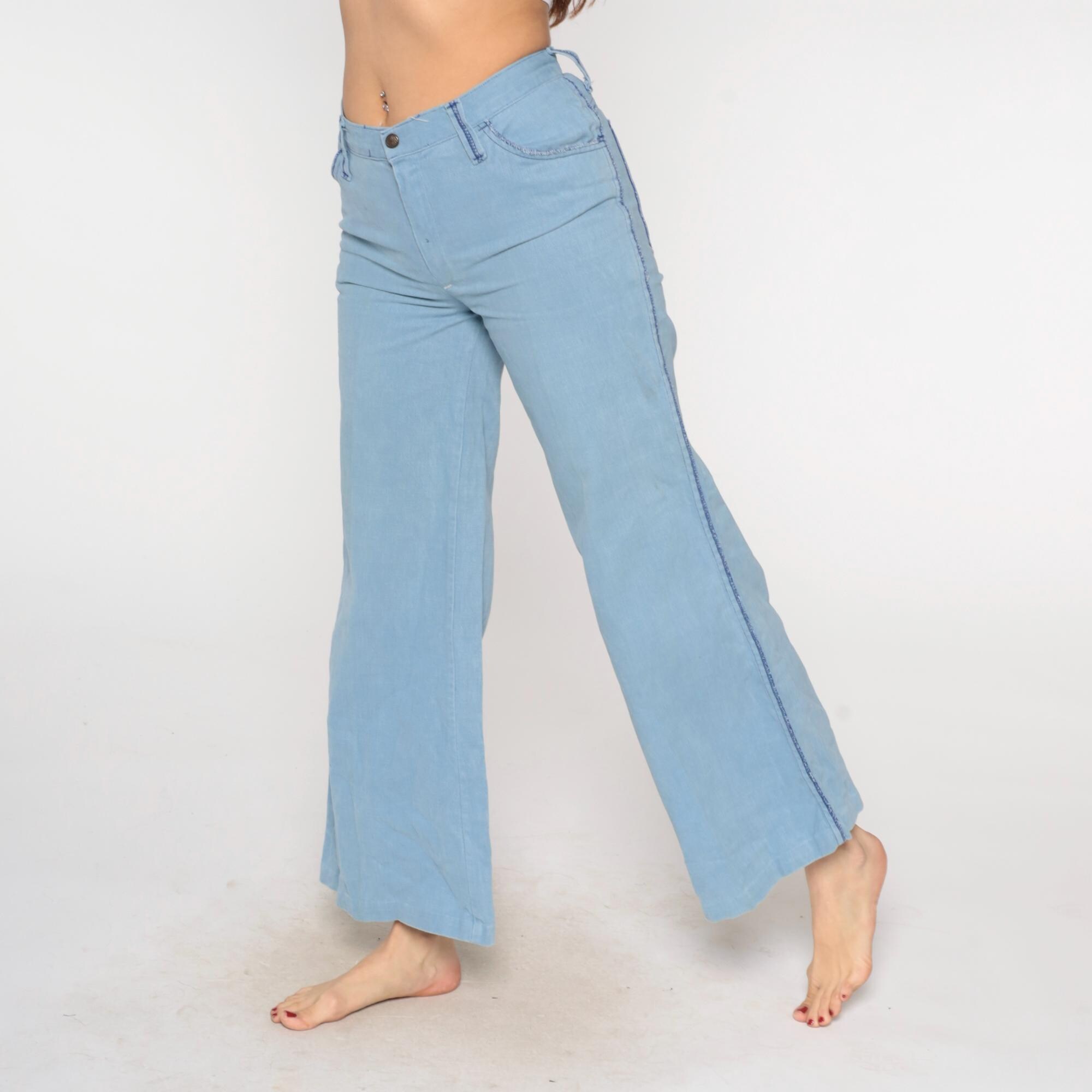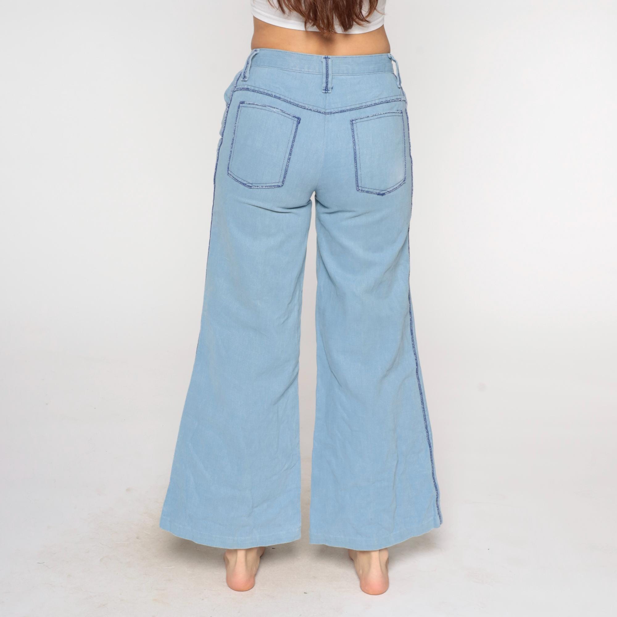 80s light blue wide-leg jeans from Sears Jr Bazaar with five-pocket styling and blue contrast stitching along all seams. Button and zipper fly closure, two back patch pockets, flared leg opening.