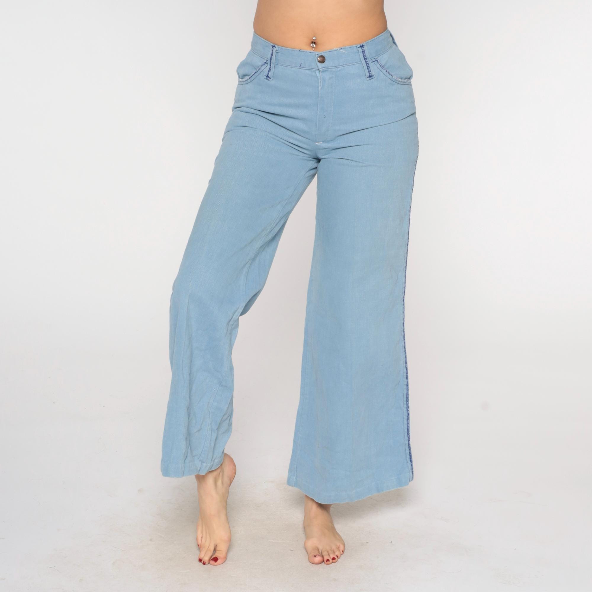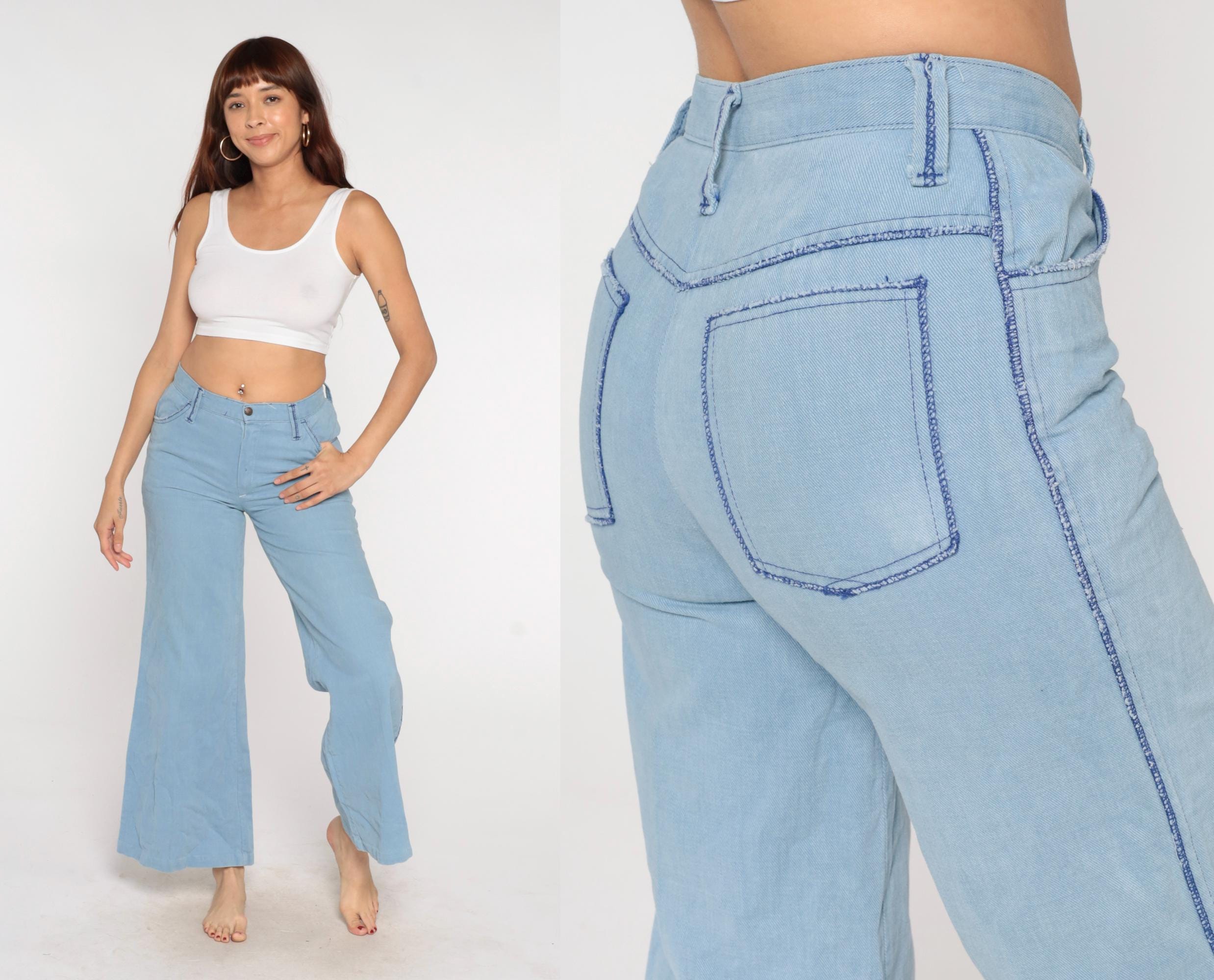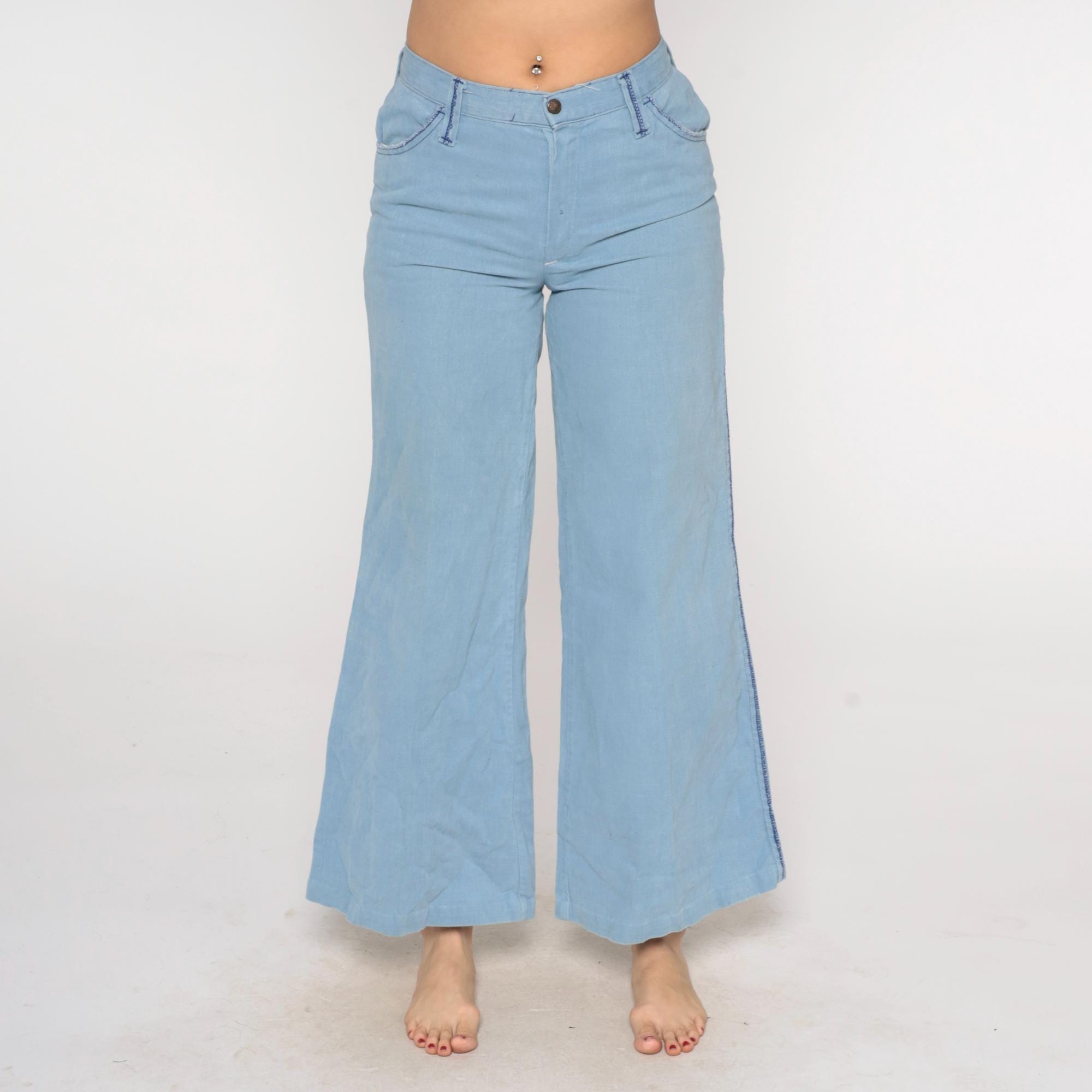 80s light blue wide-leg jeans from Sears Jr Bazaar with five-pocket styling and blue contrast stitching along all seams. Button and zipper fly closure, two back patch pockets, flared leg opening.