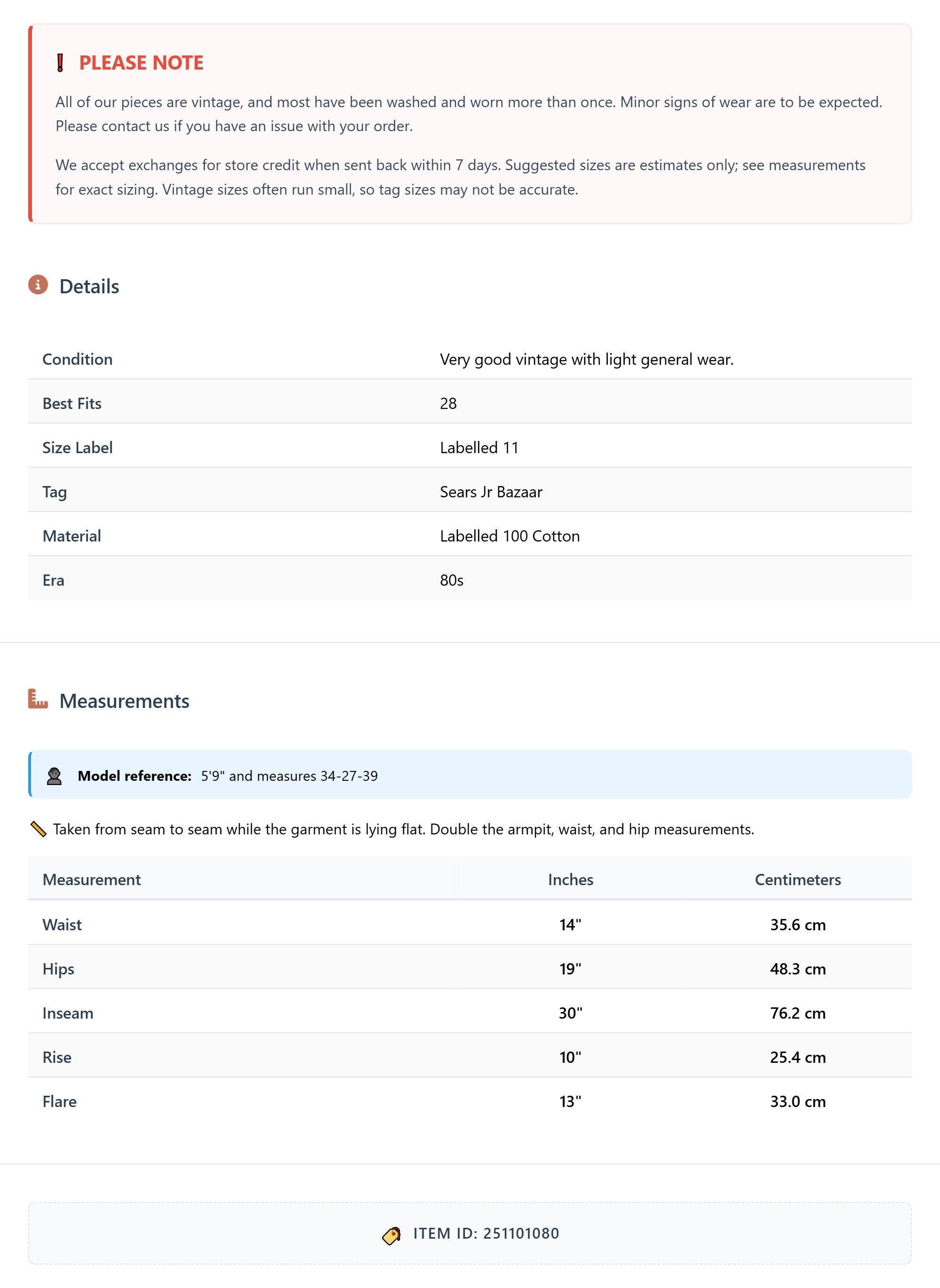 Vintage denim was usually made without any stretch, unlike modern jeans. Check the measurements to ensure proper fit, and remember to give yourself a little wiggle room in the waist and hips, depending on your preferred fit.