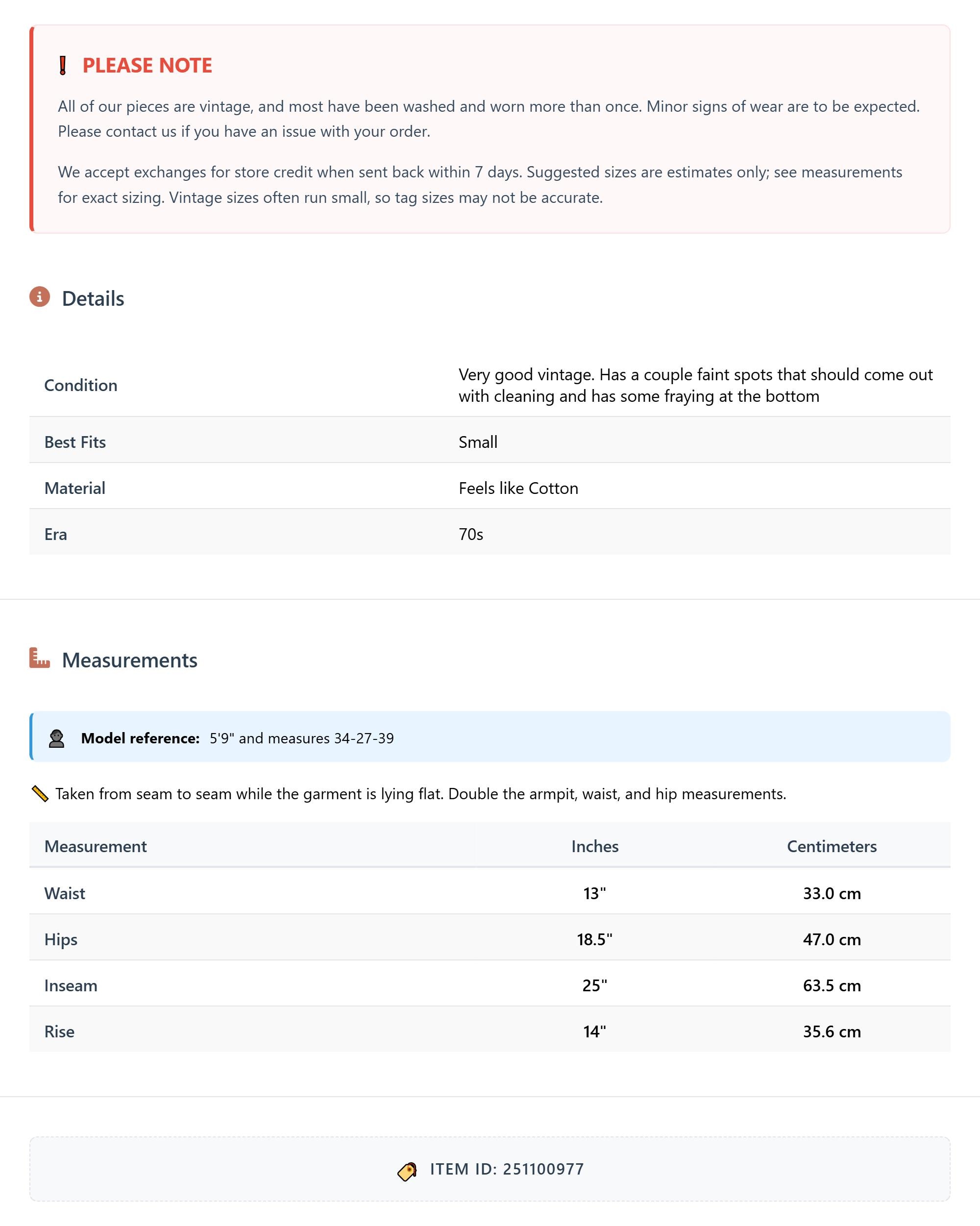 All of our pieces are vintage, and most have been washed and worn more than once. Minor signs of wear are to be expected. Please contact us if you have an issue with your order. We accept exchanges for store credit when sent back within 7 days.