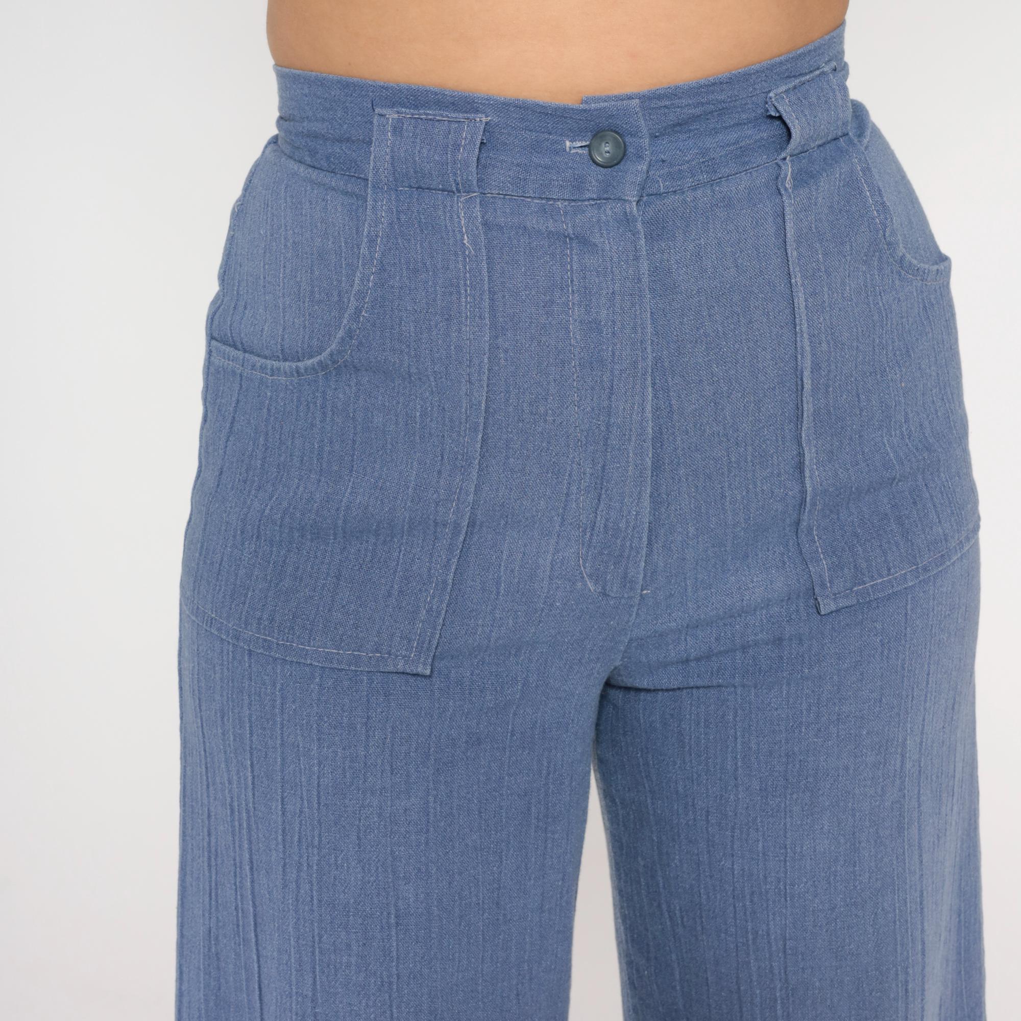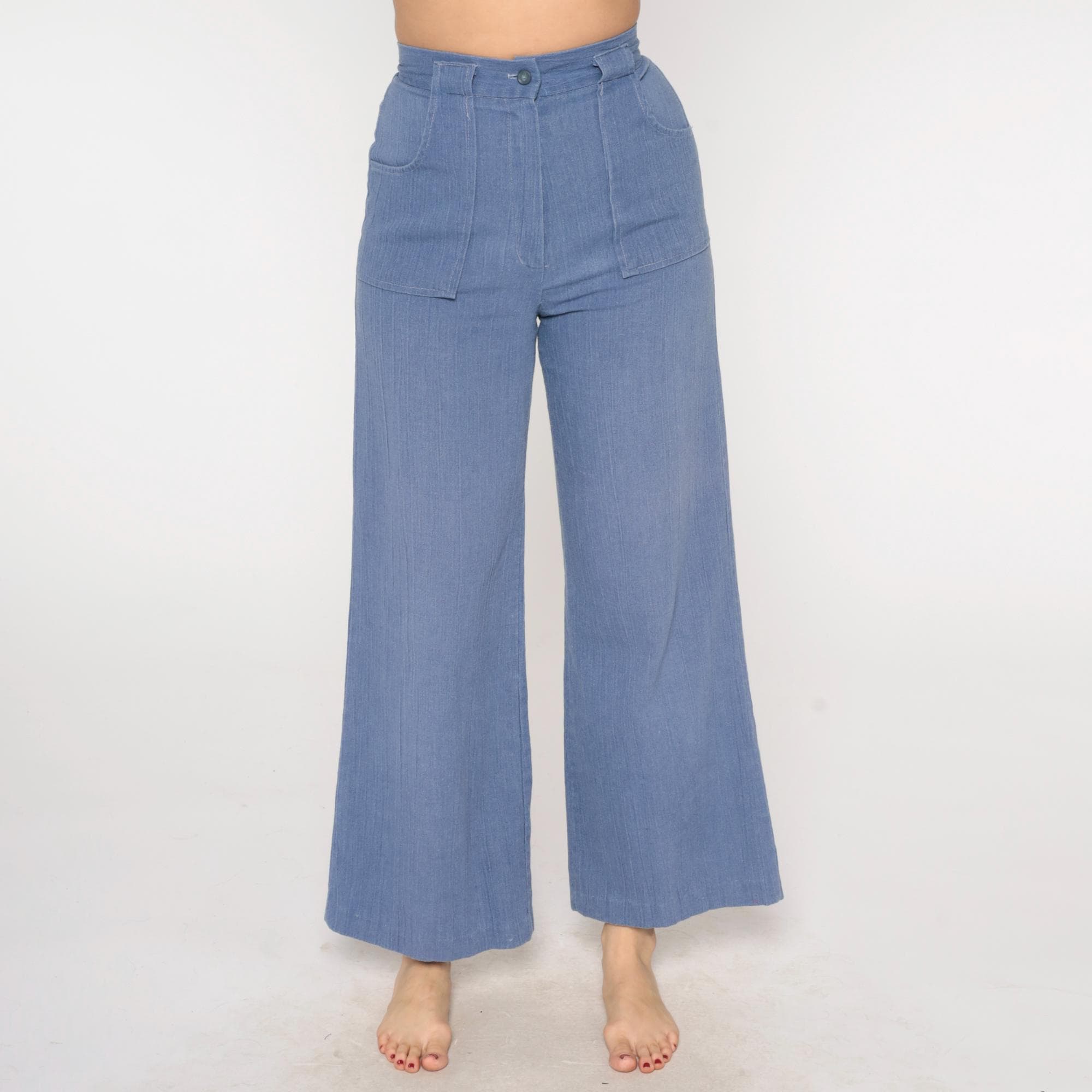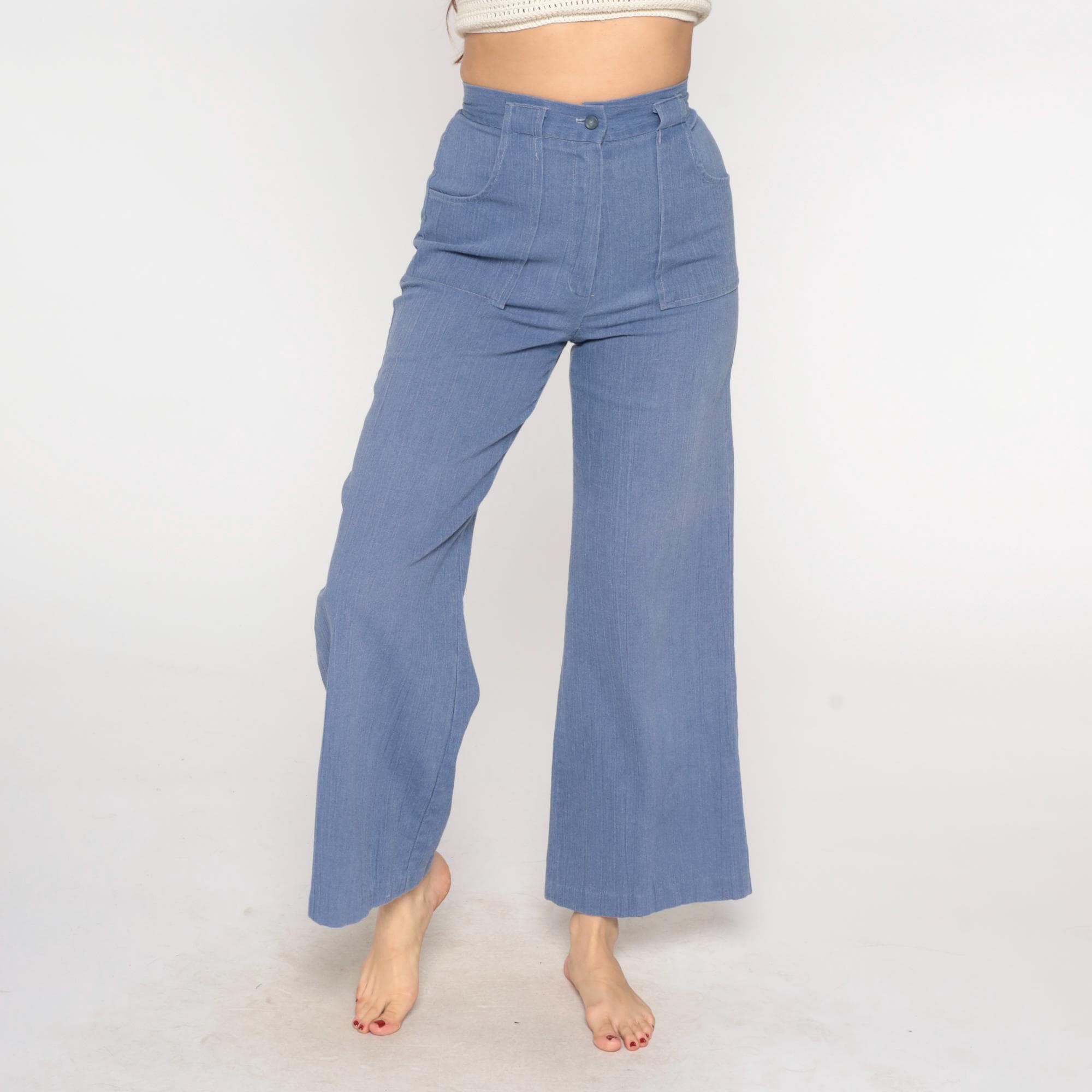 70s periwinkle blue wide leg pants with high waist . Button and zipper front closure, belt loops, side pockets. Subtle vertical stripe texture throughout fabric.