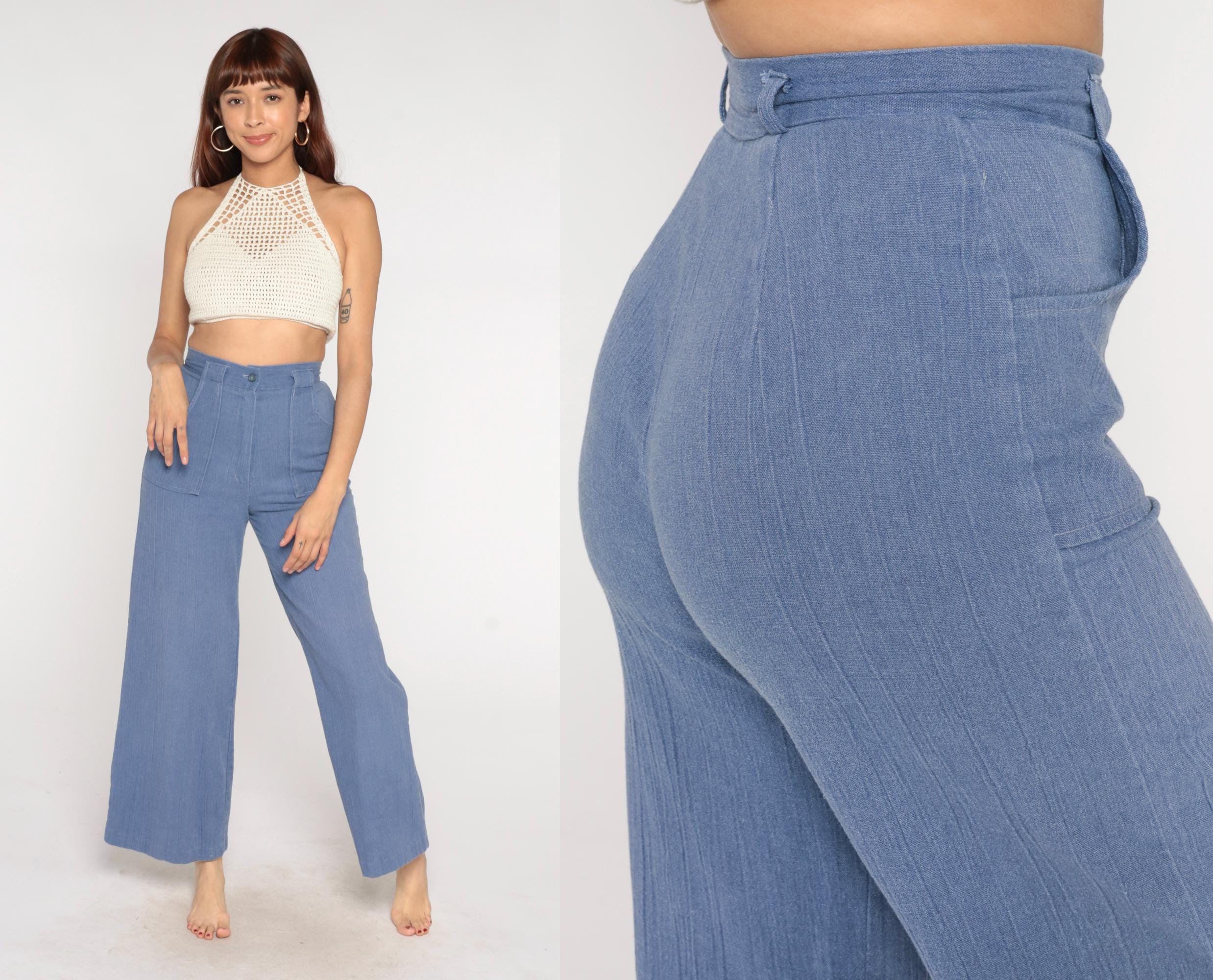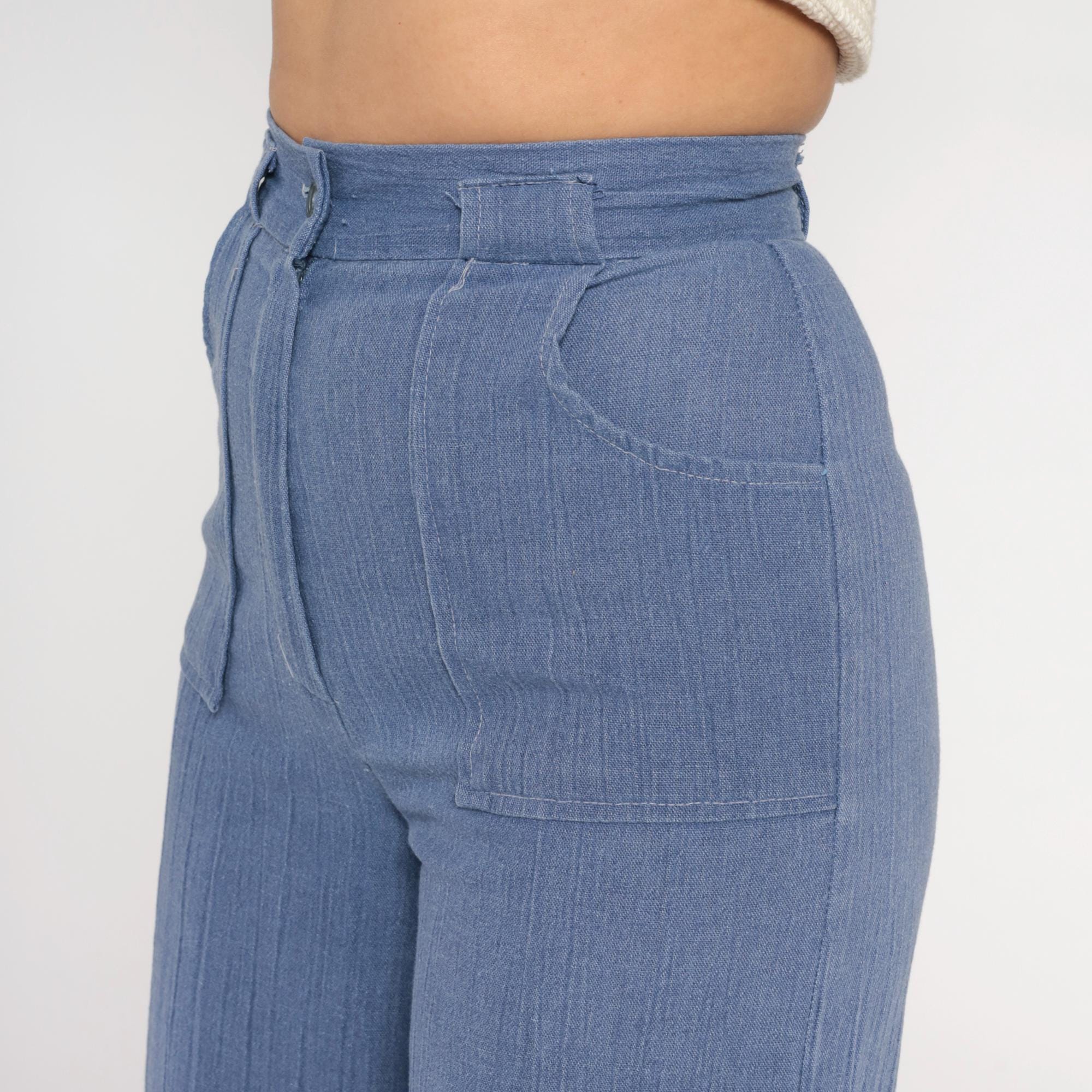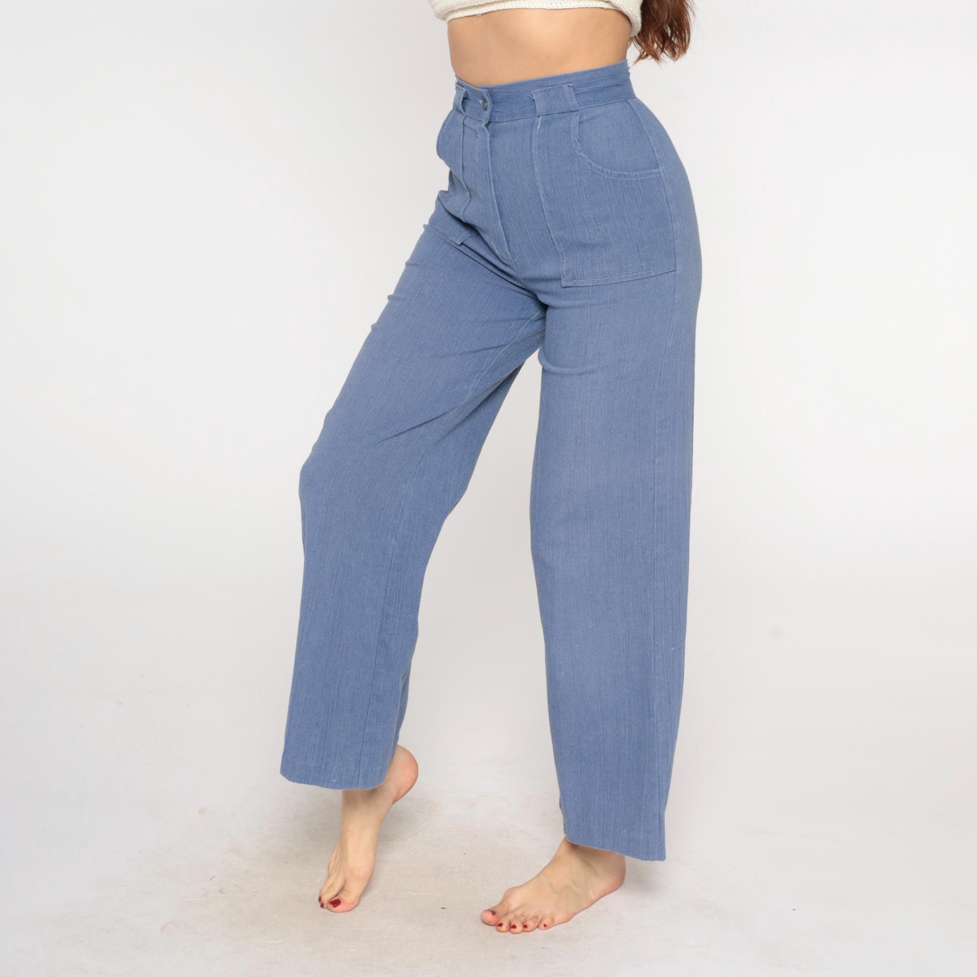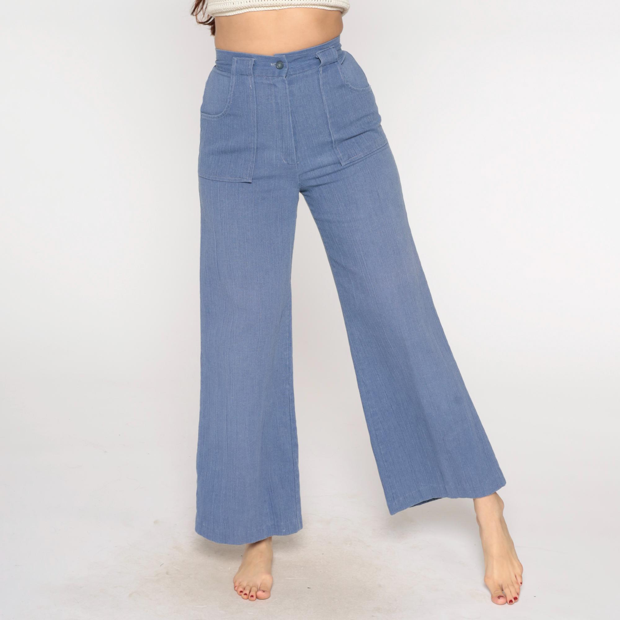 70s periwinkle blue wide leg pants with high waist . Button and zipper front closure, belt loops, side pockets. Subtle vertical stripe texture throughout fabric.