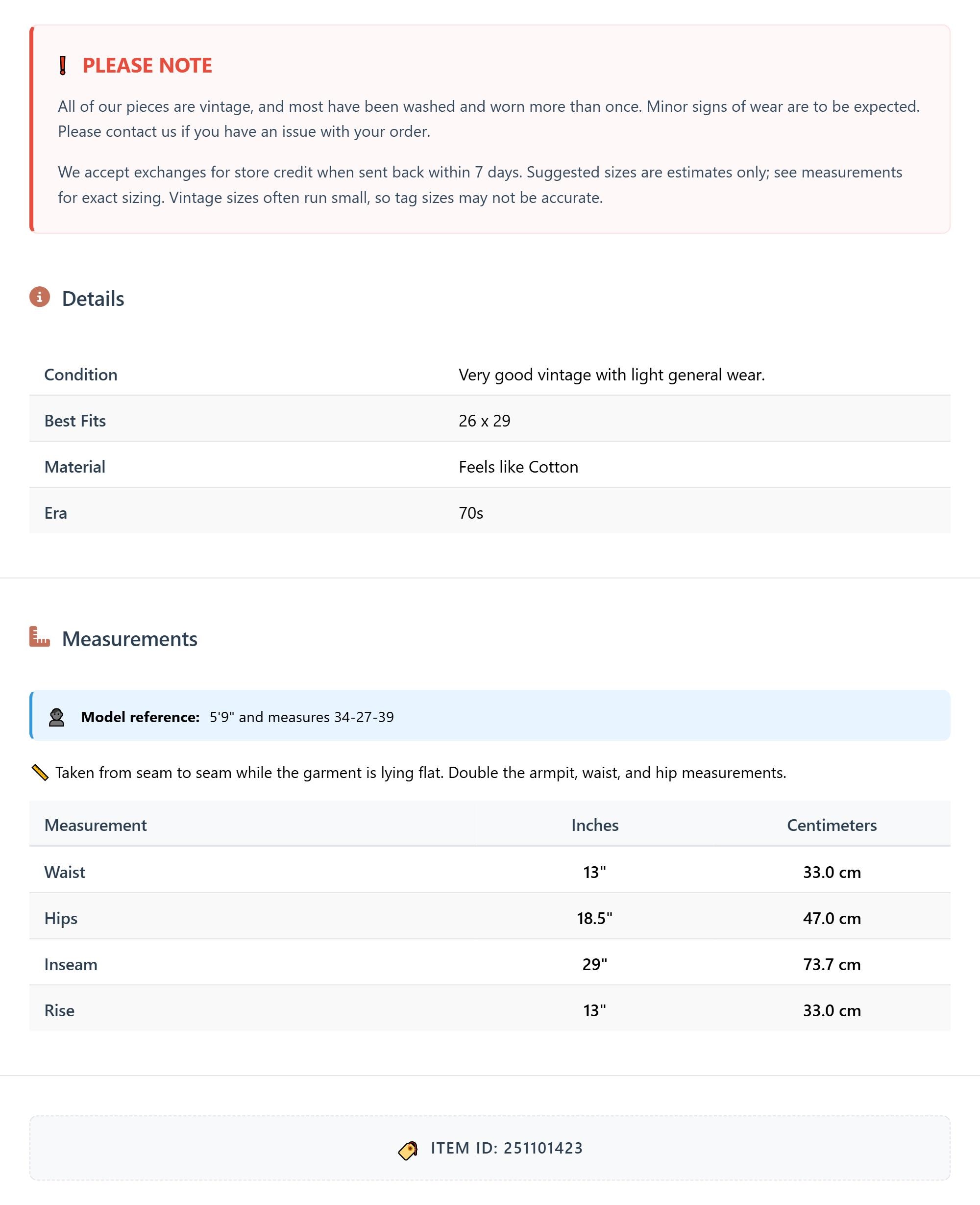 Vintage denim was usually made without any stretch, unlike modern jeans. Check the measurements to ensure proper fit, and remember to give yourself a little wiggle room in the waist and hips, depending on your preferred fit.