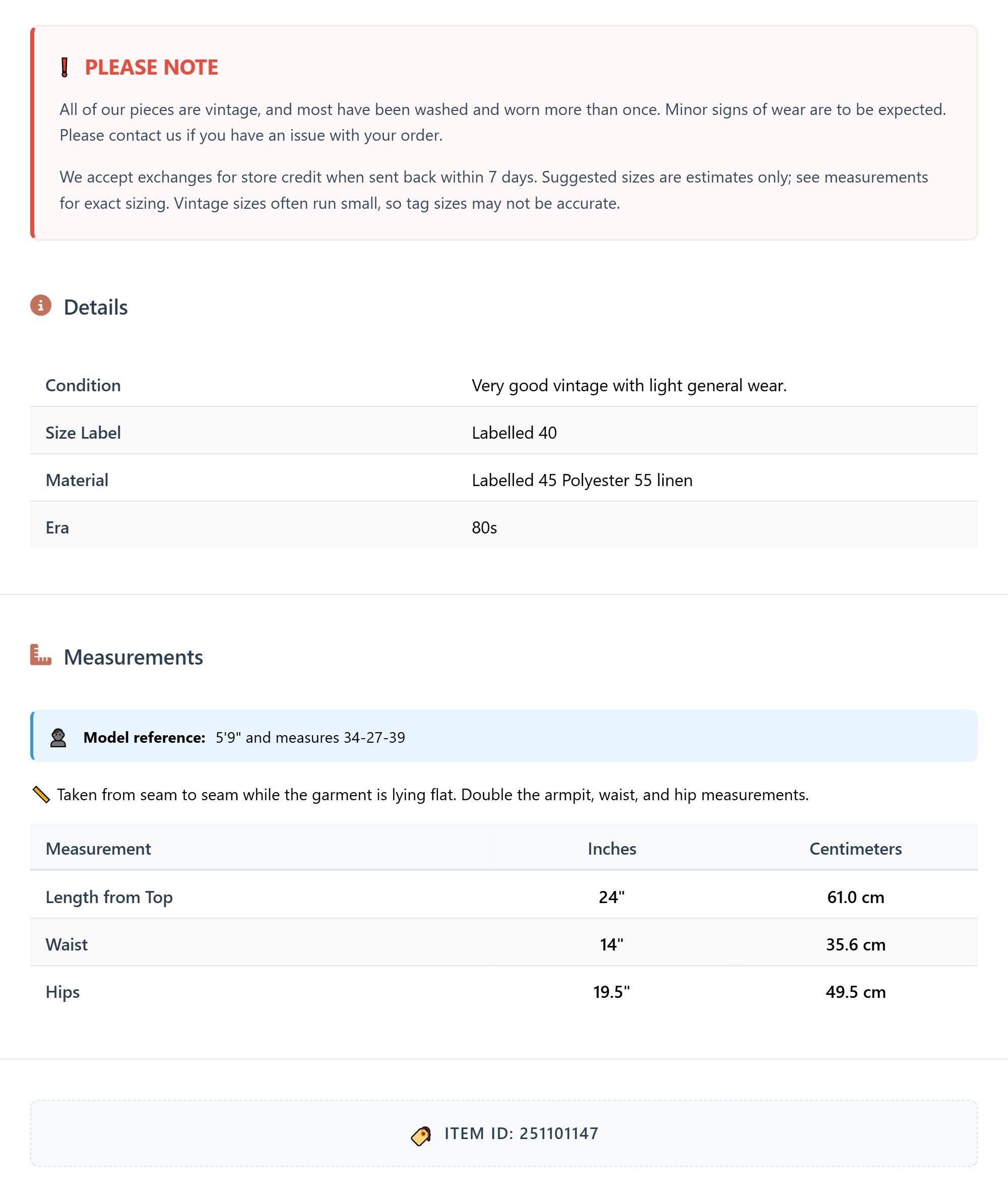 All of our pieces are vintage, and most have been washed and worn more than once. Minor signs of wear are to be expected. Please contact us if you have an issue with your order. We accept exchanges for store credit when sent back within 7 days.