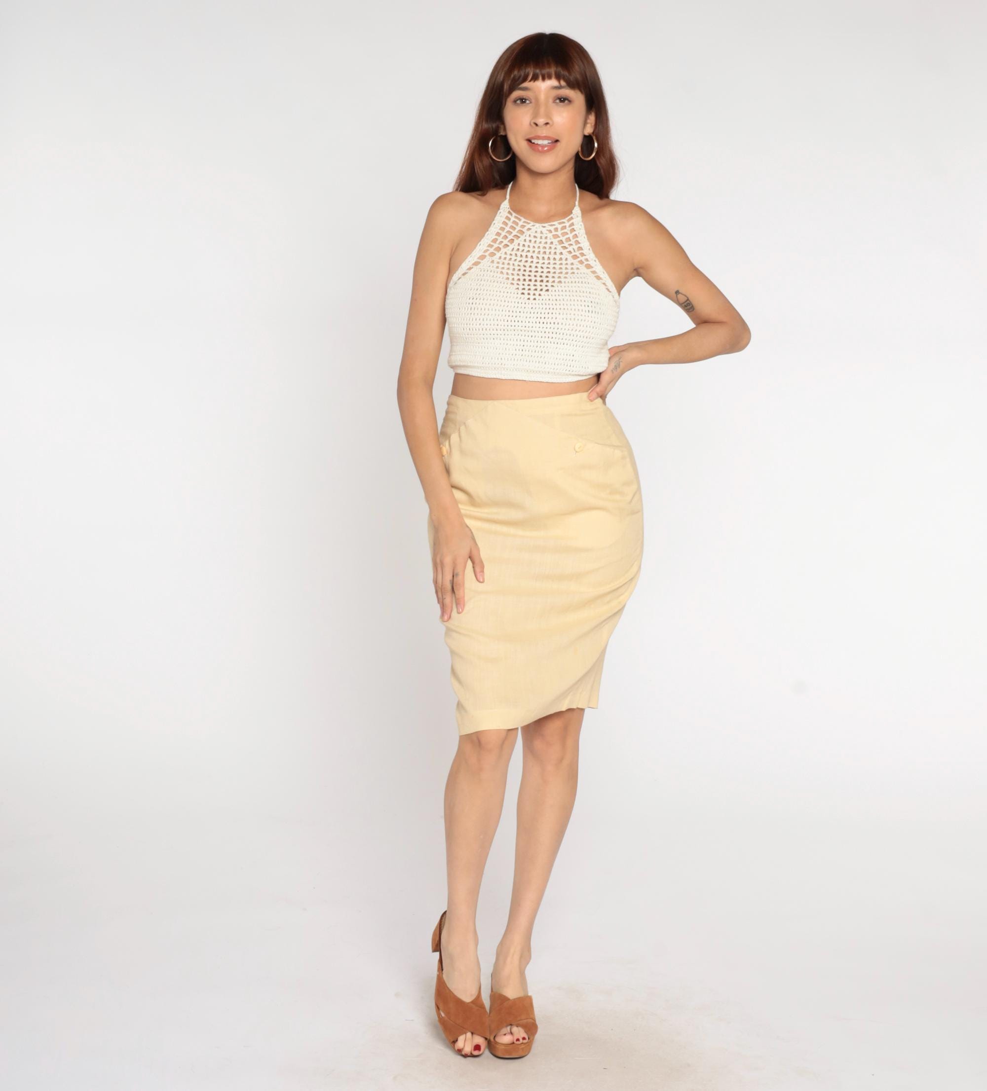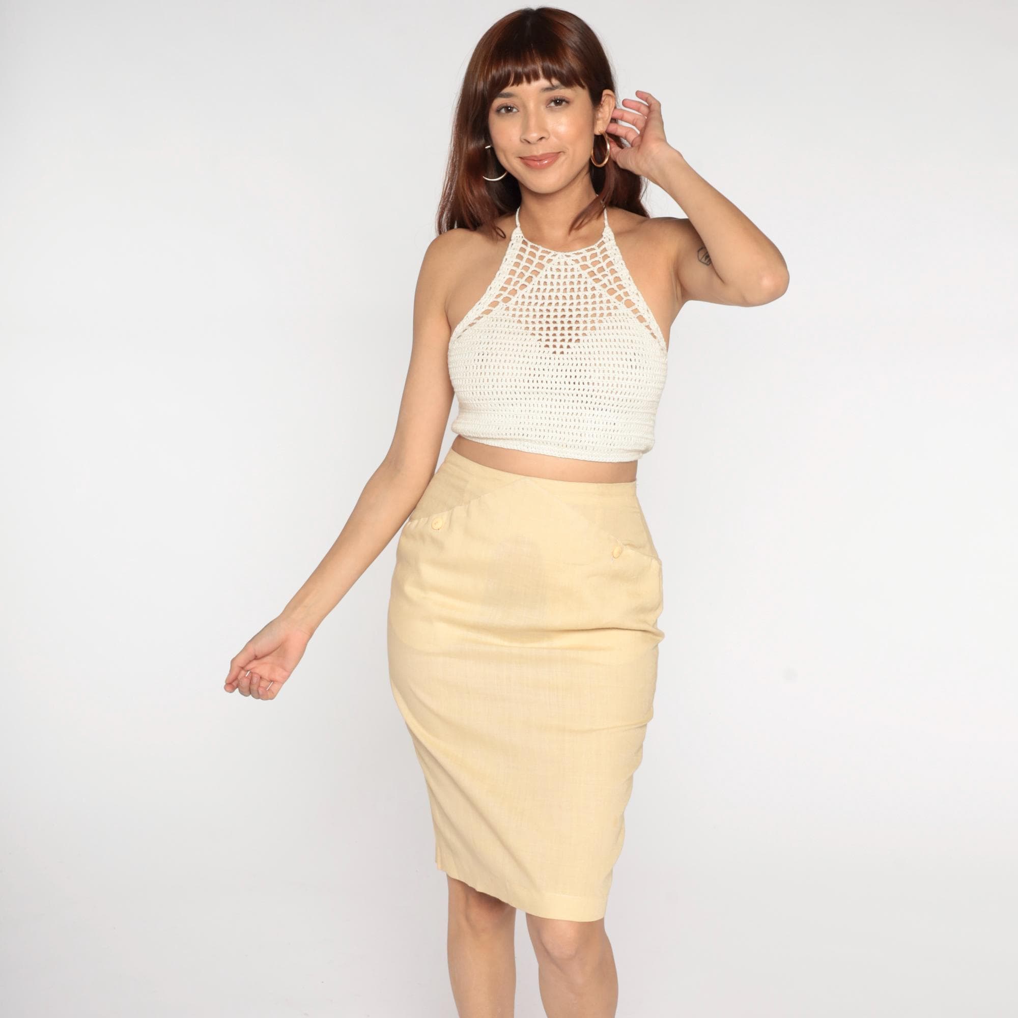 80s pale yellow pencil skirt with high waist and straight silhouette. Two decorative buttons at front hip, back zip closure with back vent at hem.