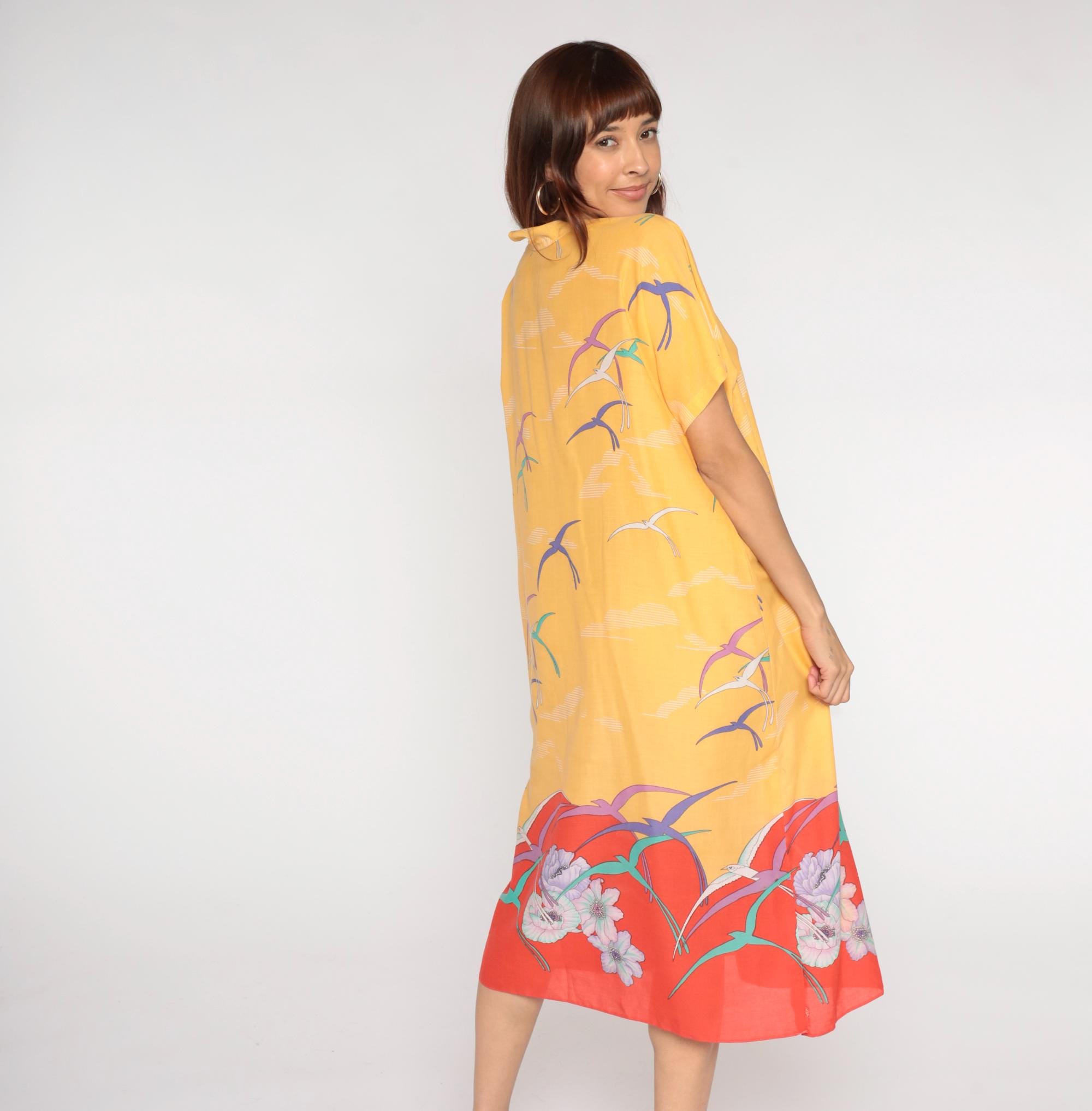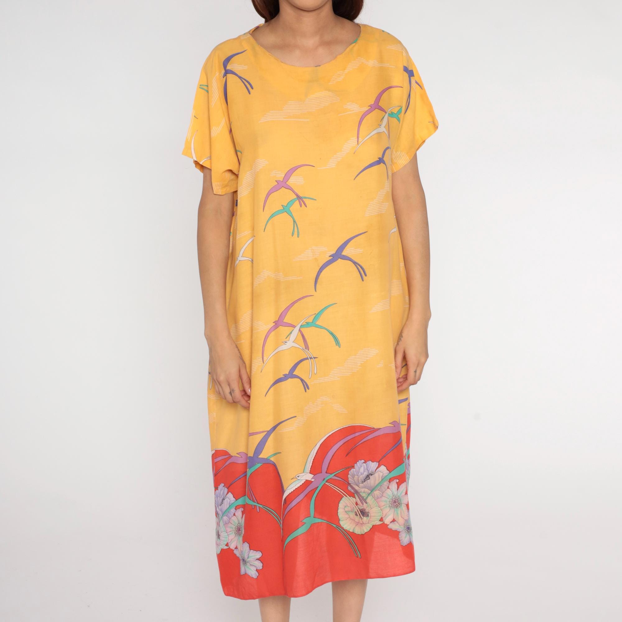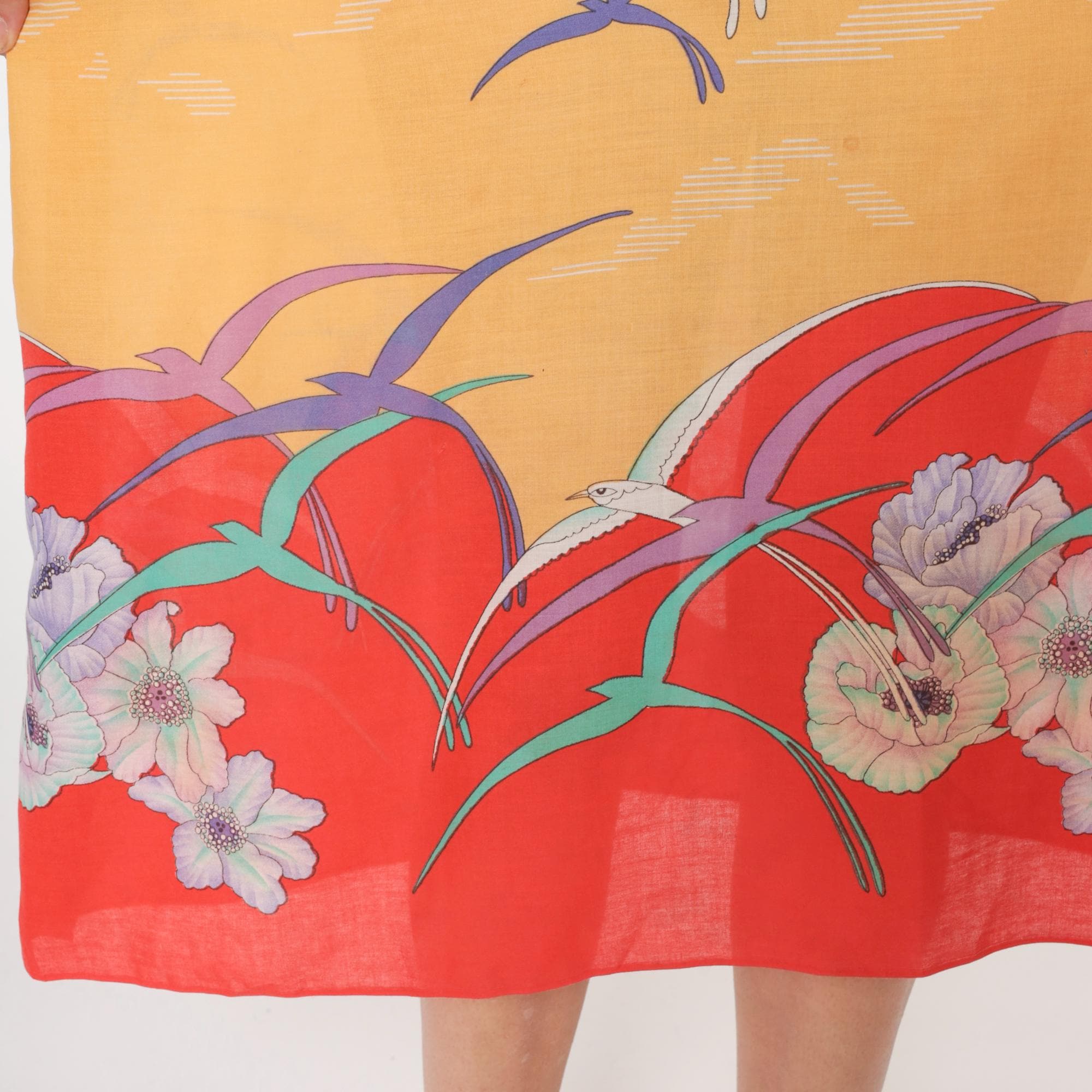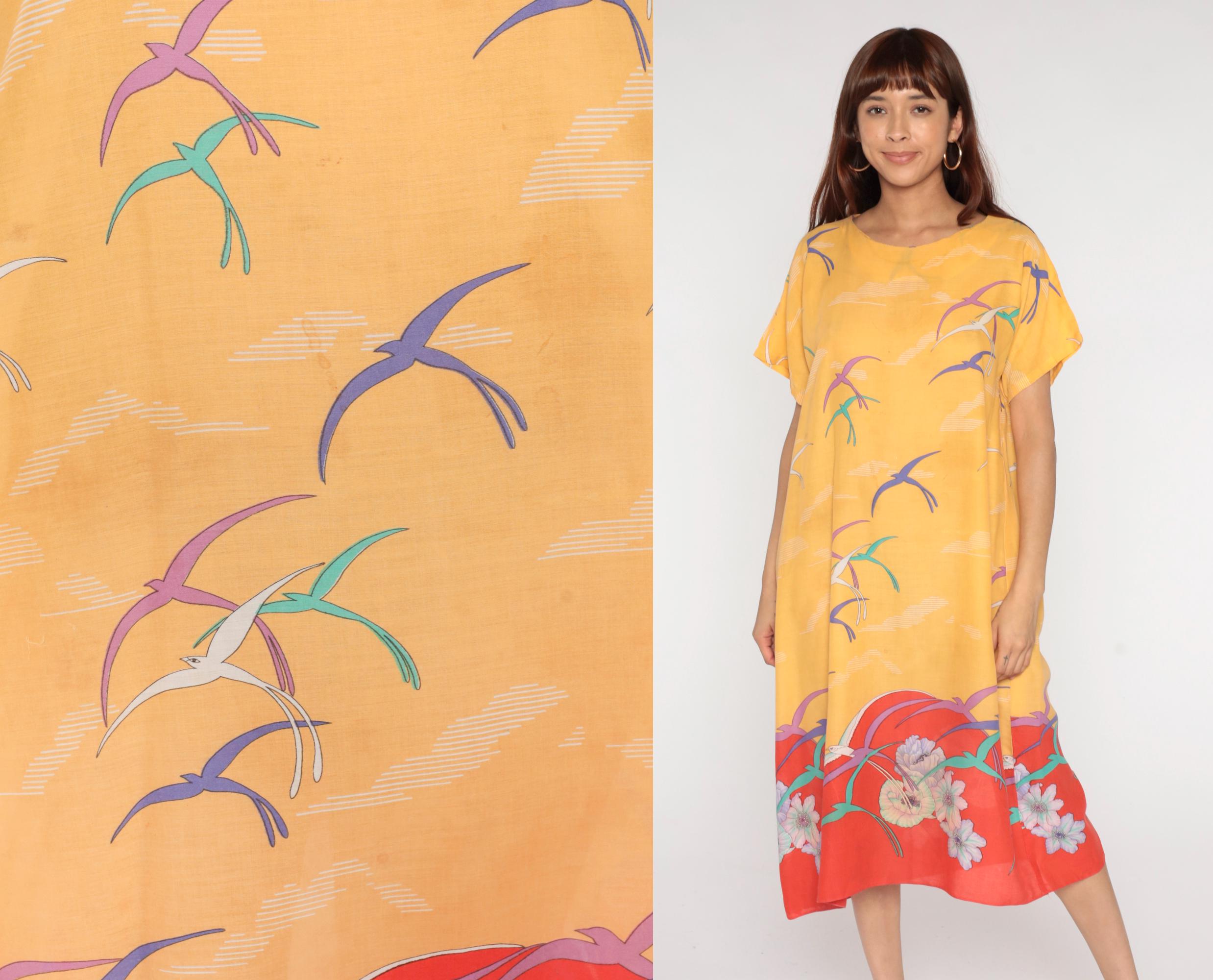 80s yellow shift dress with birds in flight print across the body and floral border at the hem. Purple, blue, turquoise, and white outlined birds scattered across golden yellow fabric with horizontal white line pattern suggesting clouds or wind. Red, coral, and orange bottom section features white, purple, and pink flowers with turquoise and green leaves.