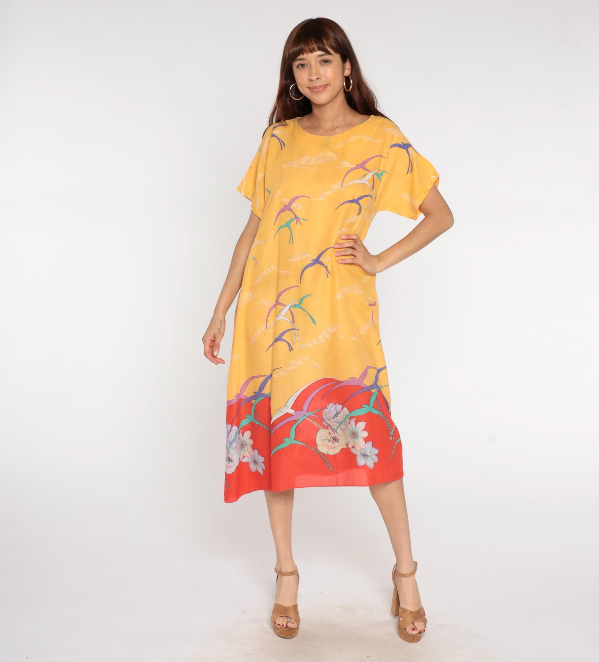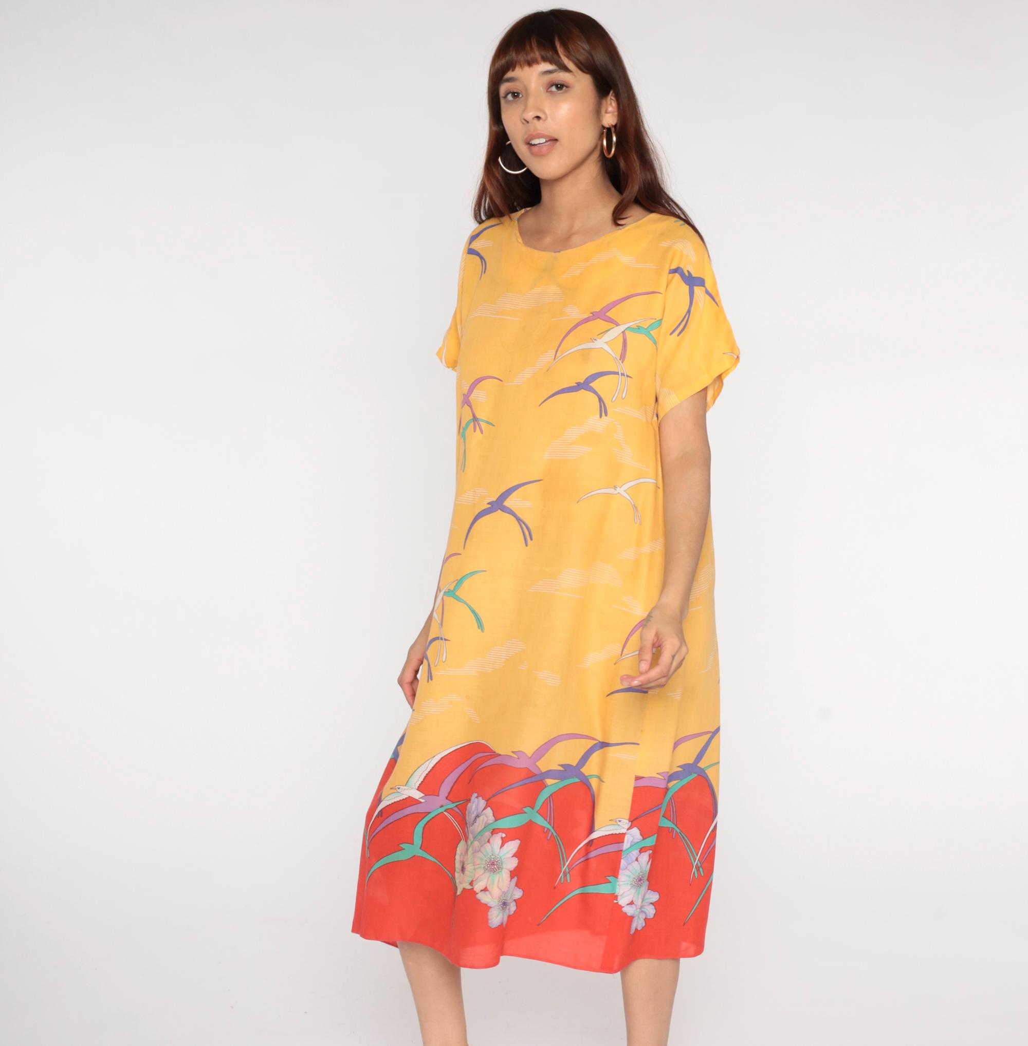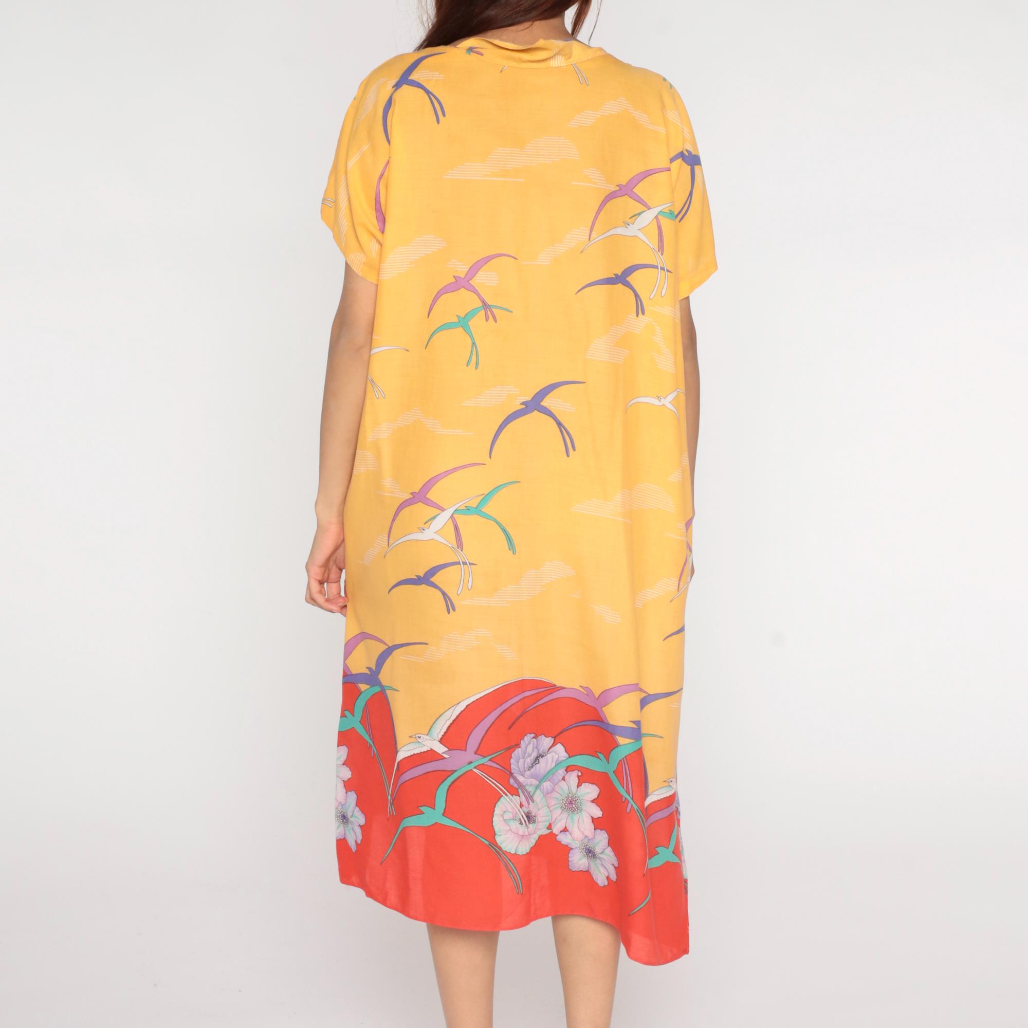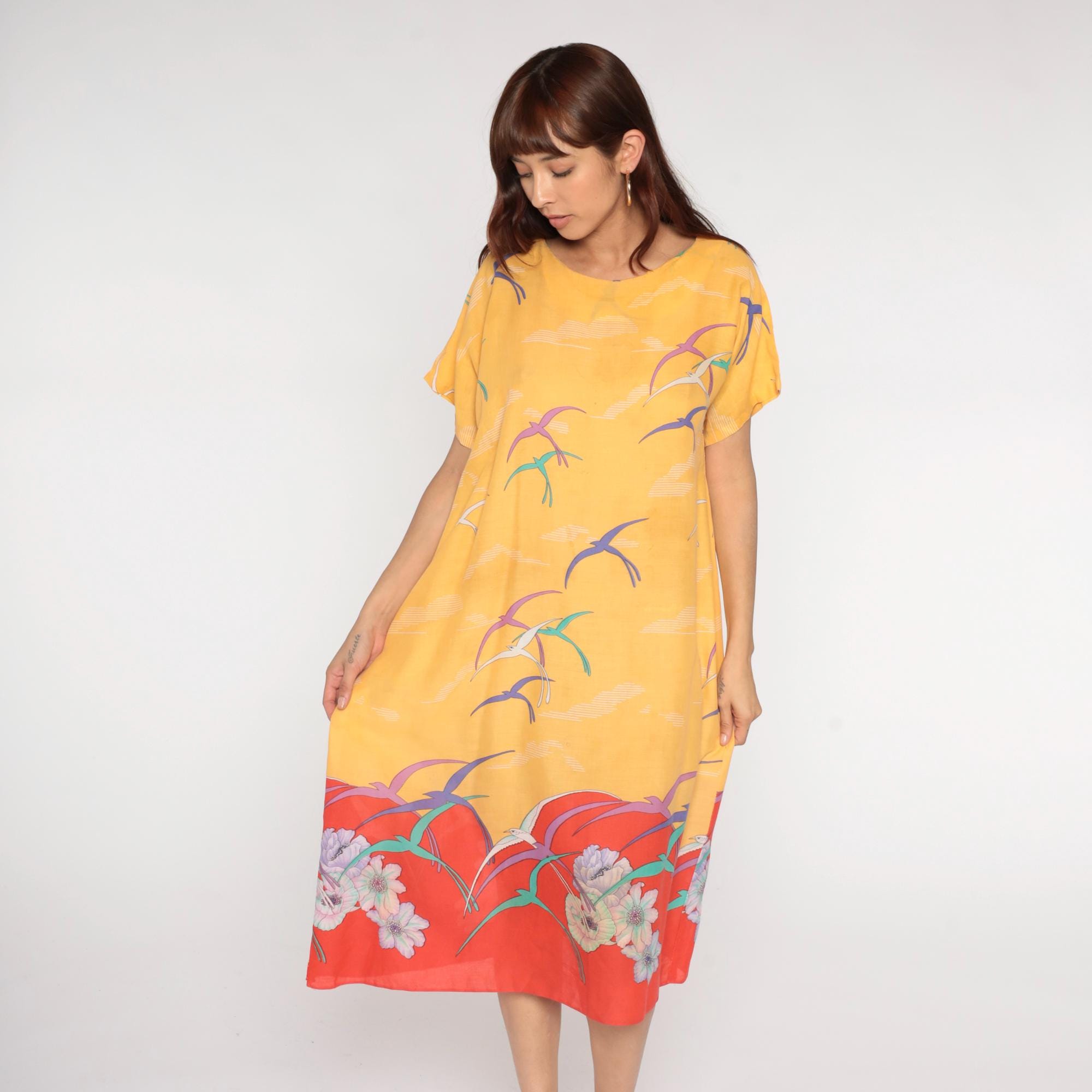 80s yellow shift dress with birds in flight print across the body and floral border at the hem. Purple, blue, turquoise, and white outlined birds scattered across golden yellow fabric with horizontal white line pattern suggesting clouds or wind. Red, coral, and orange bottom section features white, purple, and pink flowers with turquoise and green leaves.