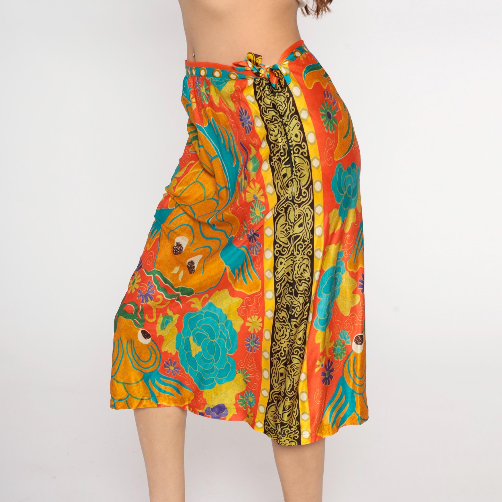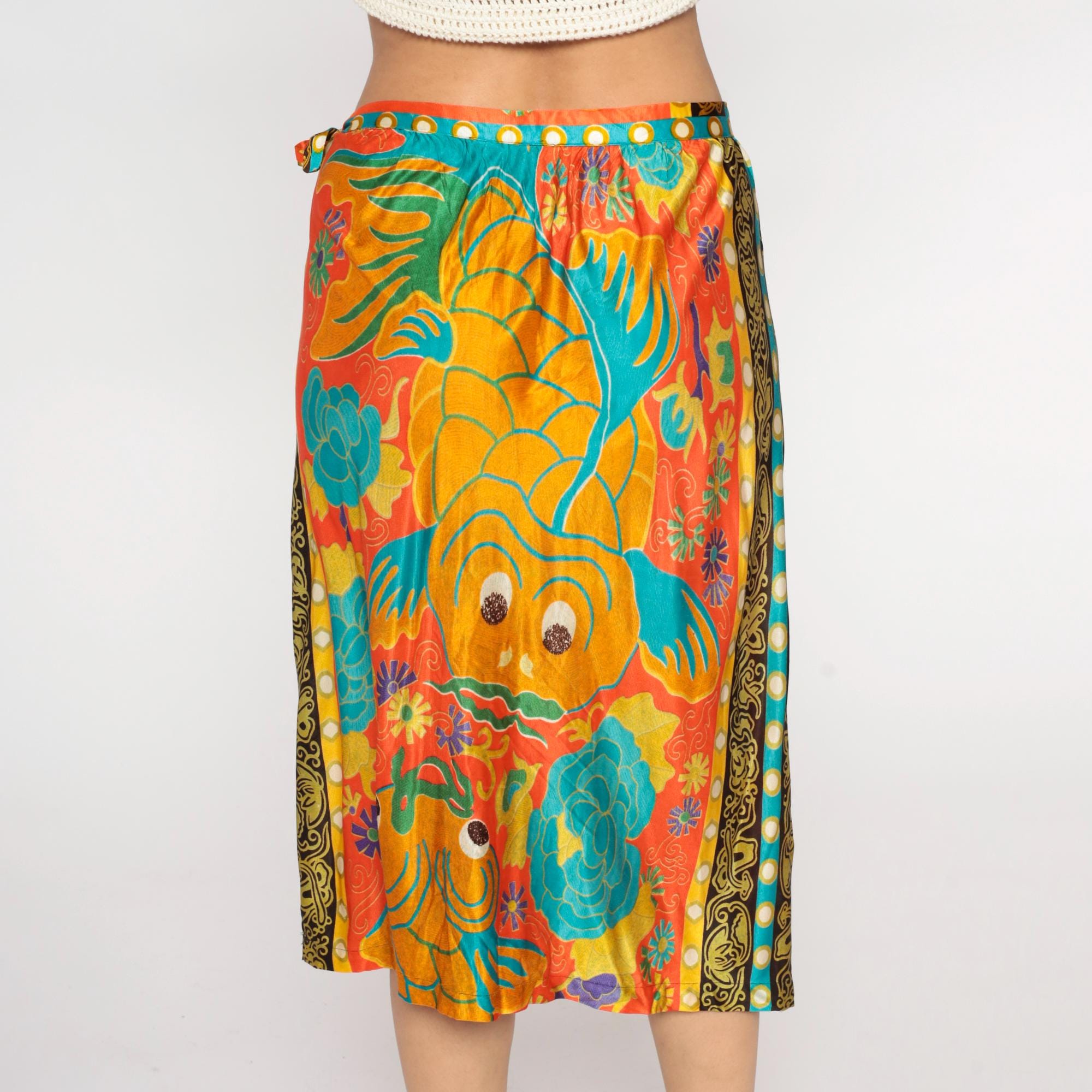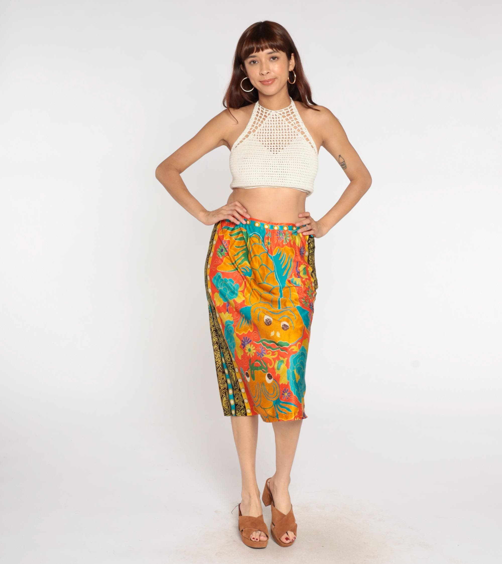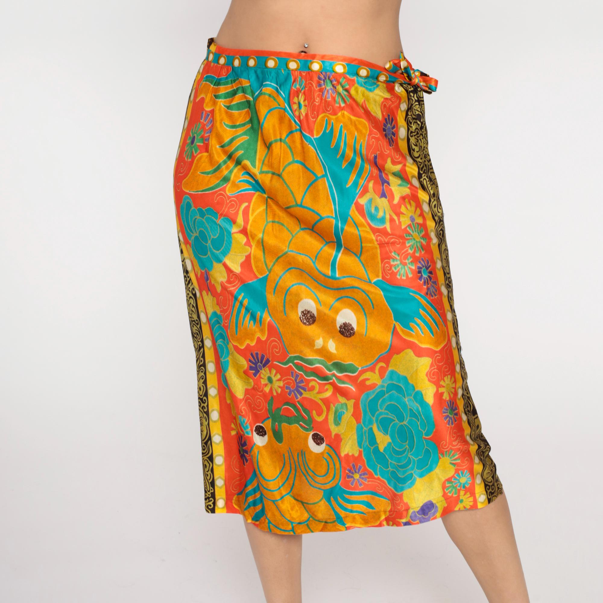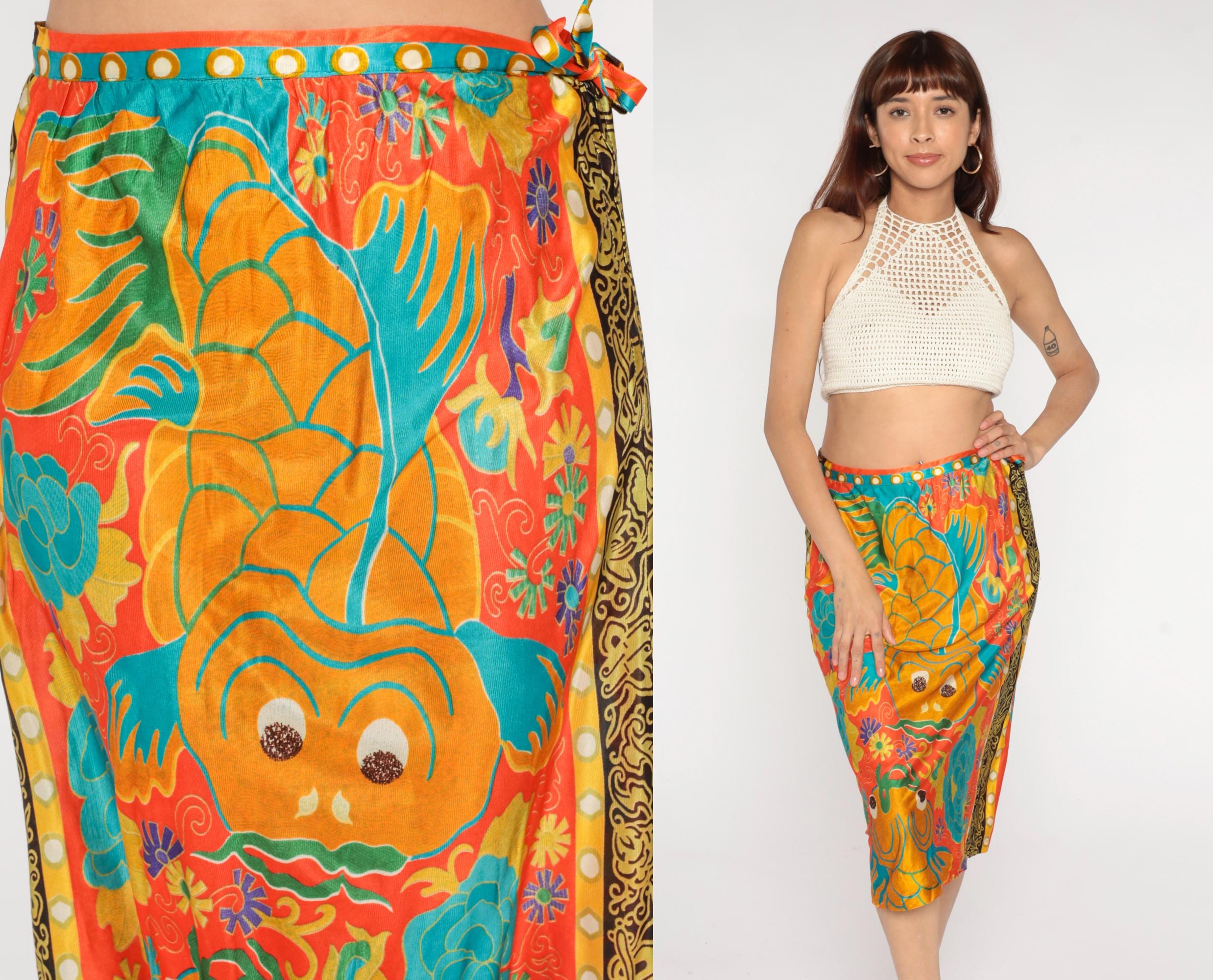 70s wrap skirt in psychedelic multicolored print with large decorative face designs, abstract florals, and swirling patterns across orange, turquoise, yellow, red, and green fabric. Side tie closure, contrast border trim with ornate black and yellow pattern, white dot detail on waistband.