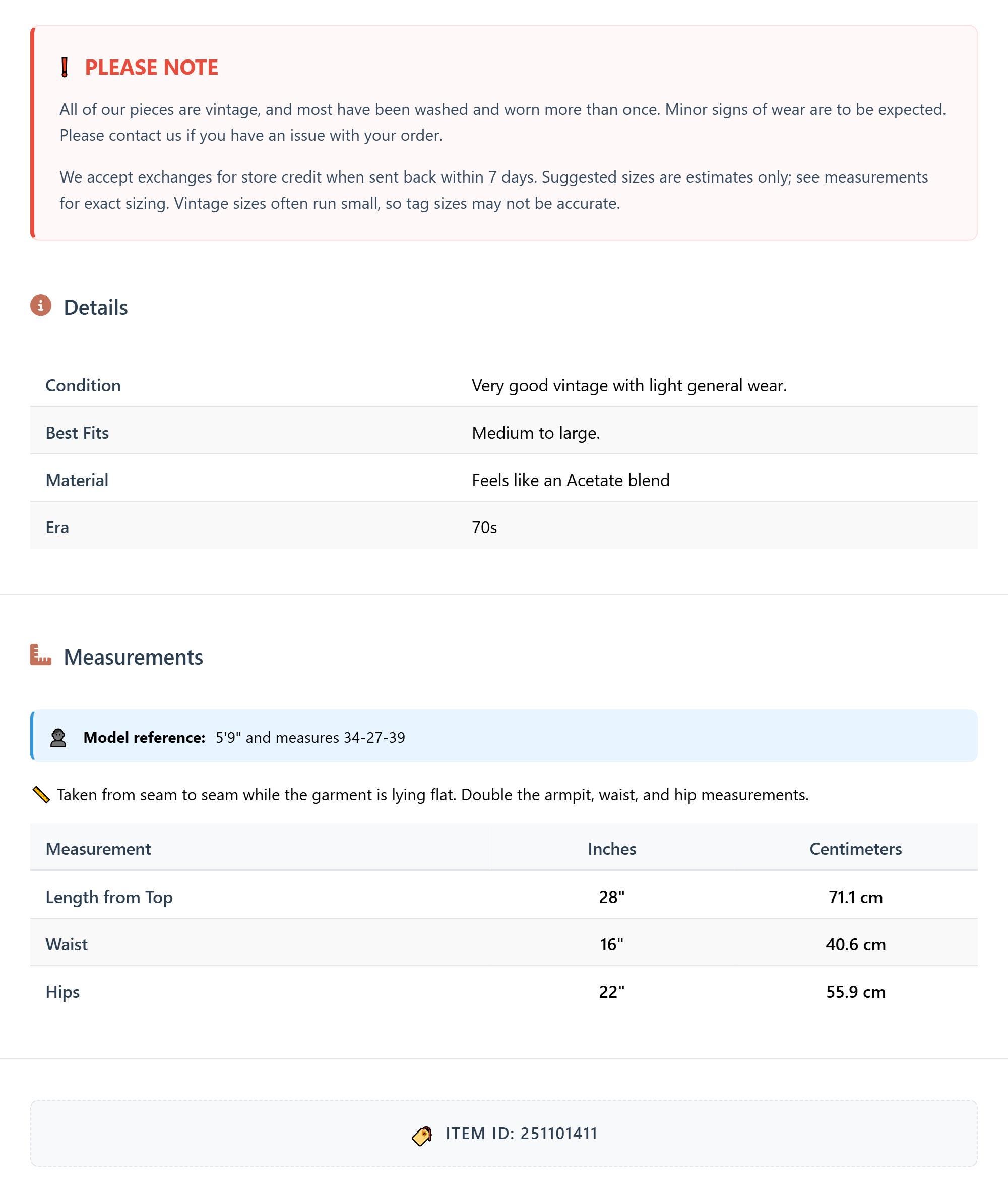 Suggested sizes are estimates only; see measurements for exact sizing. Vintage sizes often run small, so tag sizes may not be accurate.