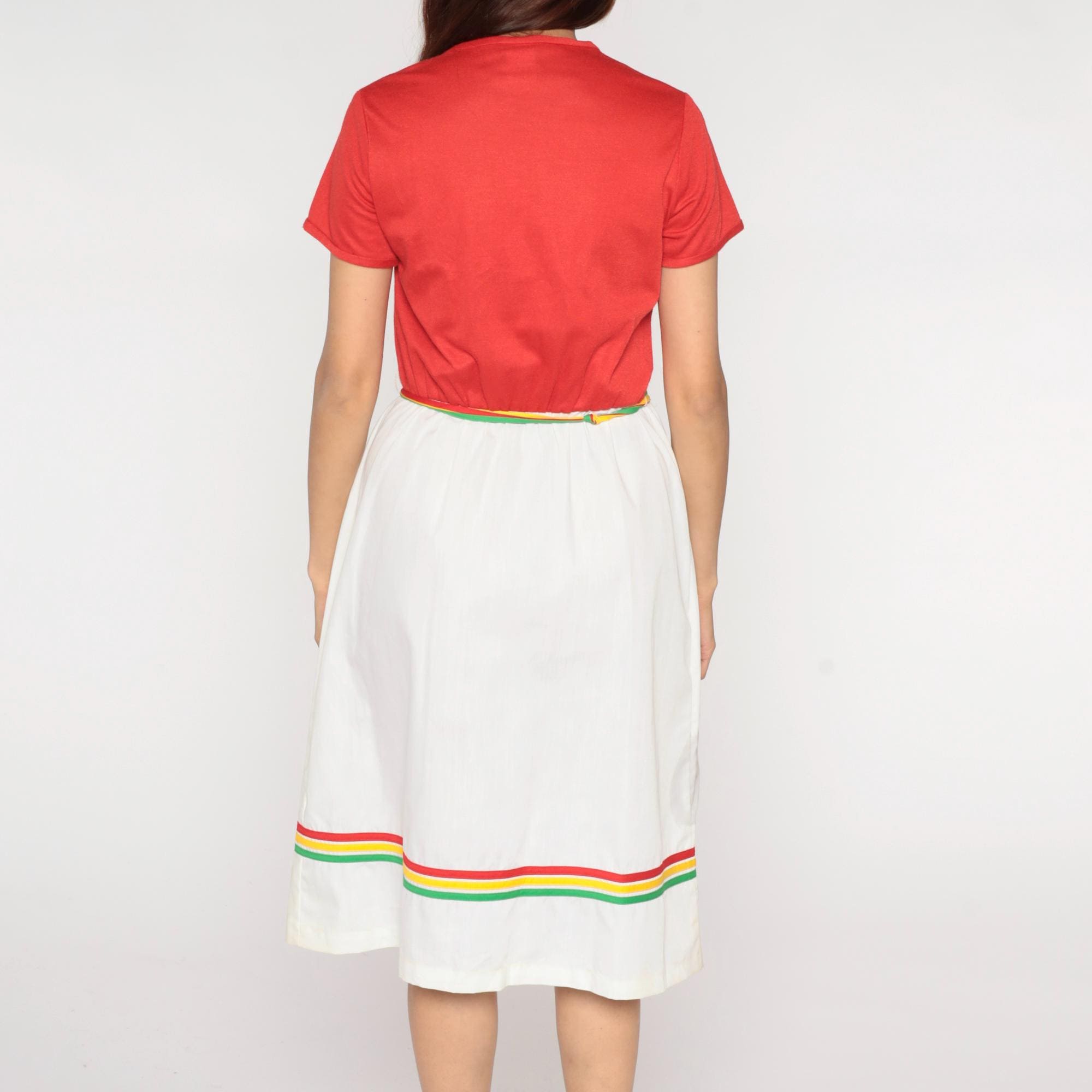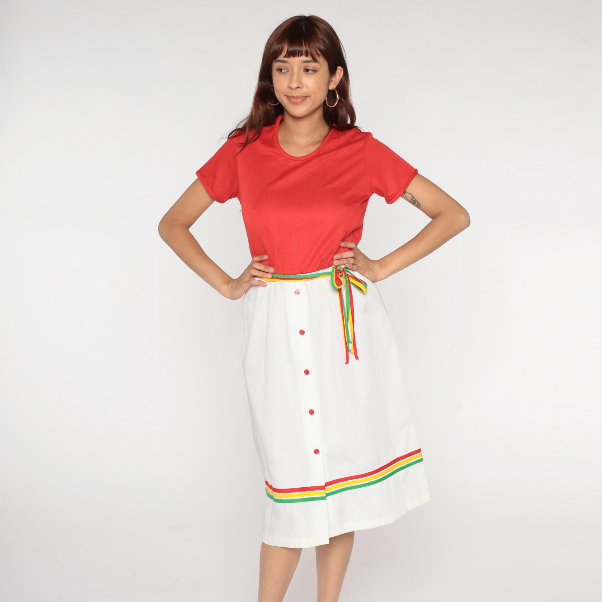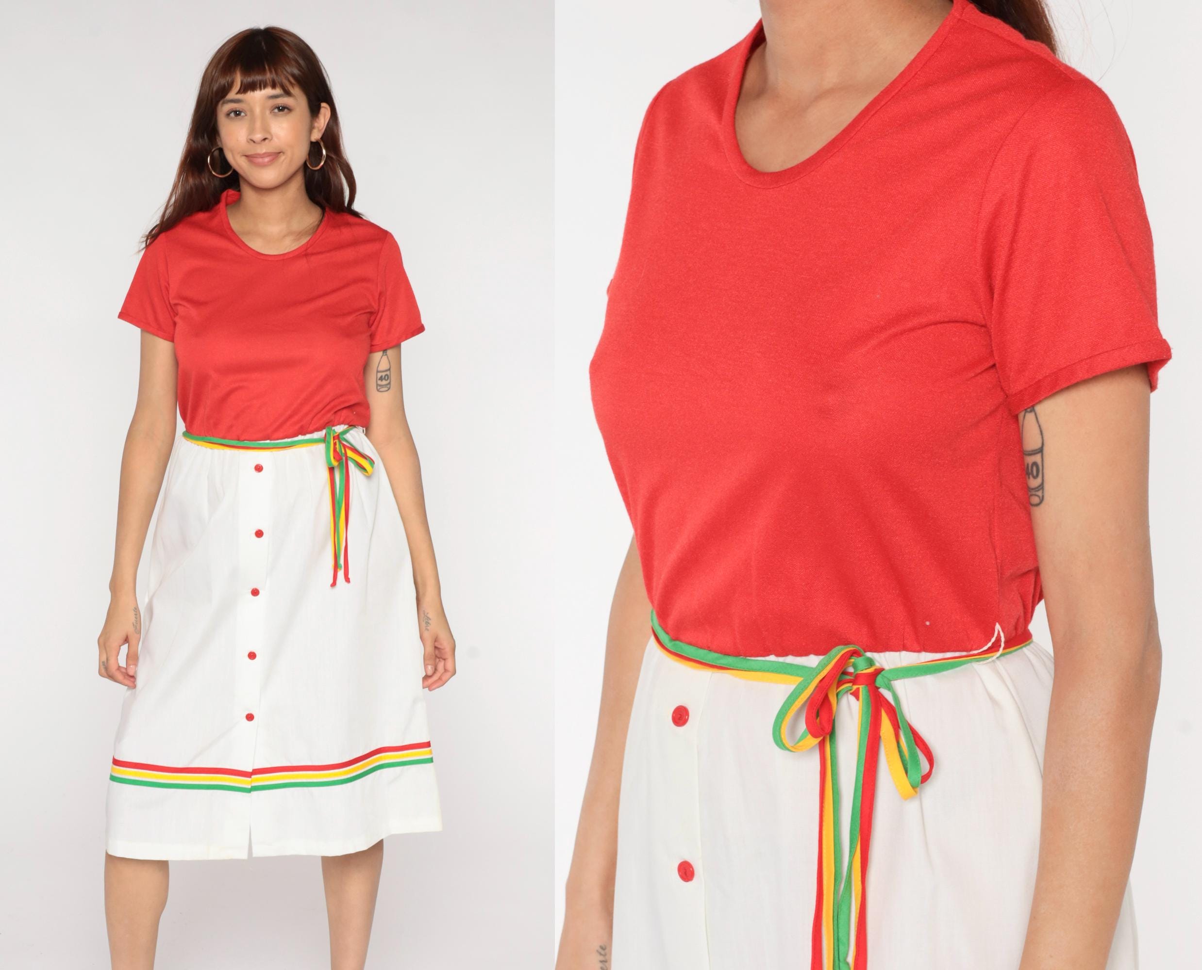 80s two-piece outfit from Star Shine with coral red short sleeve top and white wrap skirt. Skirt has rainbow striped trim in red, yellow, and green along the hem and matching rainbow belt ties at waist, center front button closure.