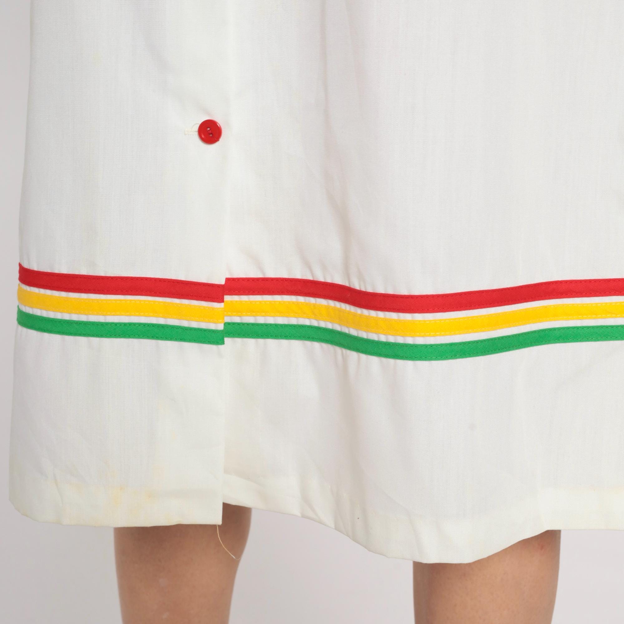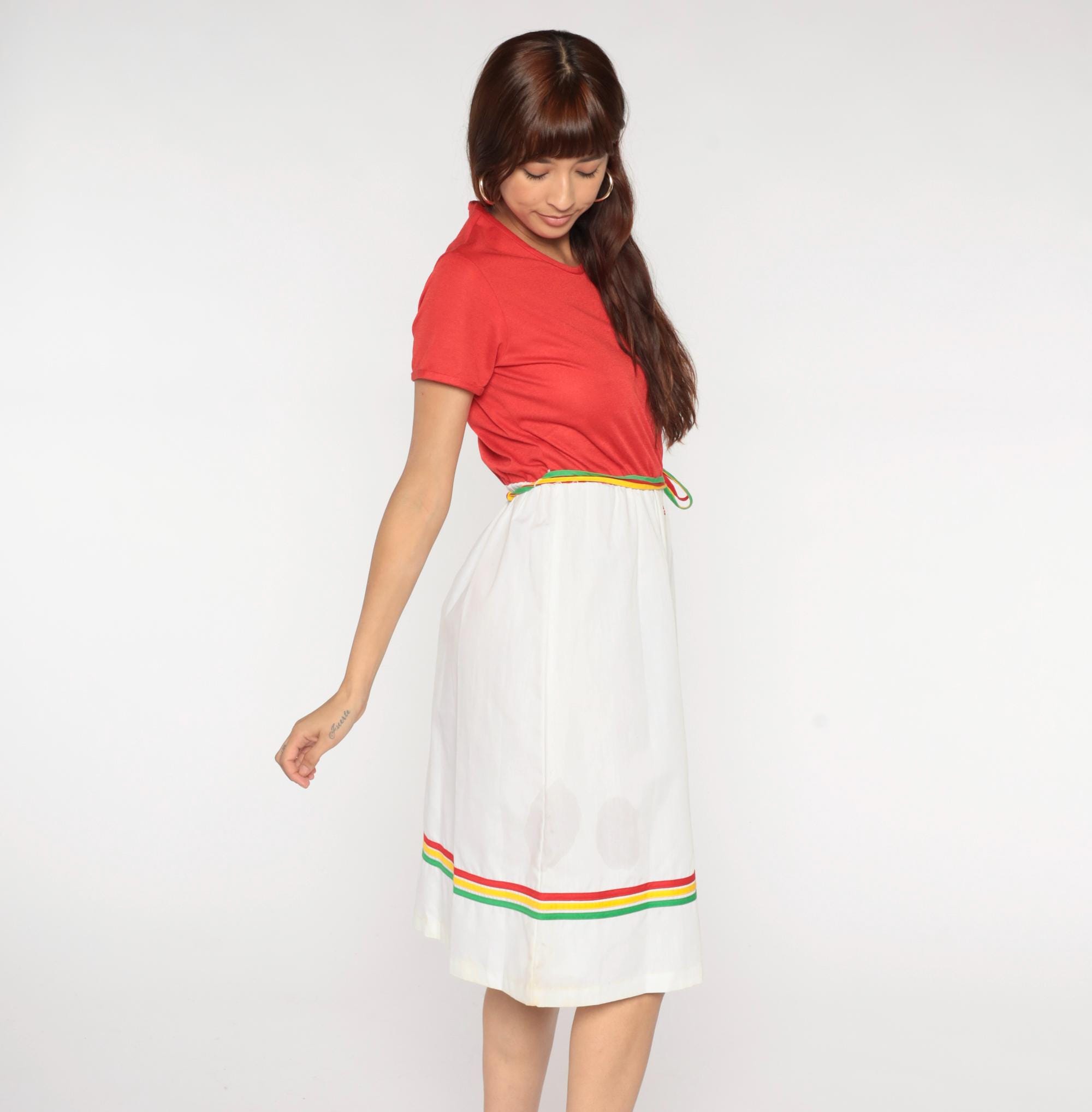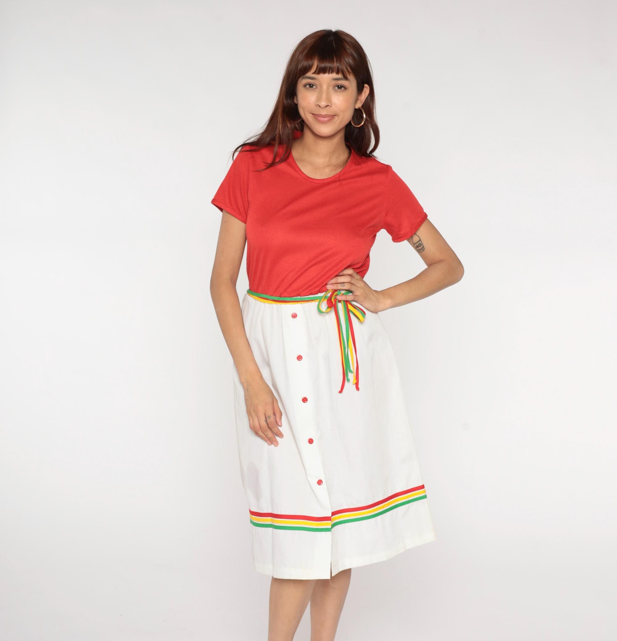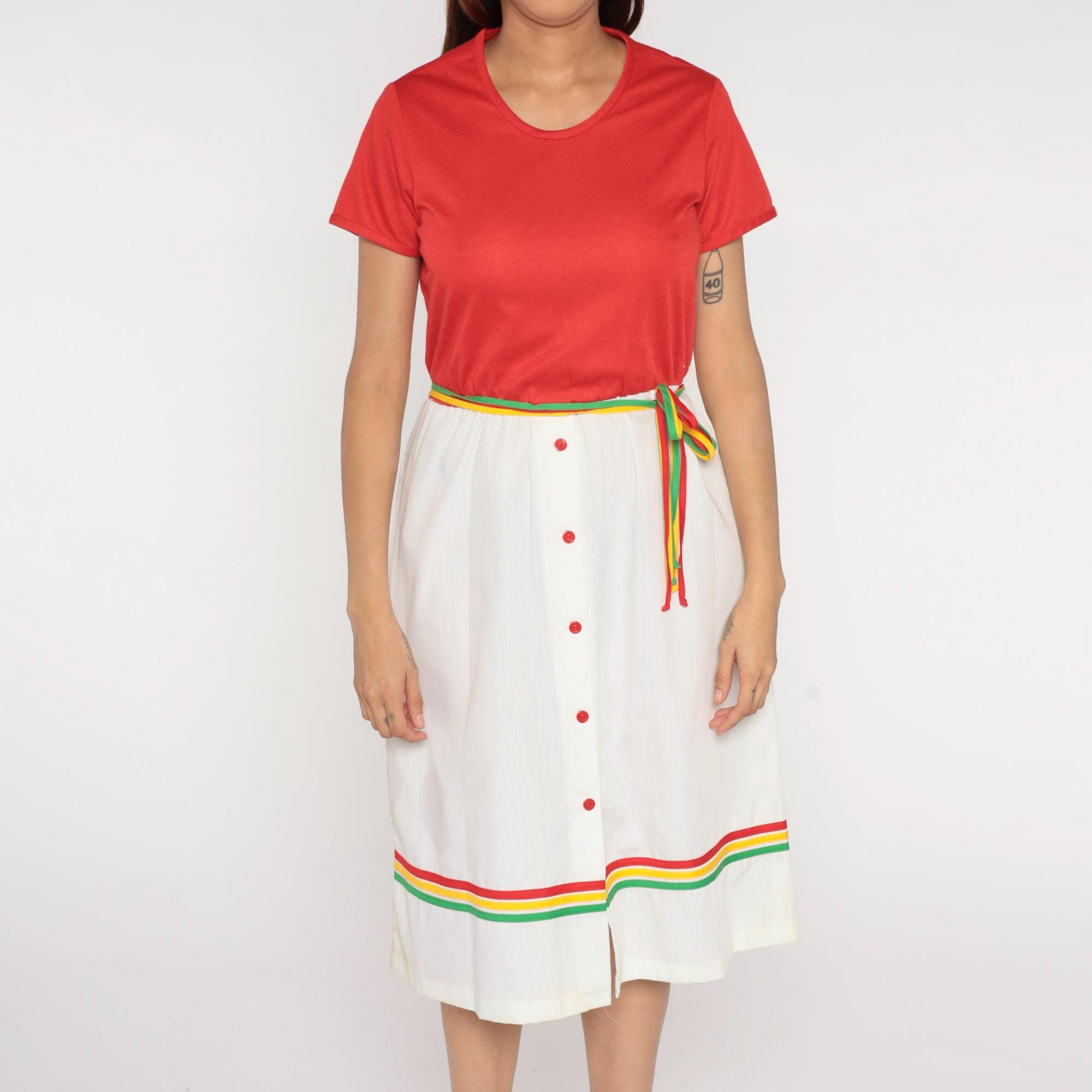 80s two-piece outfit from Star Shine with coral red short sleeve top and white wrap skirt. Skirt has rainbow striped trim in red, yellow, and green along the hem and matching rainbow belt ties at waist, center front button closure.