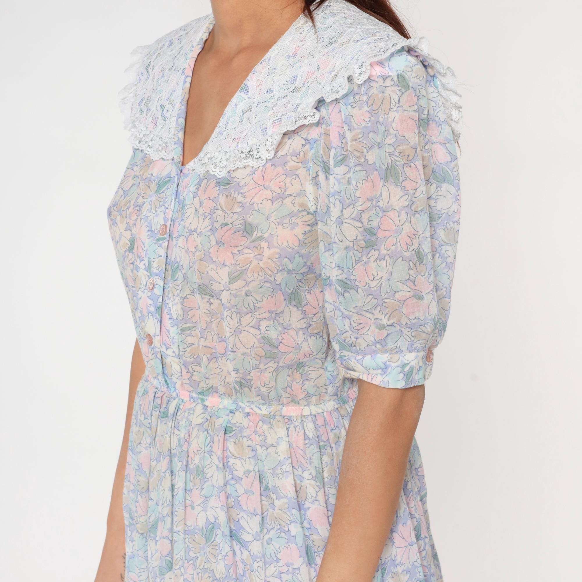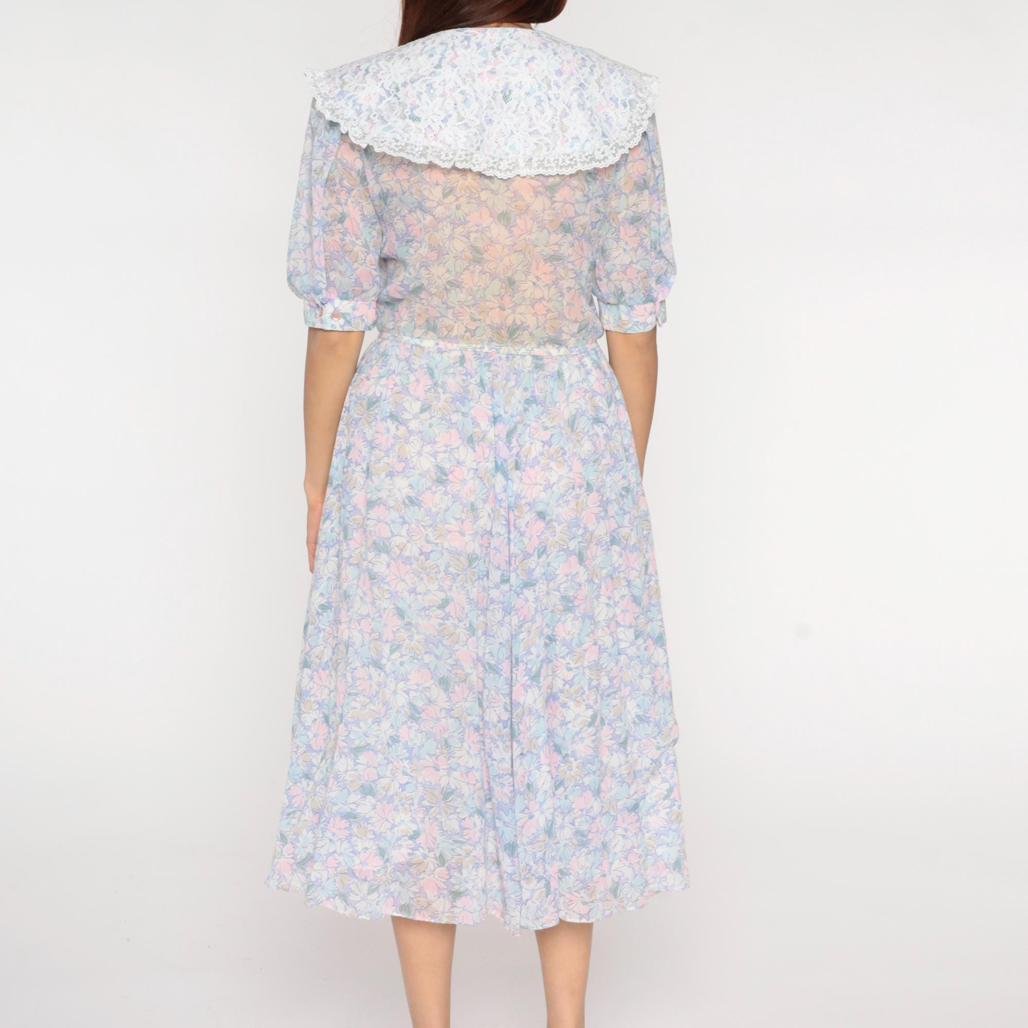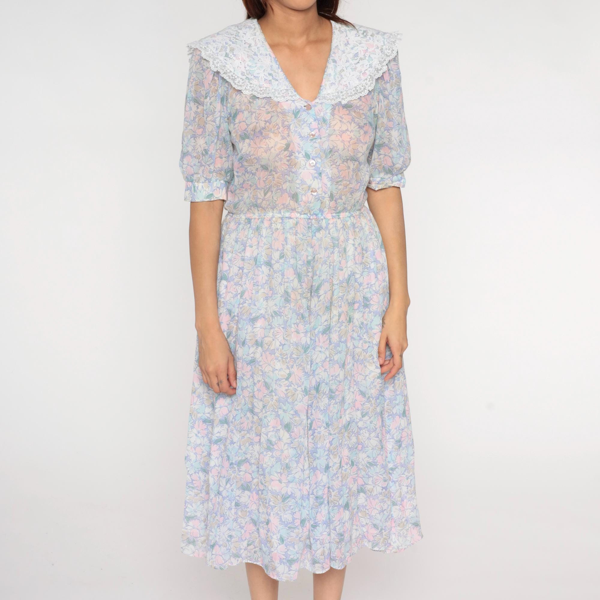 80s pastel floral midi dress from Act 1 with oversized white lace collar, button front bodice, and short puffed sleeves with gathered elastic cuffs. Pink, blue, yellow, and mint flowers across light background fabric, gathered elastic waist, A-line midi skirt.