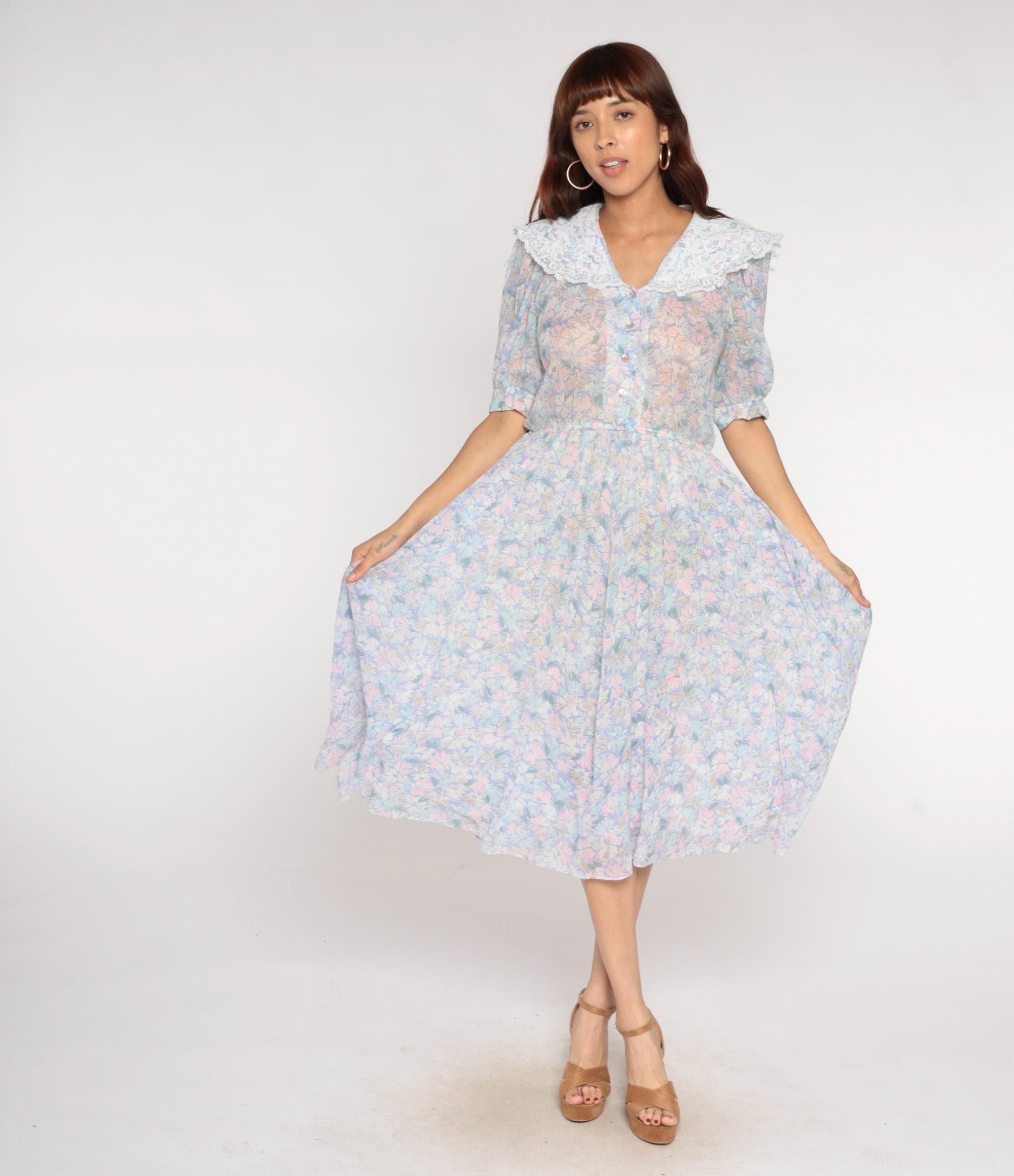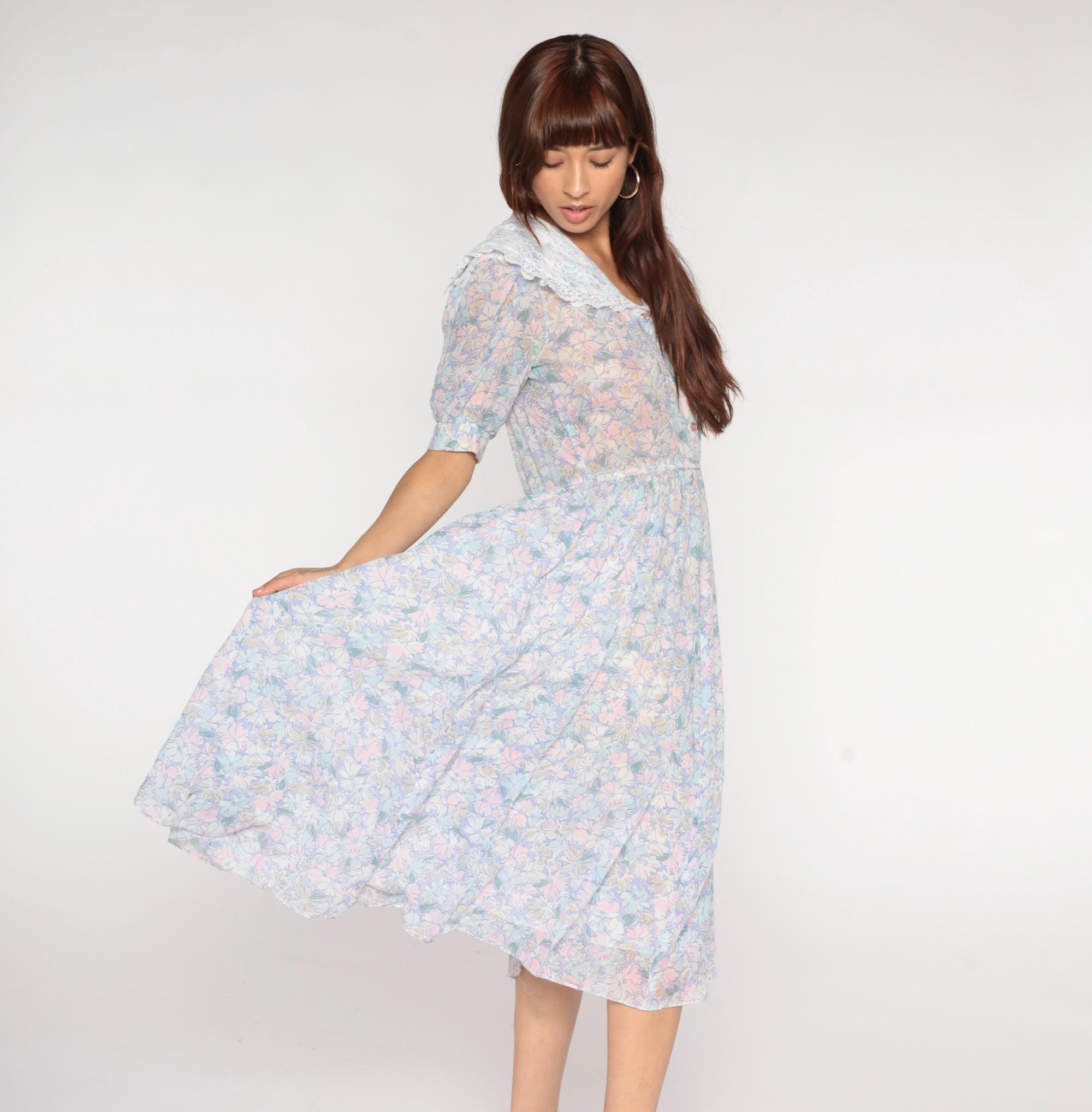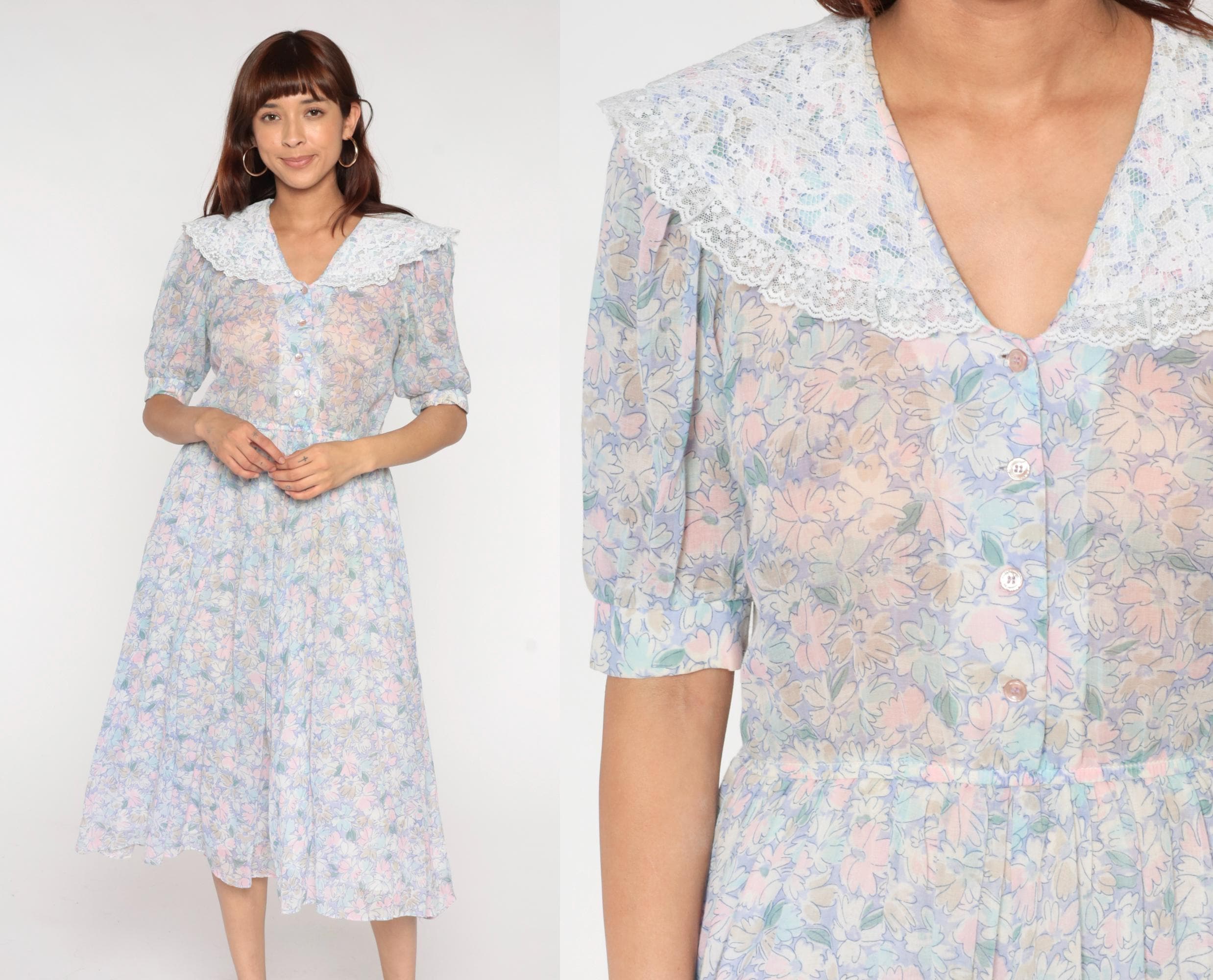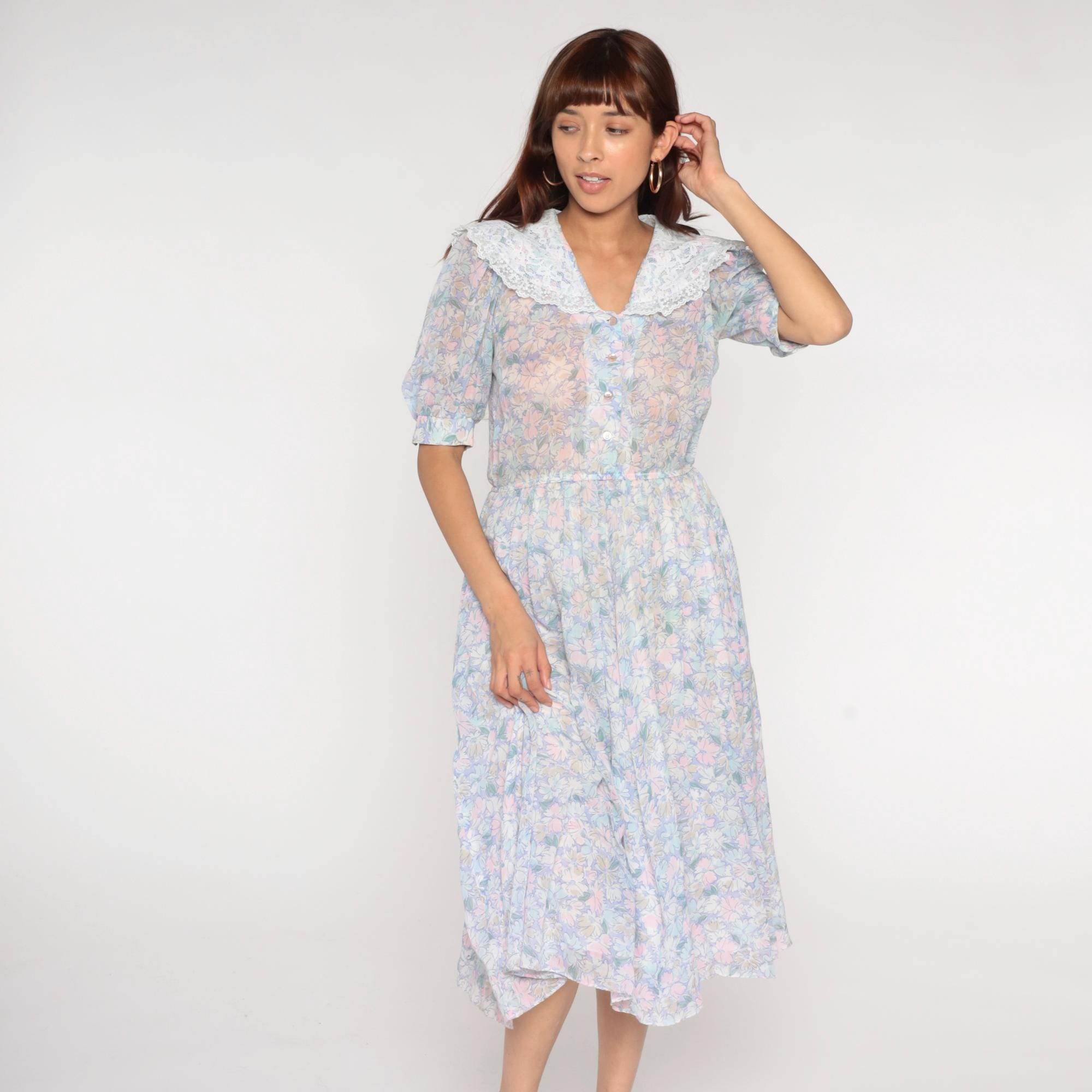 80s pastel floral midi dress from Act 1 with oversized white lace collar, button front bodice, and short puffed sleeves with gathered elastic cuffs. Pink, blue, yellow, and mint flowers across light background fabric, gathered elastic waist, A-line midi skirt.