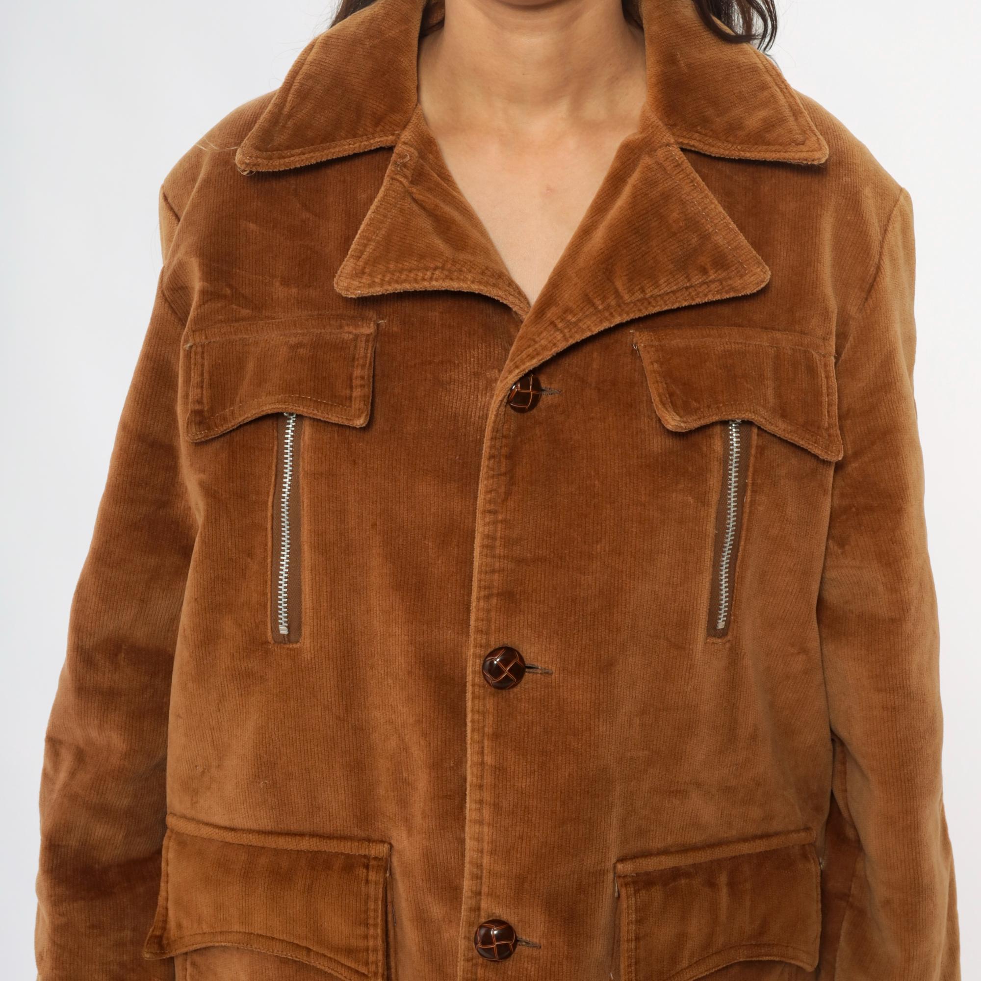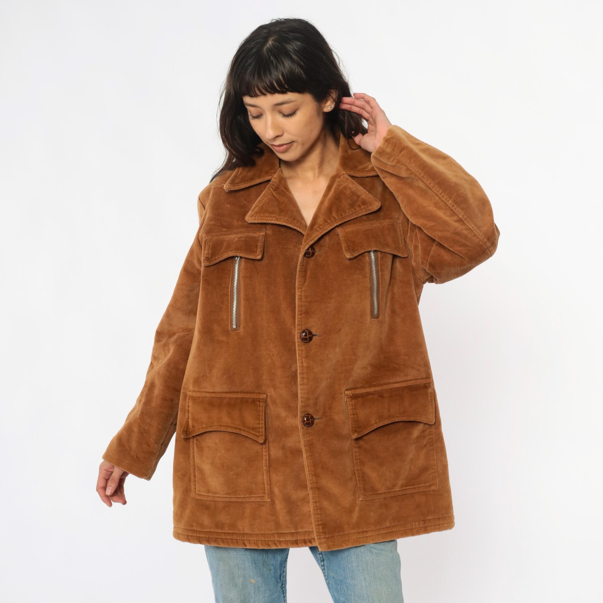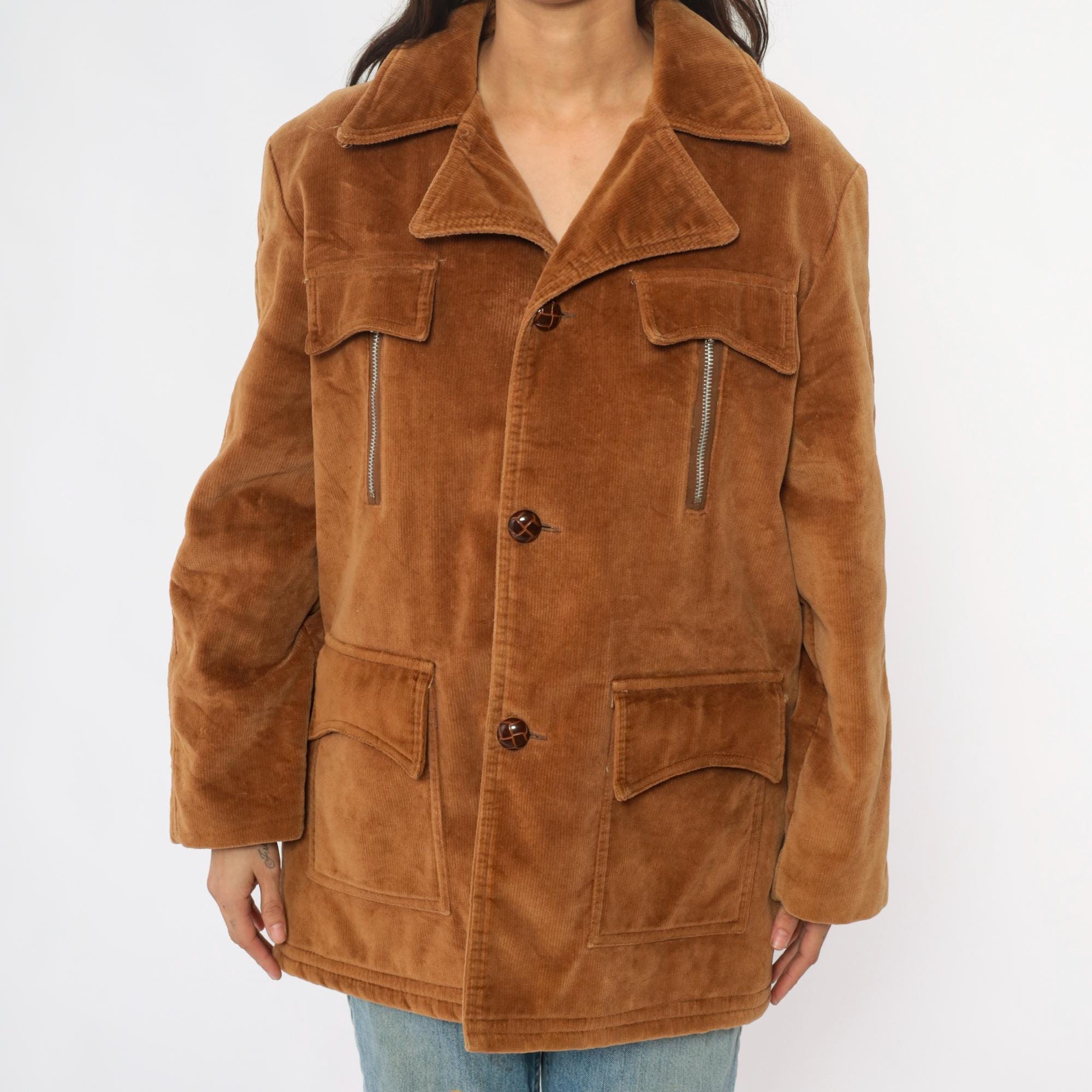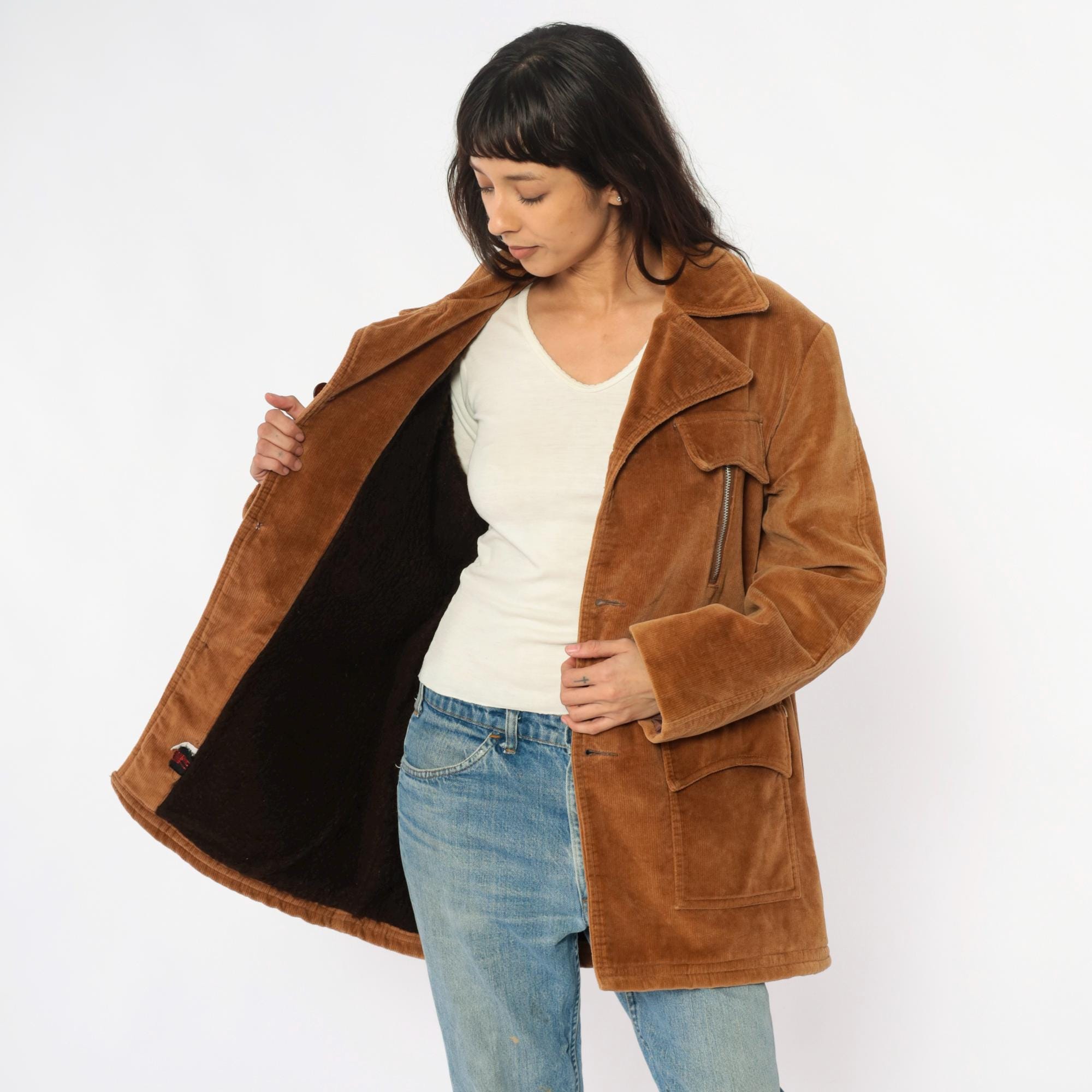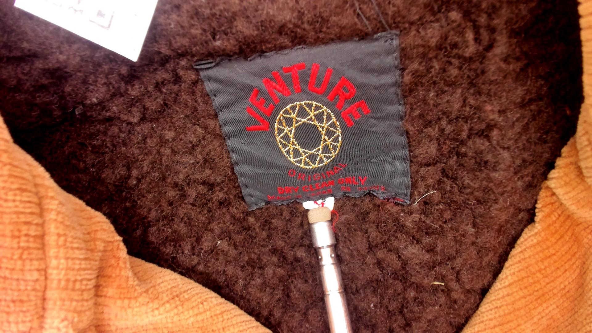 70s tan corduroy jacket from venture with wide notched collar and faux shearling lining. Button front closure with two chest flap pockets, two zipper hand pockets, and two lower patch pockets. Long sleeves. Cotton corduroy with faux shearling lining.