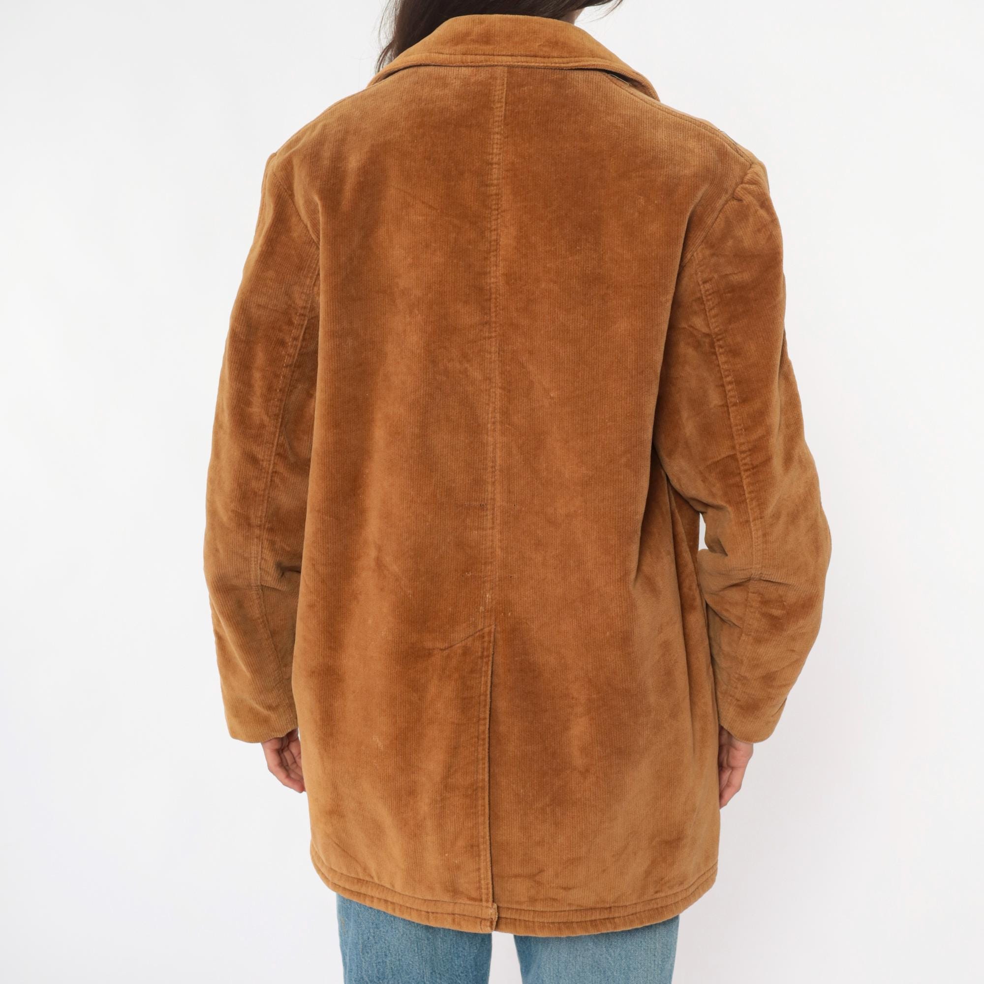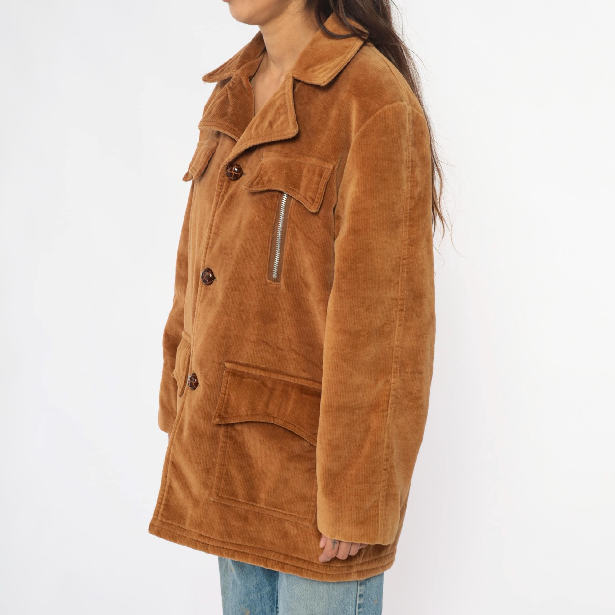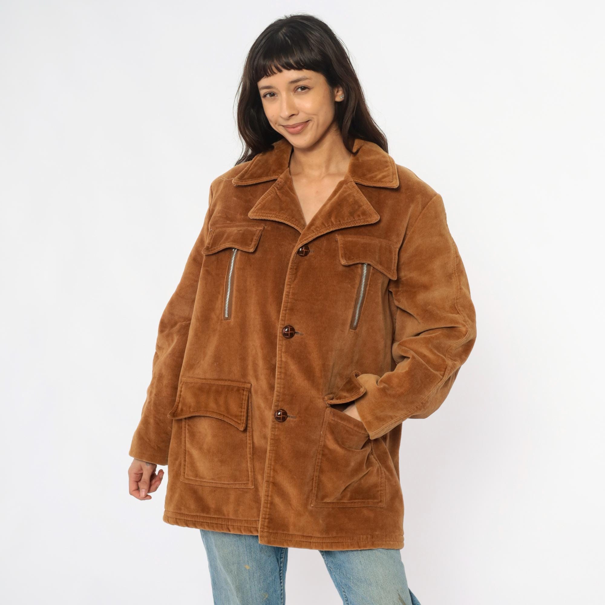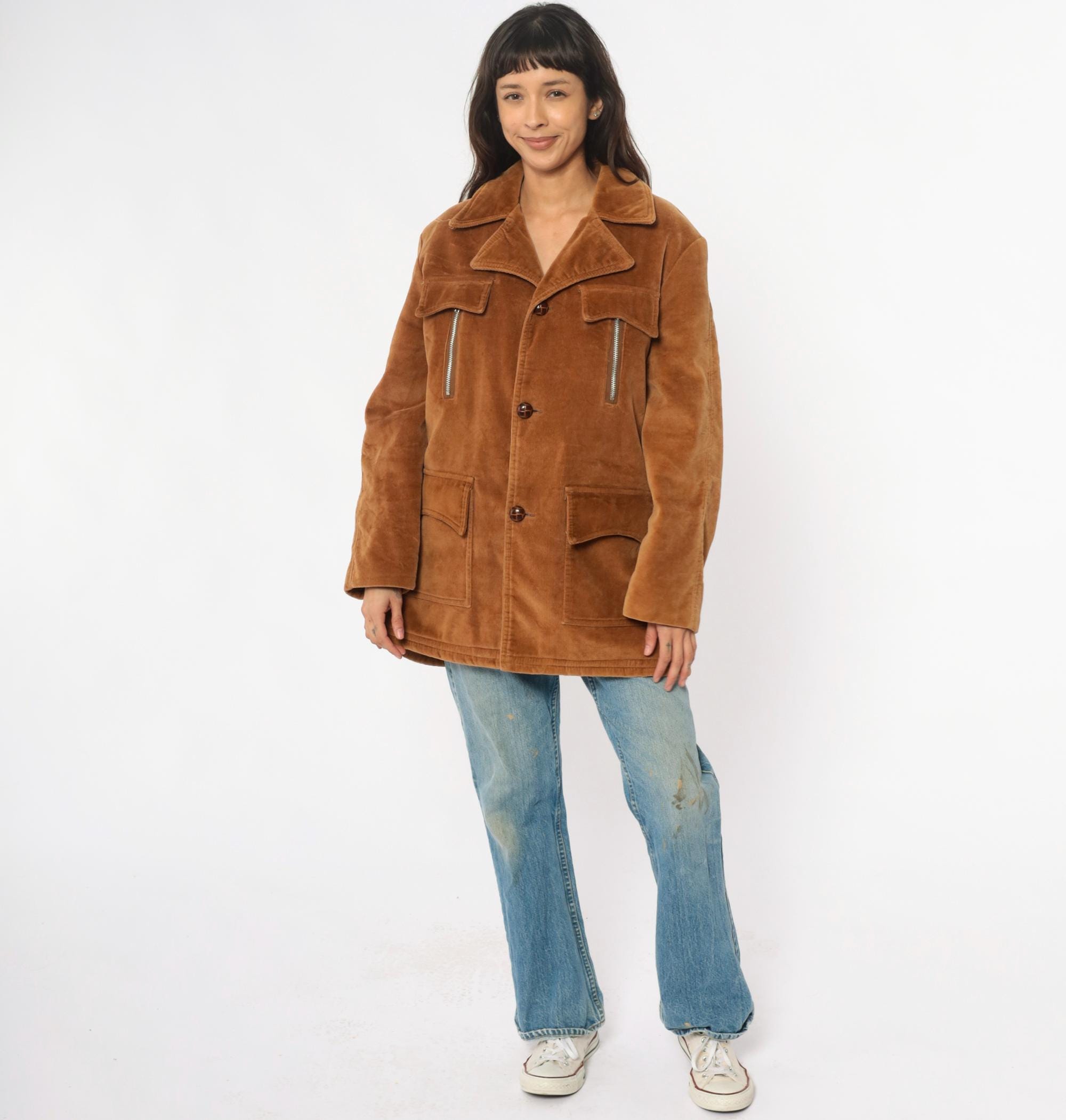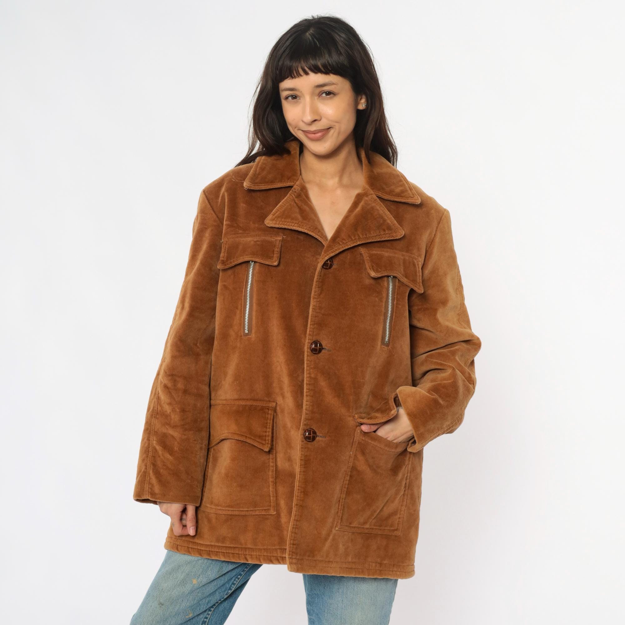 70s tan corduroy jacket from venture with wide notched collar and faux shearling lining. Button front closure with two chest flap pockets, two zipper hand pockets, and two lower patch pockets. Long sleeves. Cotton corduroy with faux shearling lining.