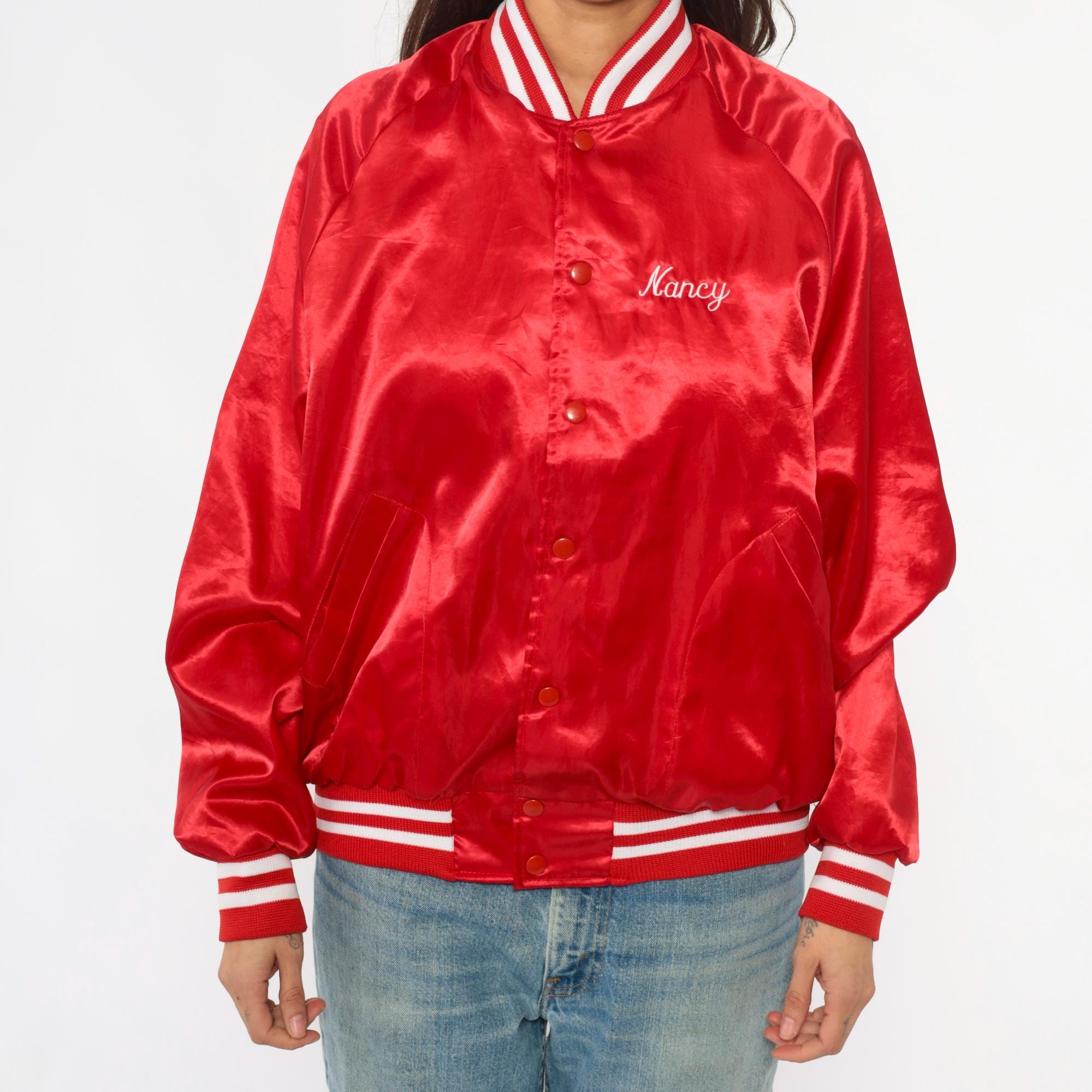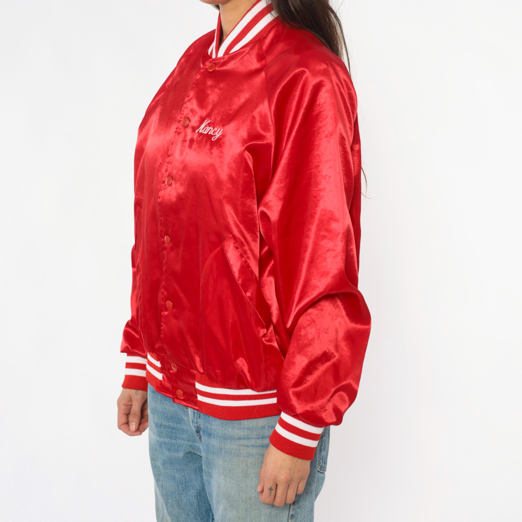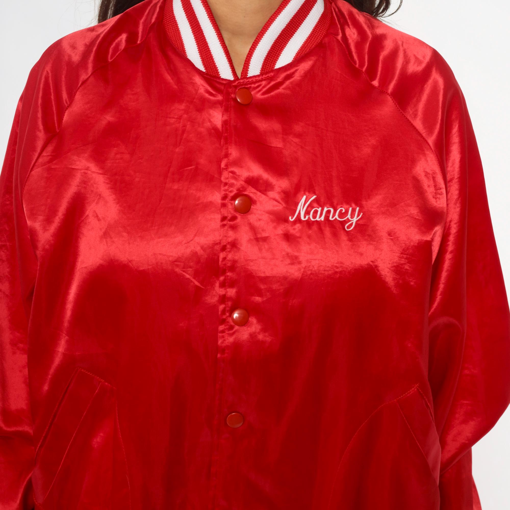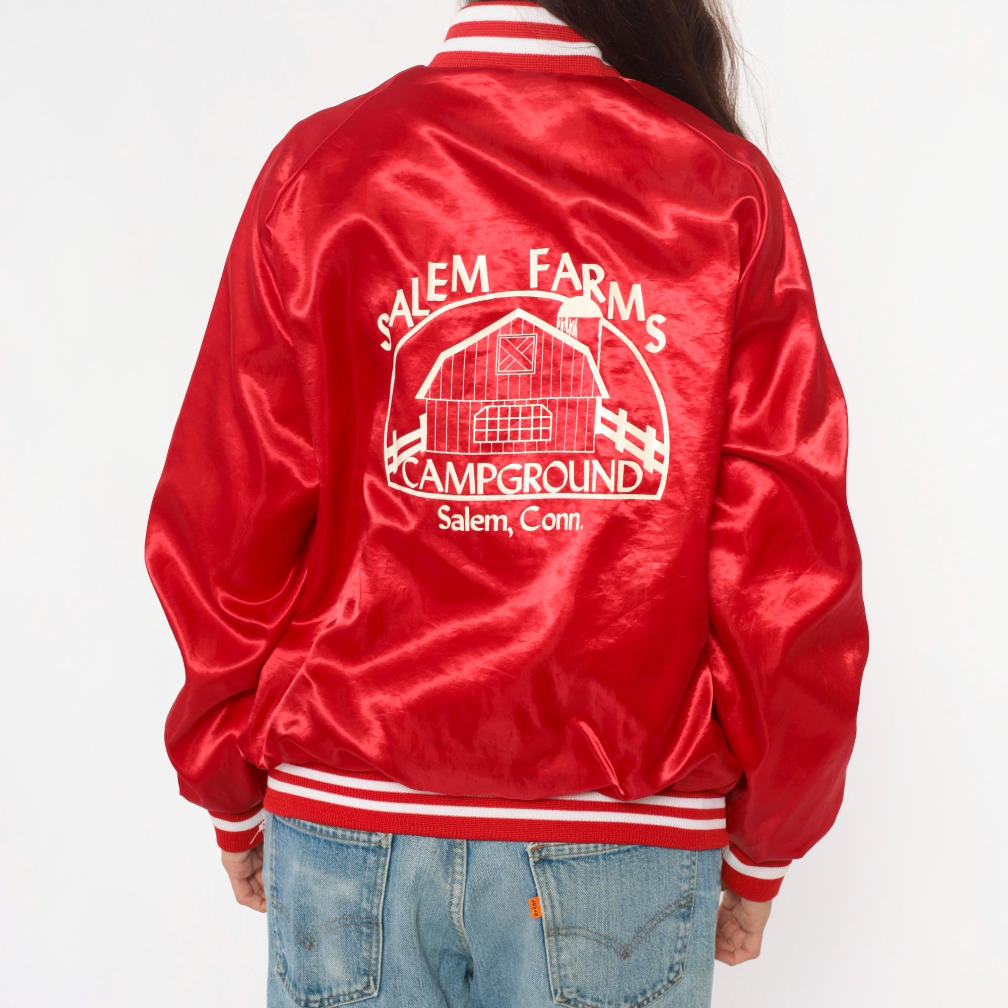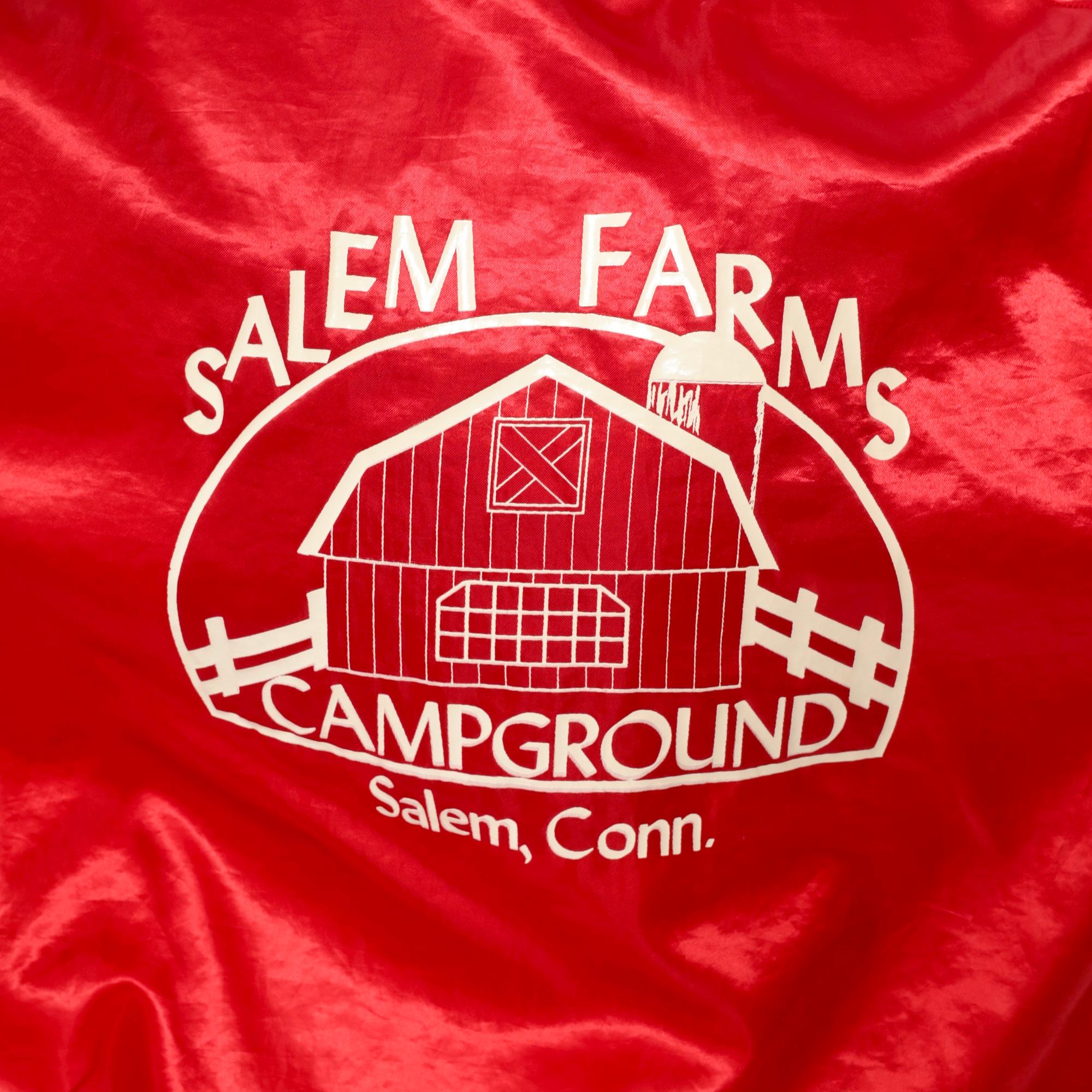 90s red satin bomber jacket with "Salem Farms Campground Salem, Conn." text and barn graphic embroidered across the back. "Nancy" embroidered in white script on front chest, white and red striped ribbed collar, cuffs, and hem. Snap button front closure with two front pockets.