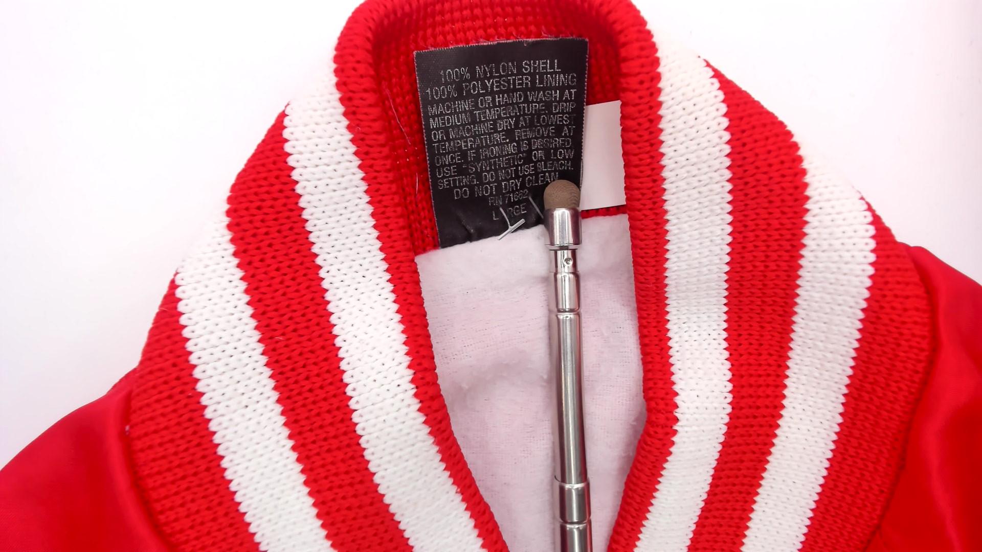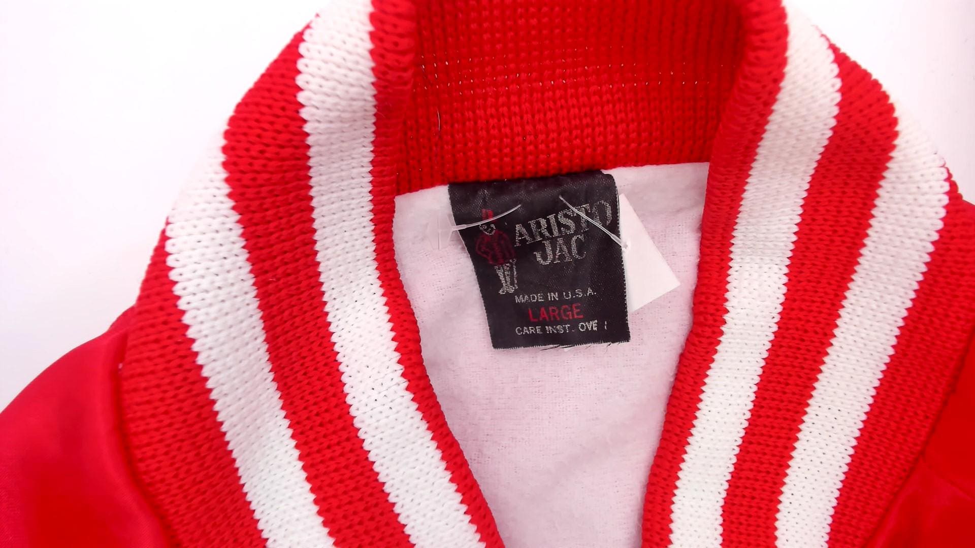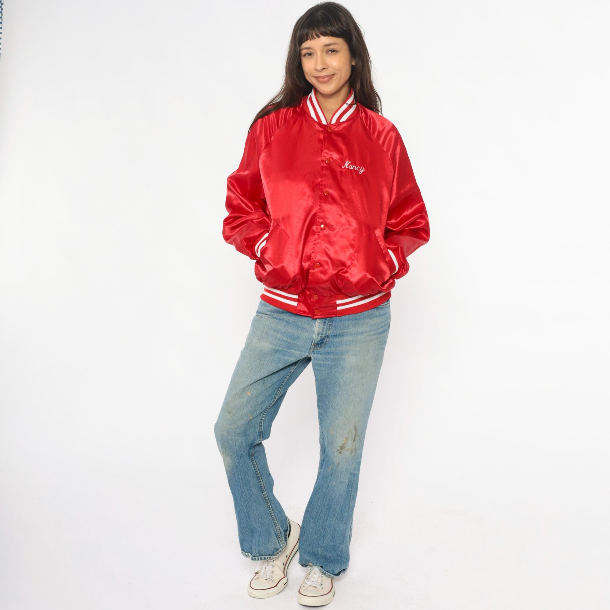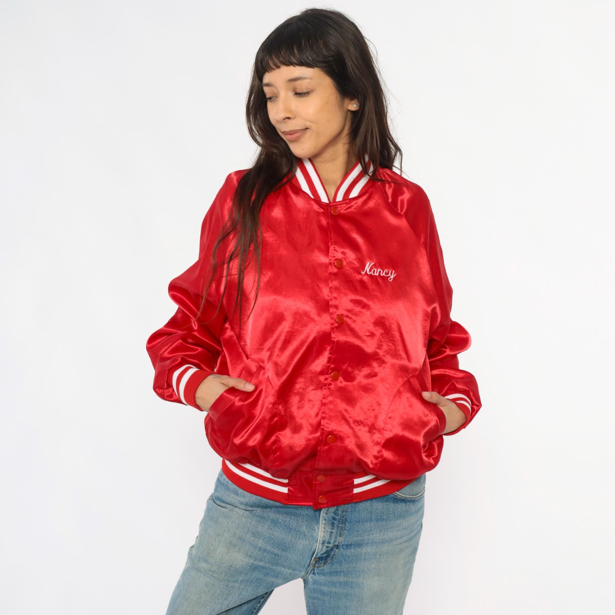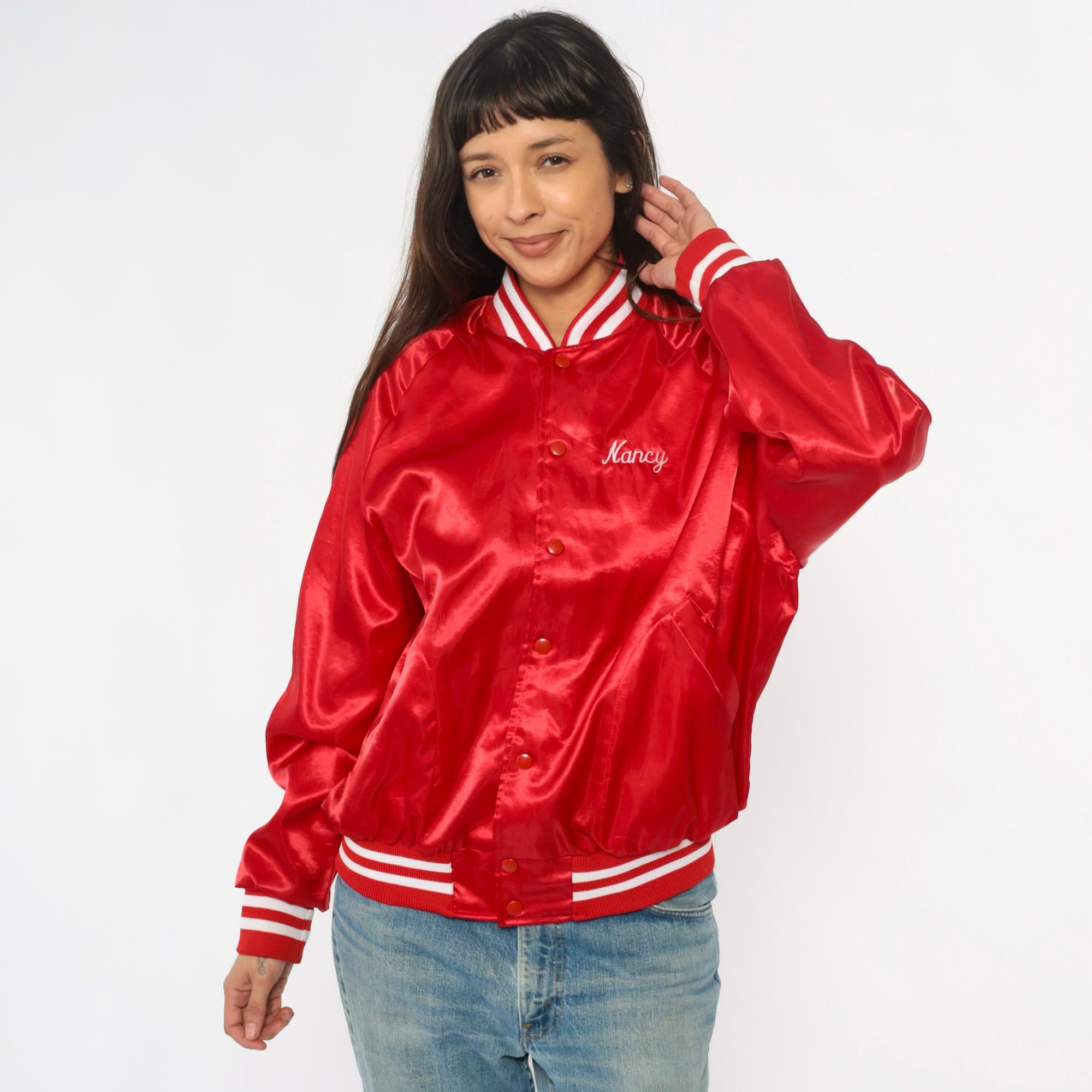90s red satin bomber jacket with "Salem Farms Campground Salem, Conn." text and barn graphic embroidered across the back. "Nancy" embroidered in white script on front chest, white and red striped ribbed collar, cuffs, and hem. Snap button front closure with two front pockets.