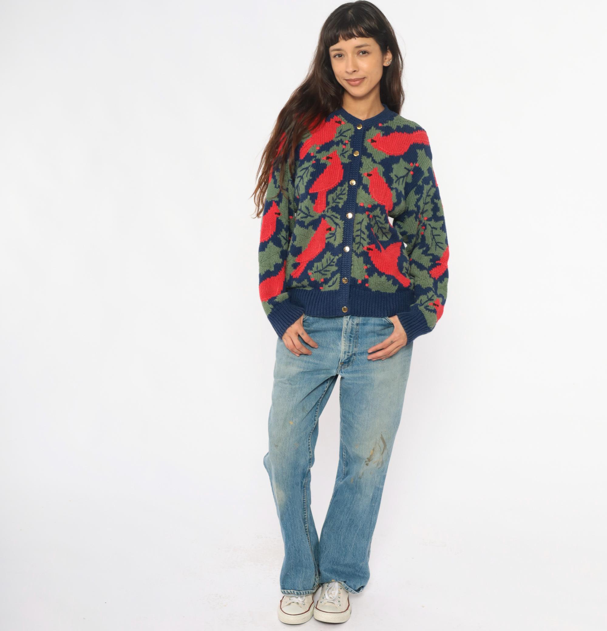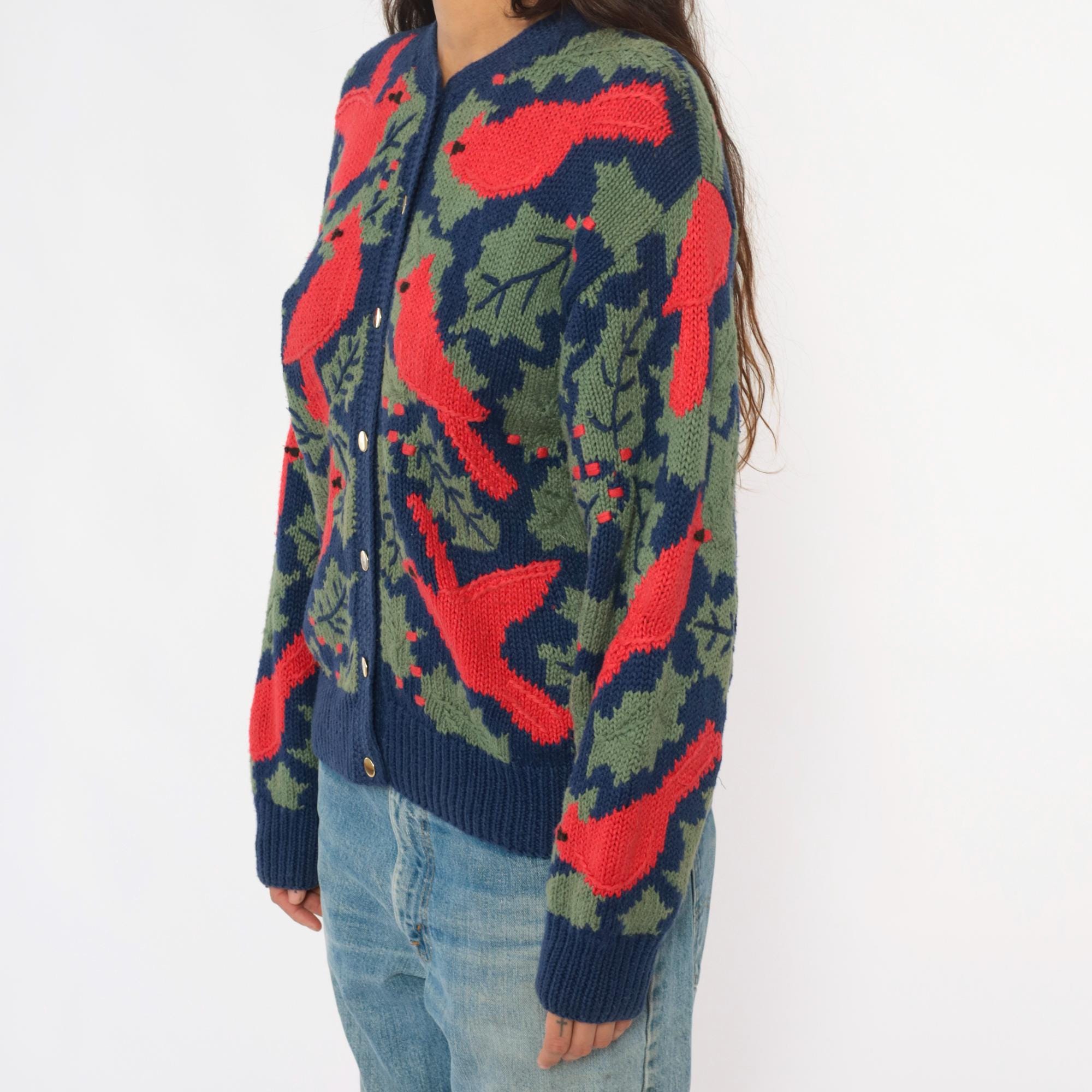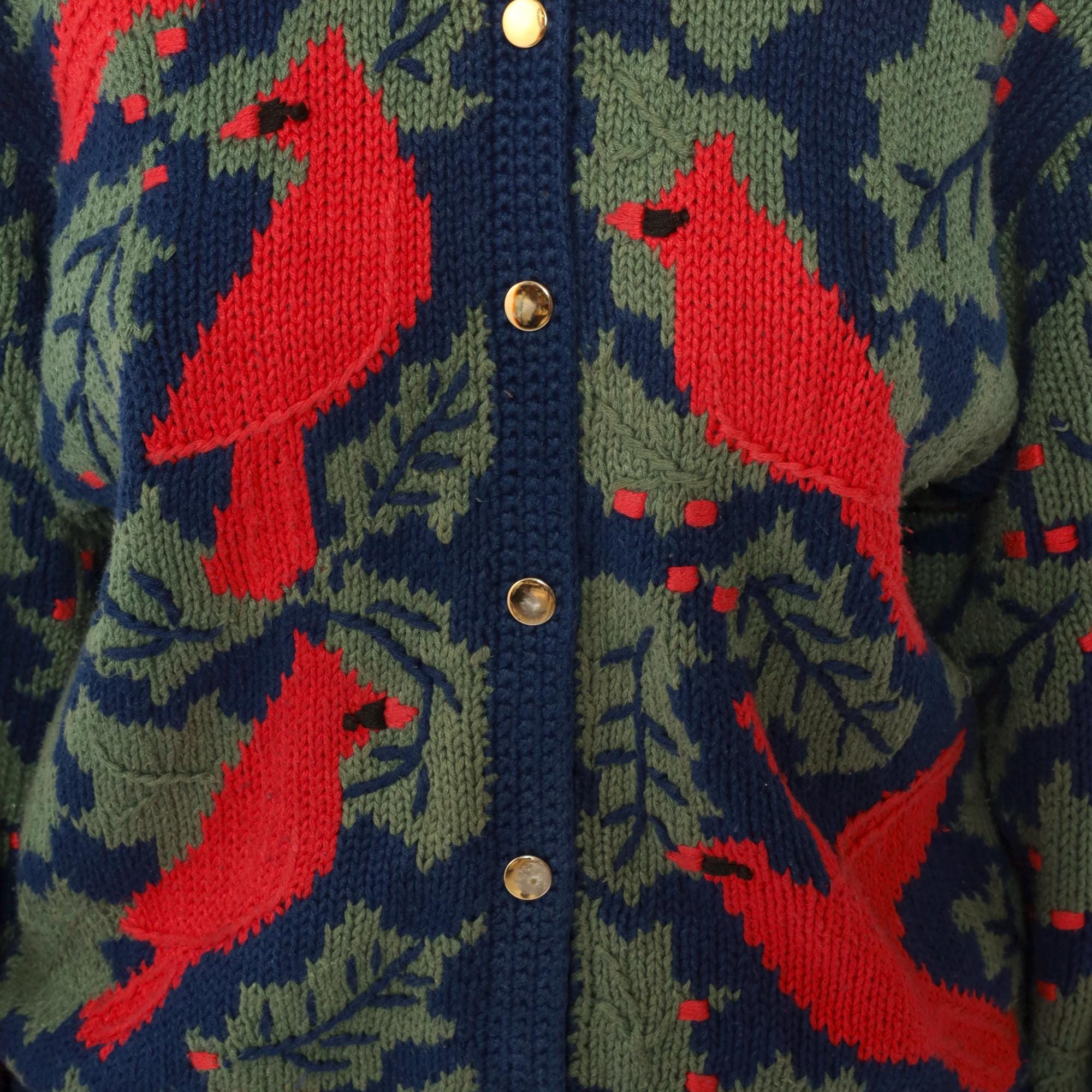 90s navy blue cardigan from Orvis with red cardinals and green foliage knitted throughout the sweater. Gold button front closure, ribbed collar, cuffs, and hem with scattered red berry details across the pattern.