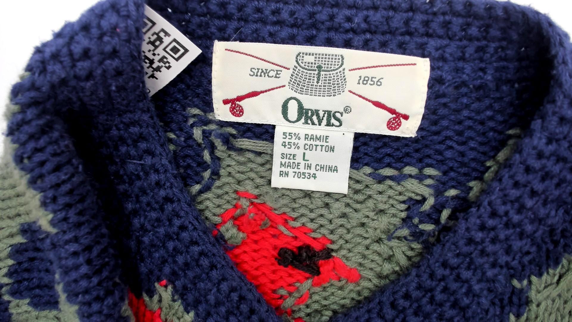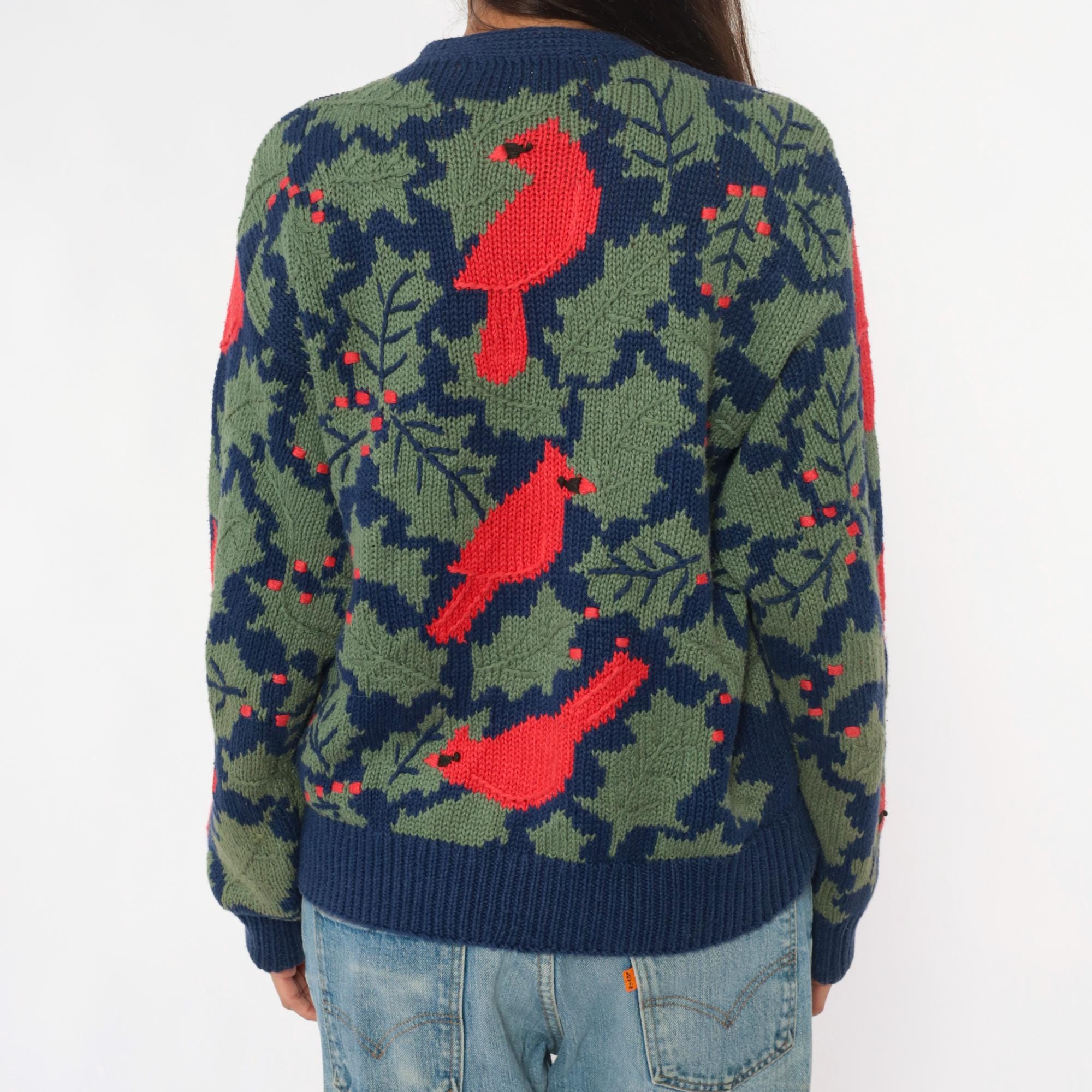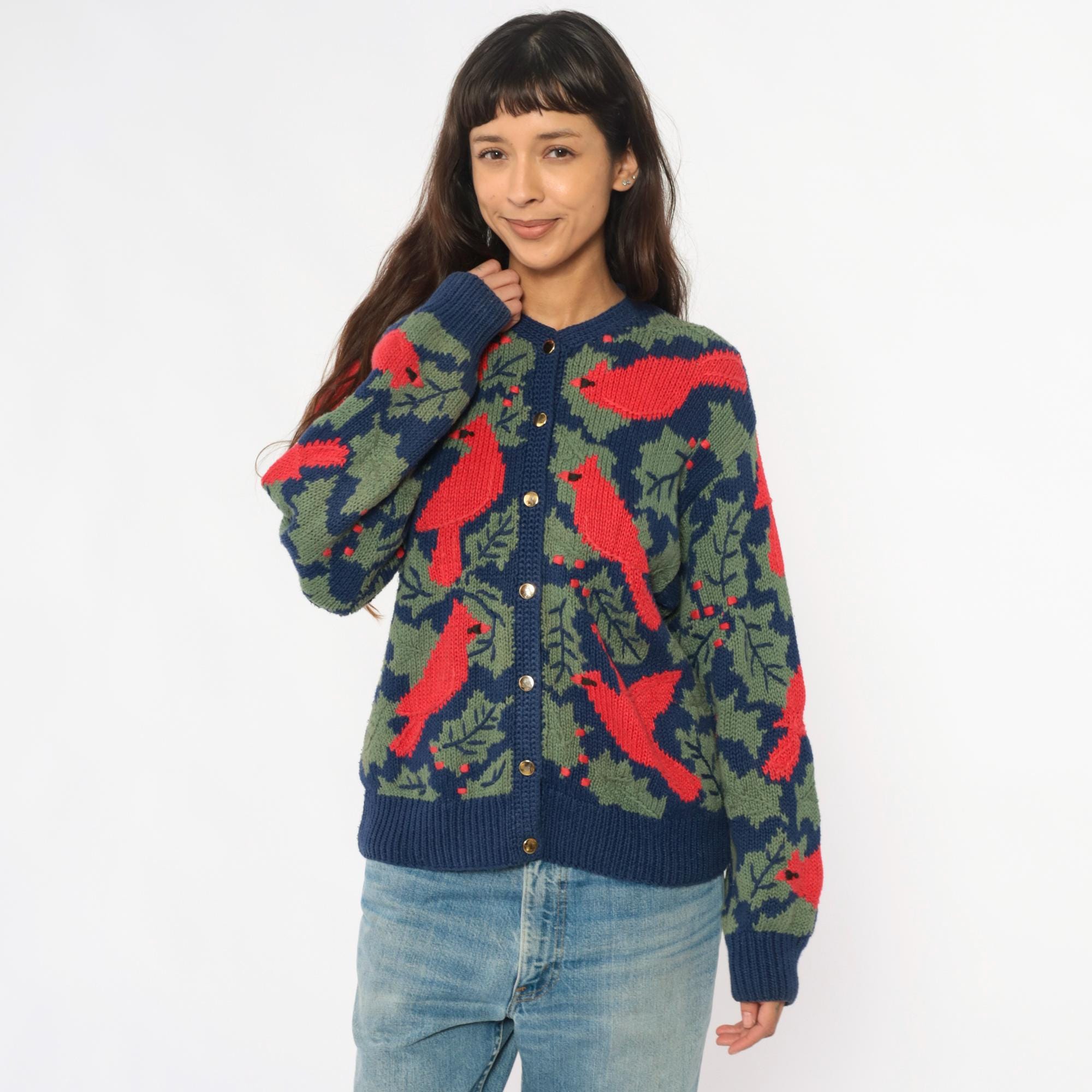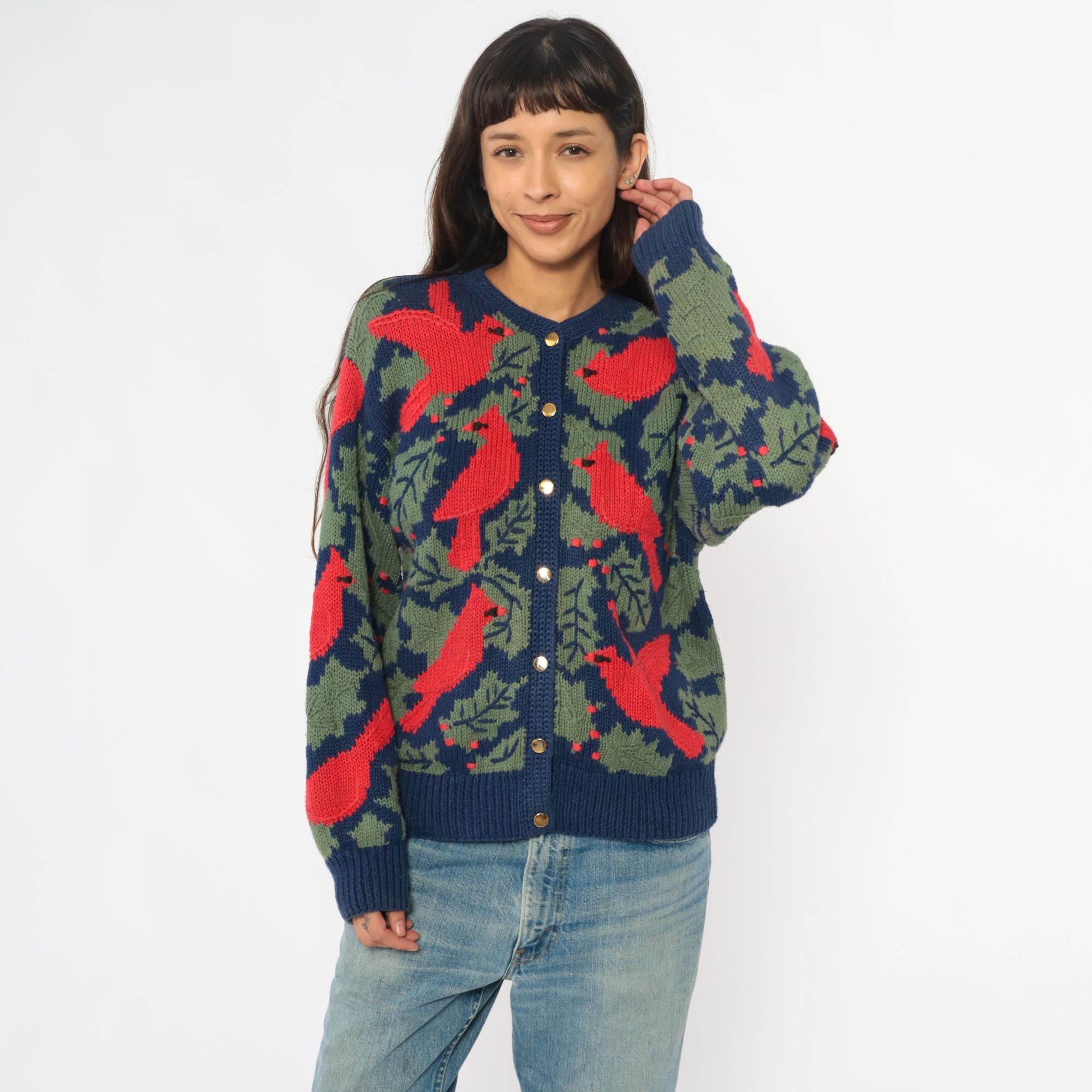 90s navy blue cardigan from Orvis with red cardinals and green foliage knitted throughout the sweater. Gold button front closure, ribbed collar, cuffs, and hem with scattered red berry details across the pattern.