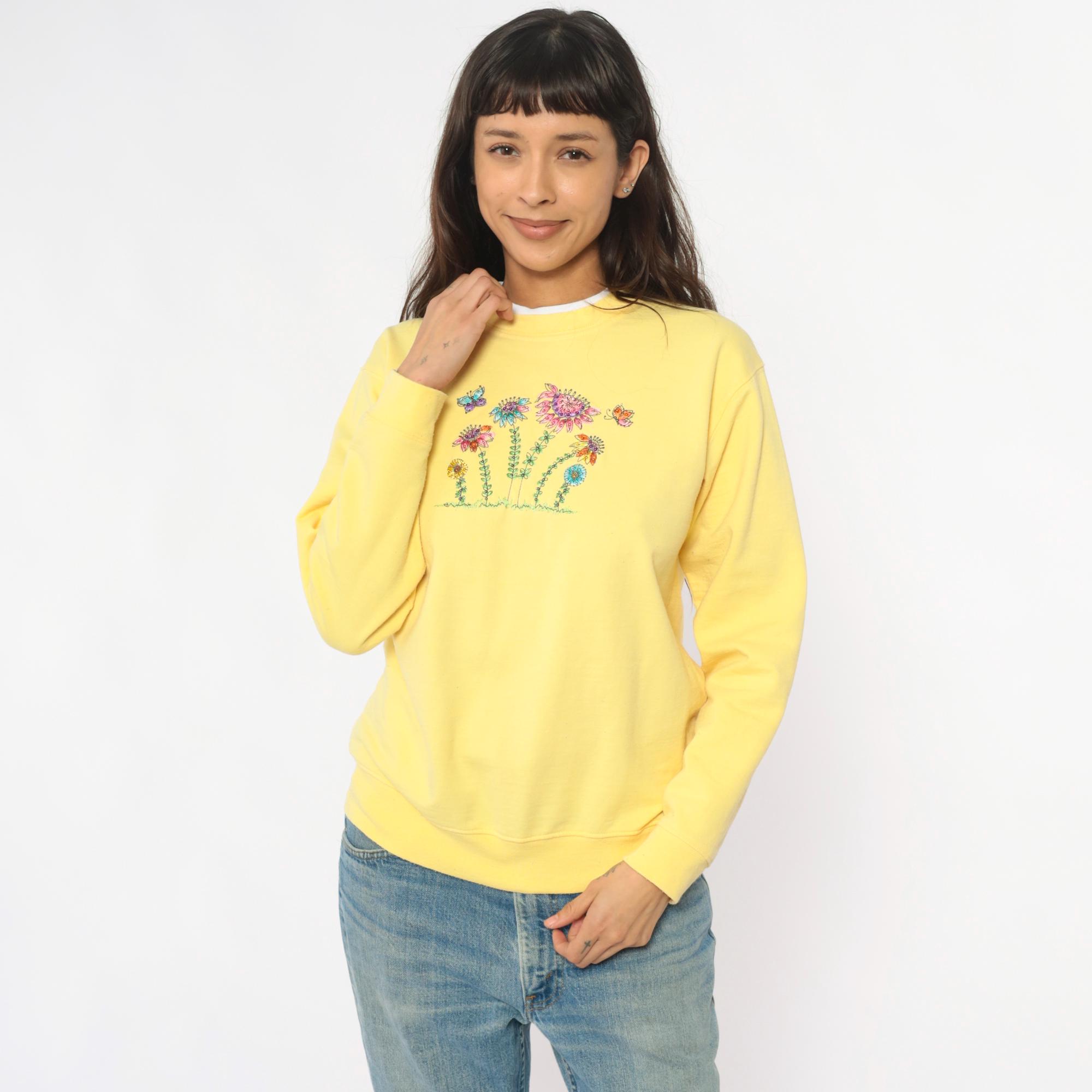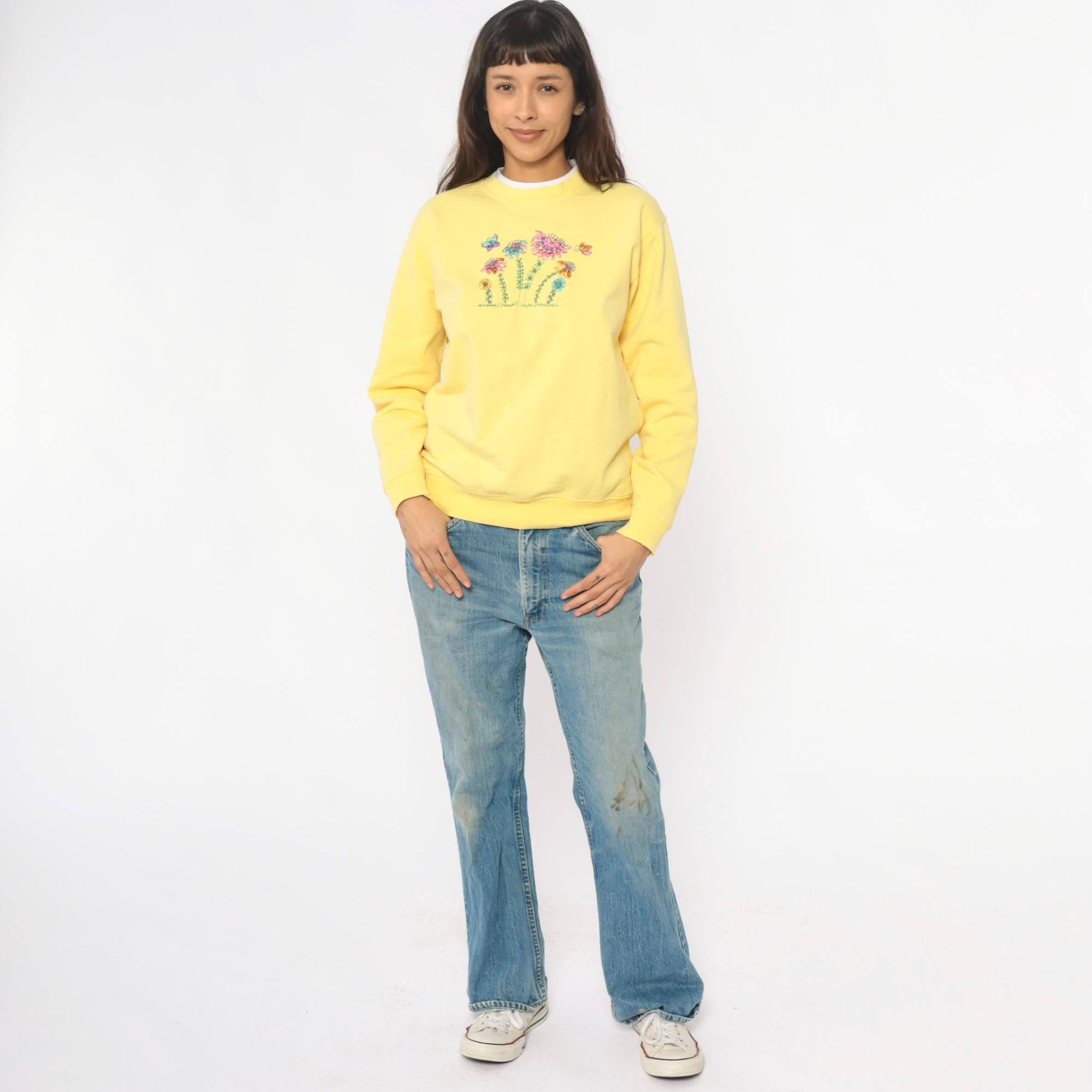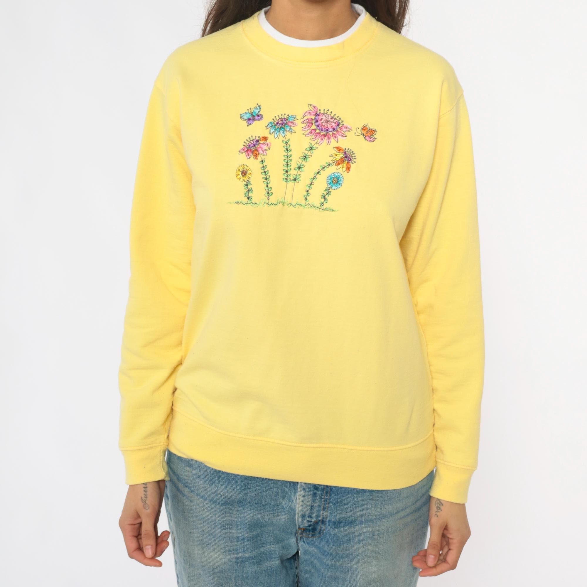 90s pale yellow sweatshirt with embroidered floral and butterfly design across the front. Pink, purple, blue, and yellow flowers with green stems and leaves, butterflies in blue and orange. White ringer trim at crew neckline, long sleeves.