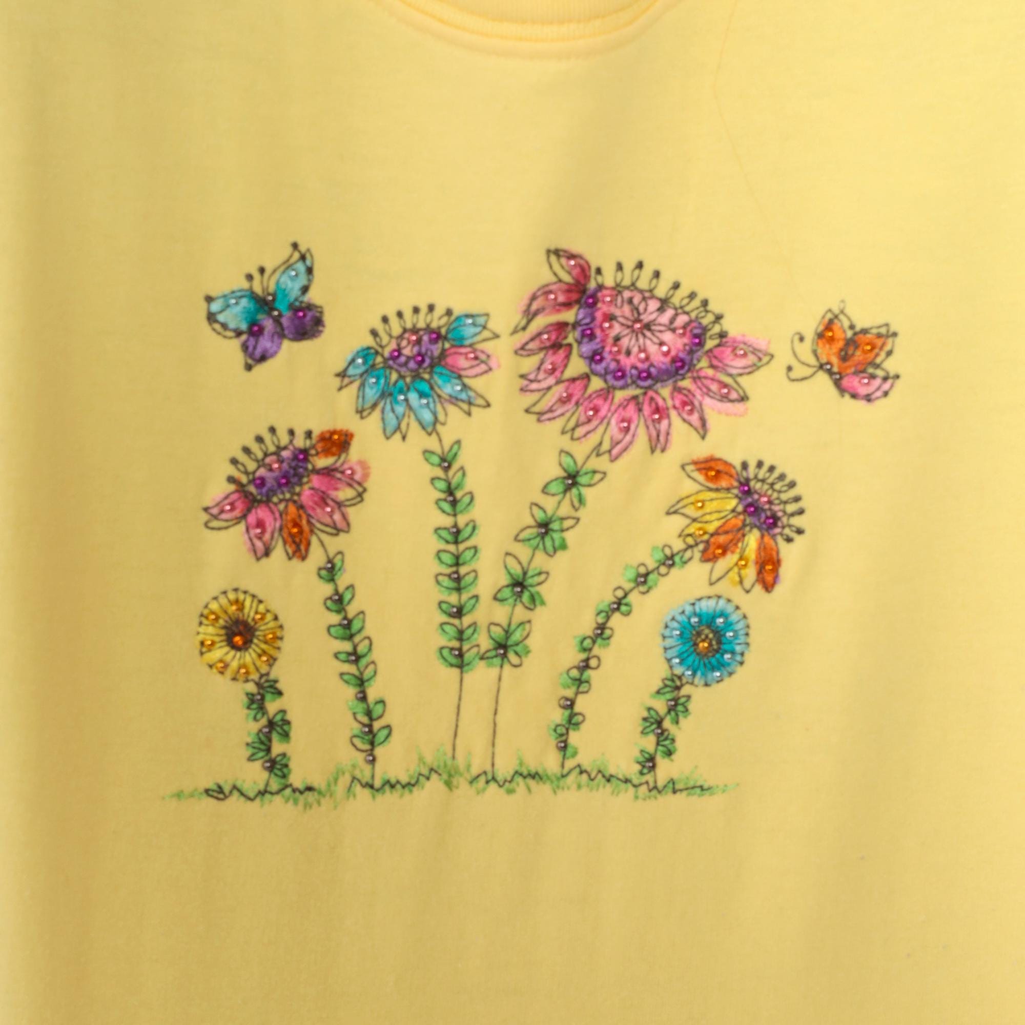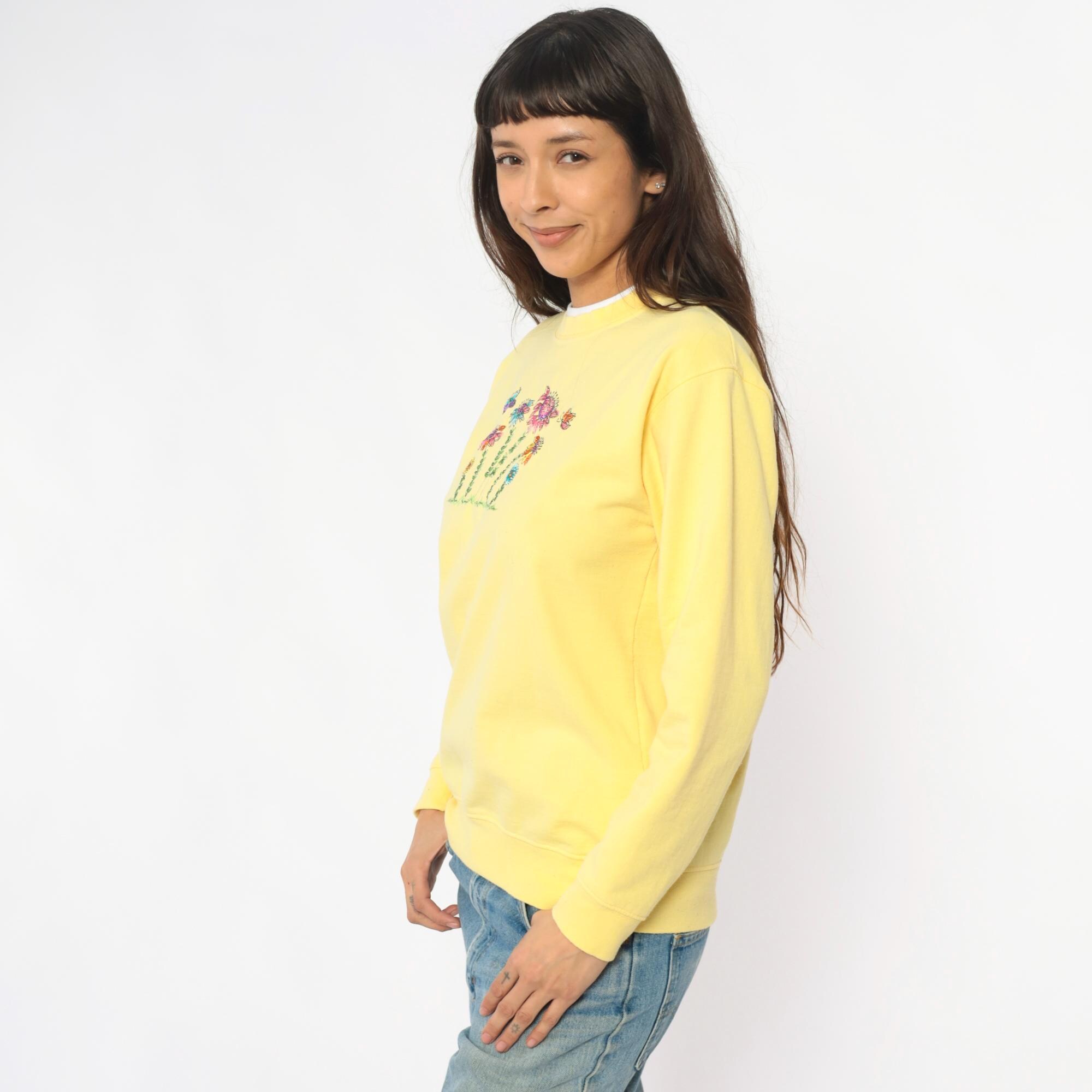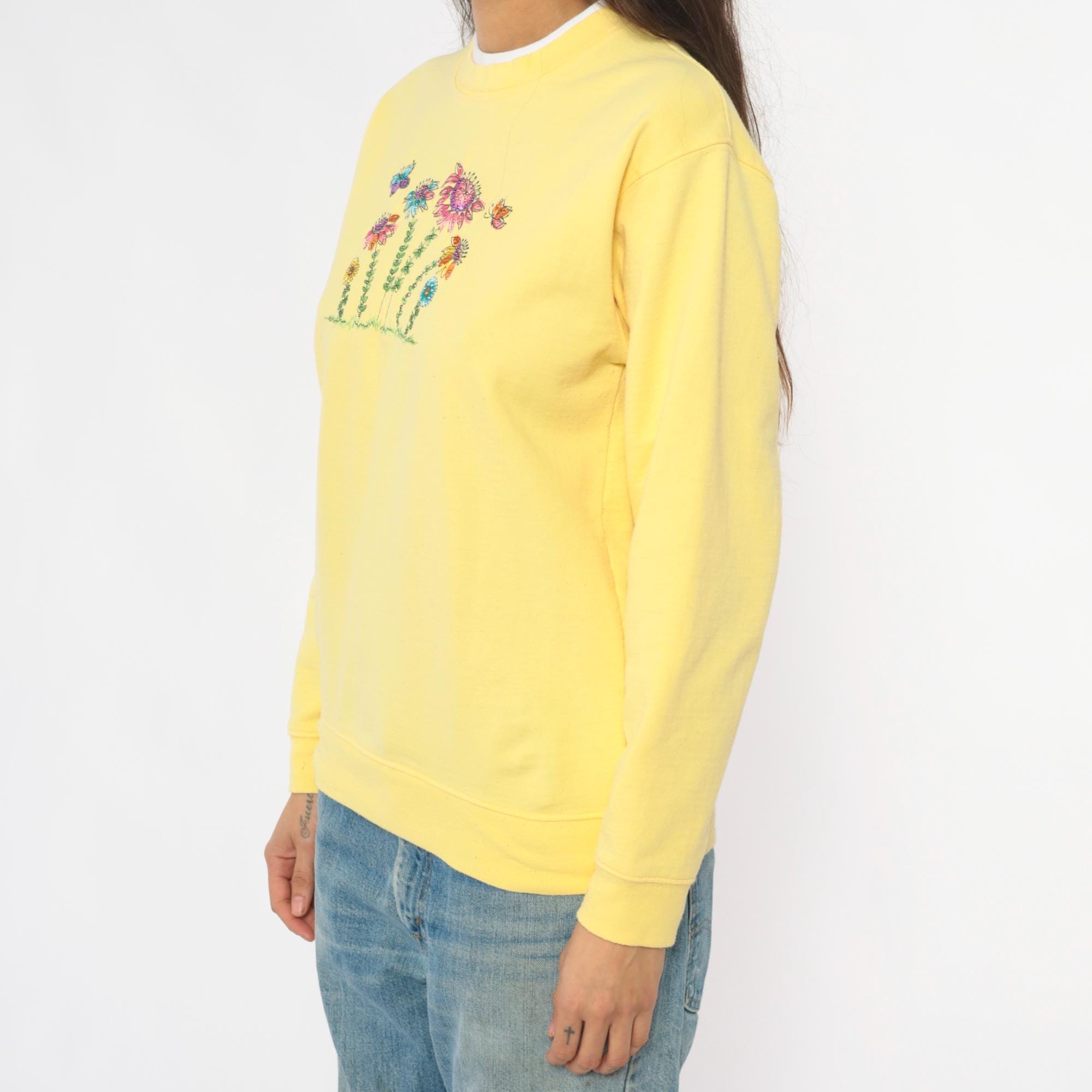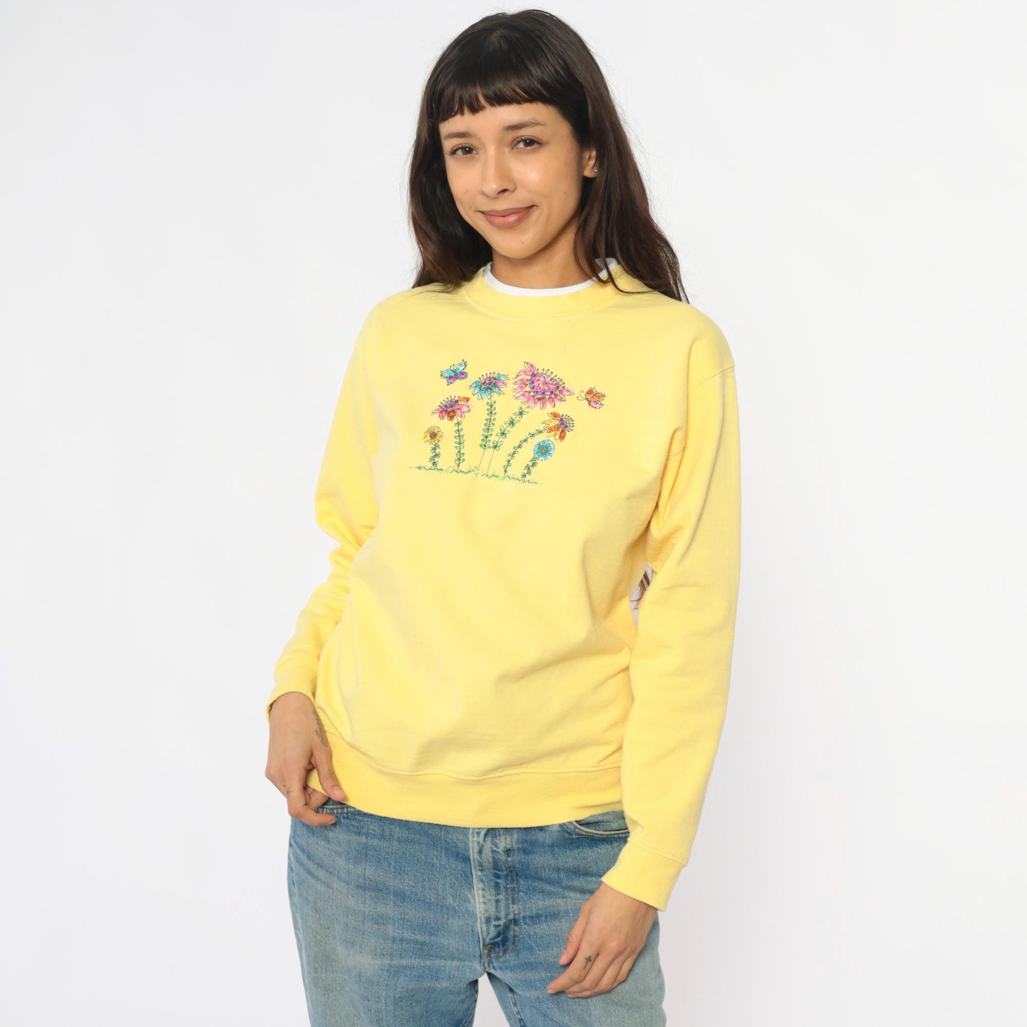 90s pale yellow sweatshirt with embroidered floral and butterfly design across the front. Pink, purple, blue, and yellow flowers with green stems and leaves, butterflies in blue and orange. White ringer trim at crew neckline, long sleeves.