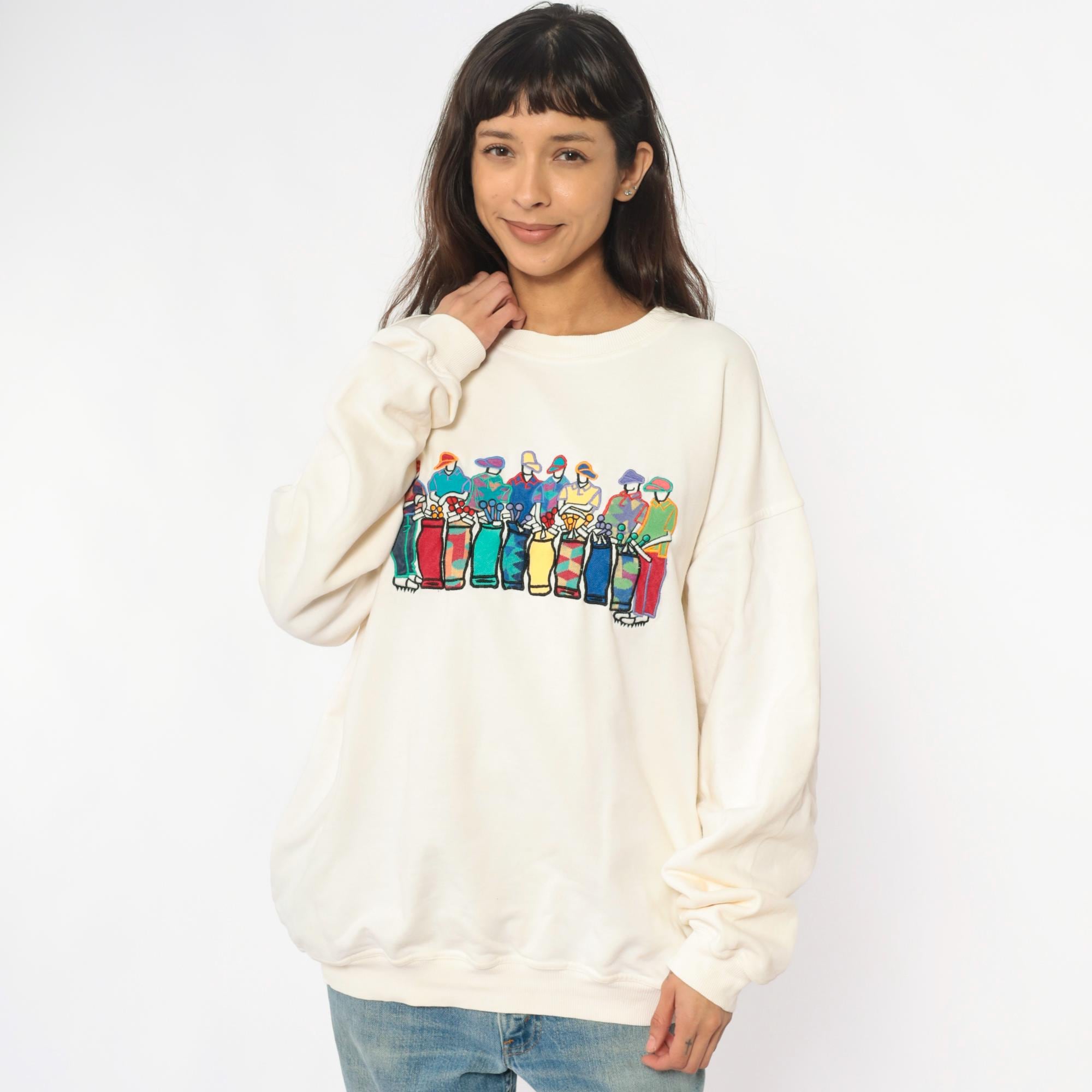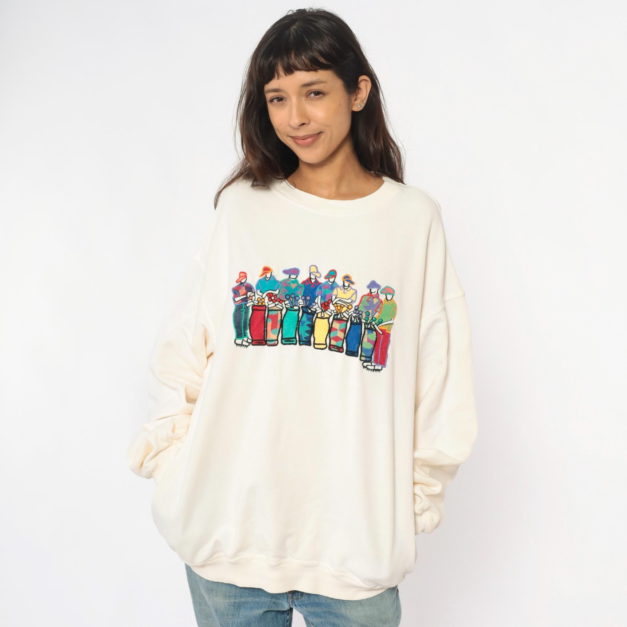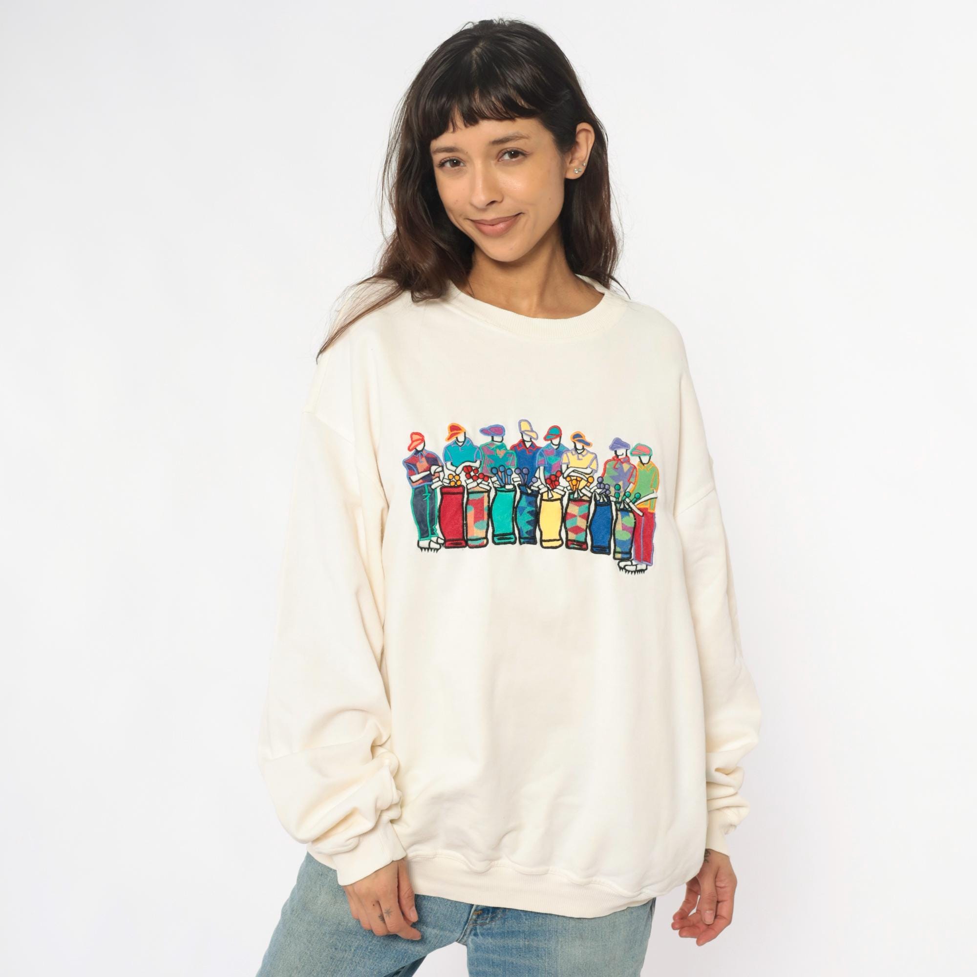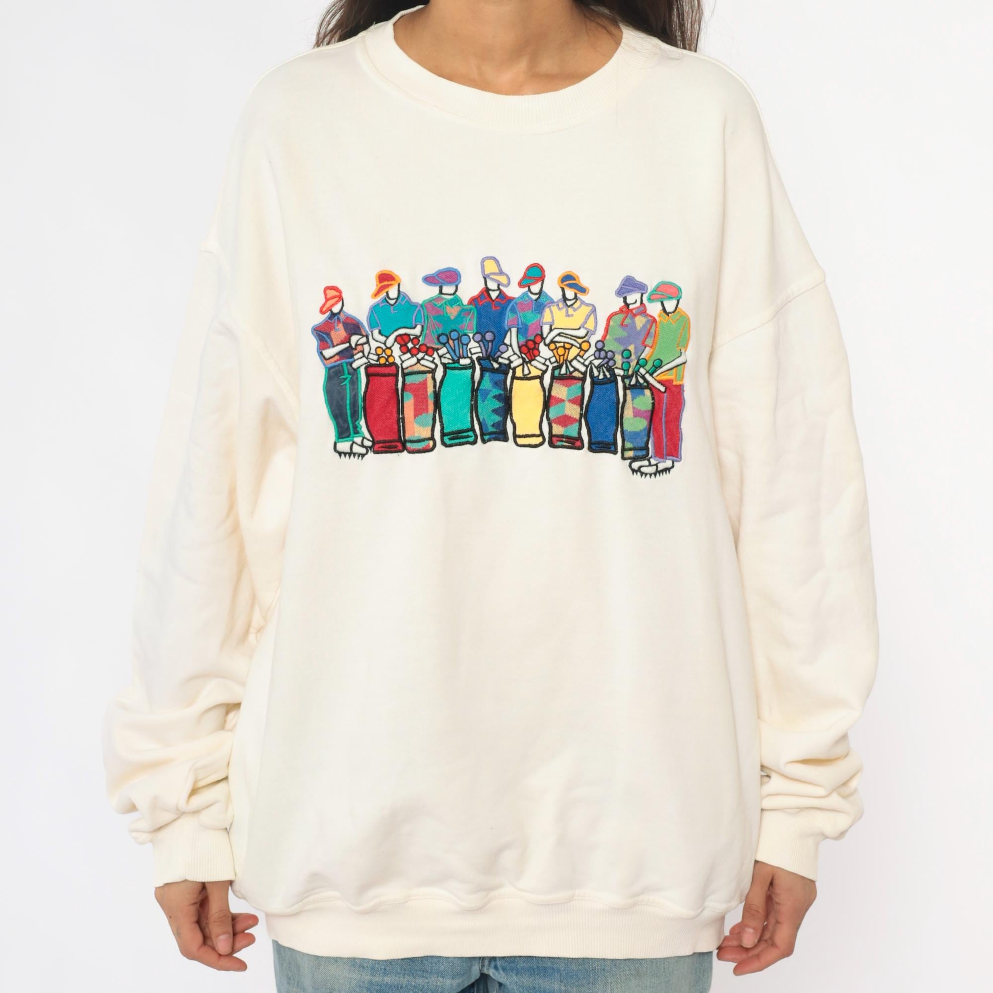 90s cream sweatshirt from pivot sportware with colorful golfer graphic across the front. Golfers depicted in turquoise, red, purple, yellow, blue, and green outfits holding golf clubs. Crew neckline, long sleeves, ribbed cuffs and hem.