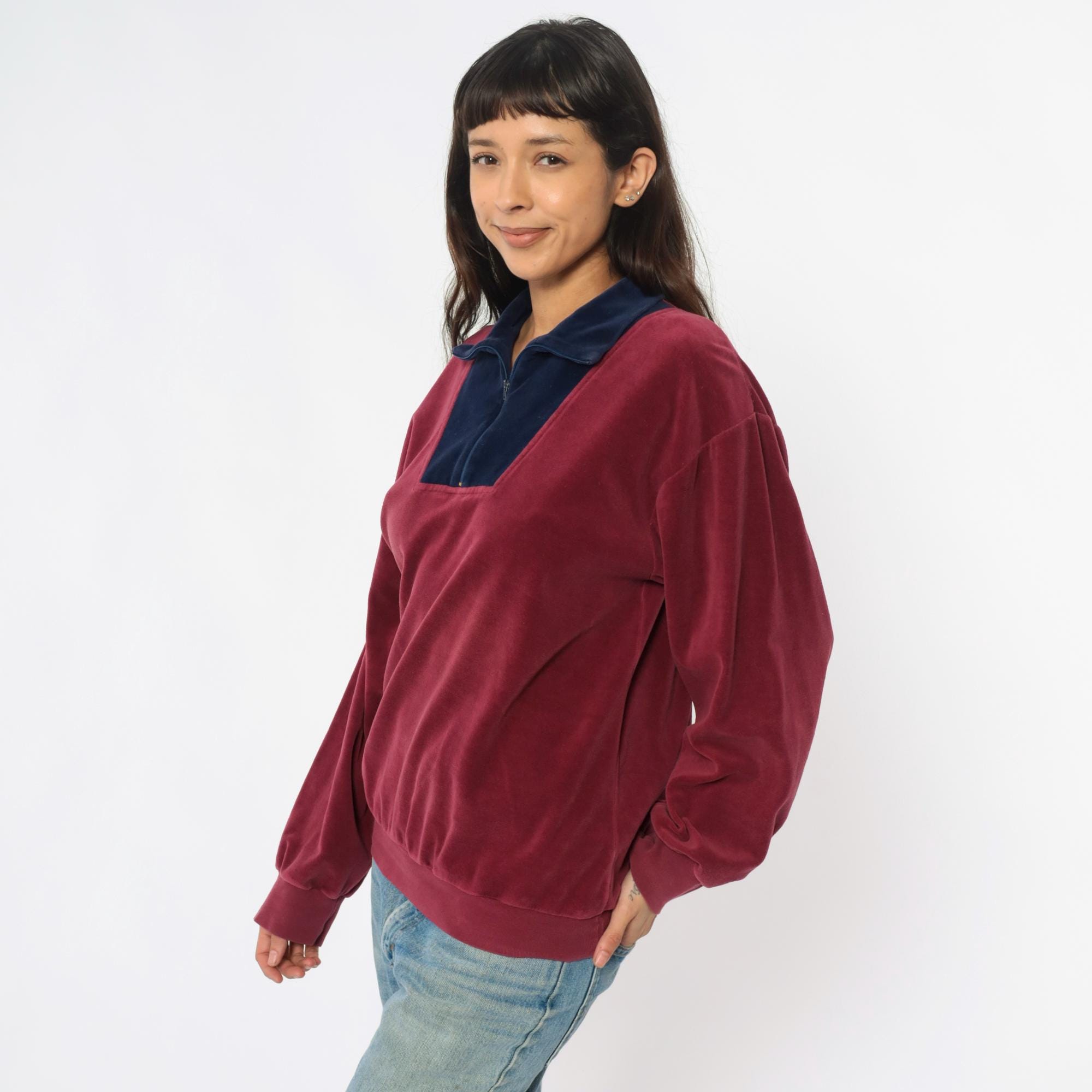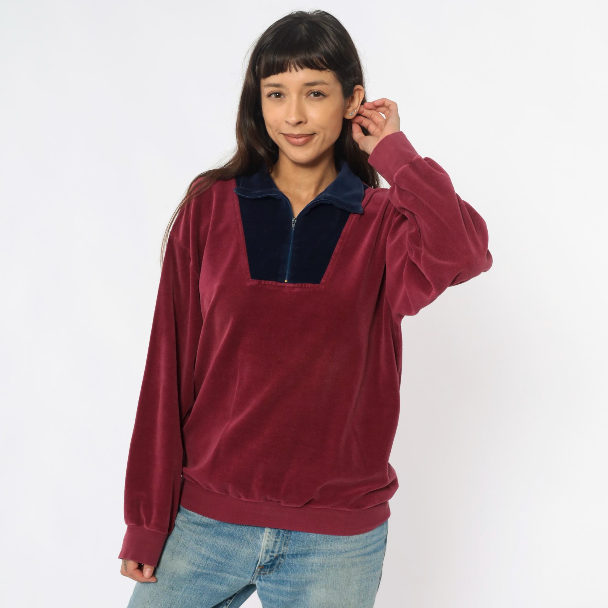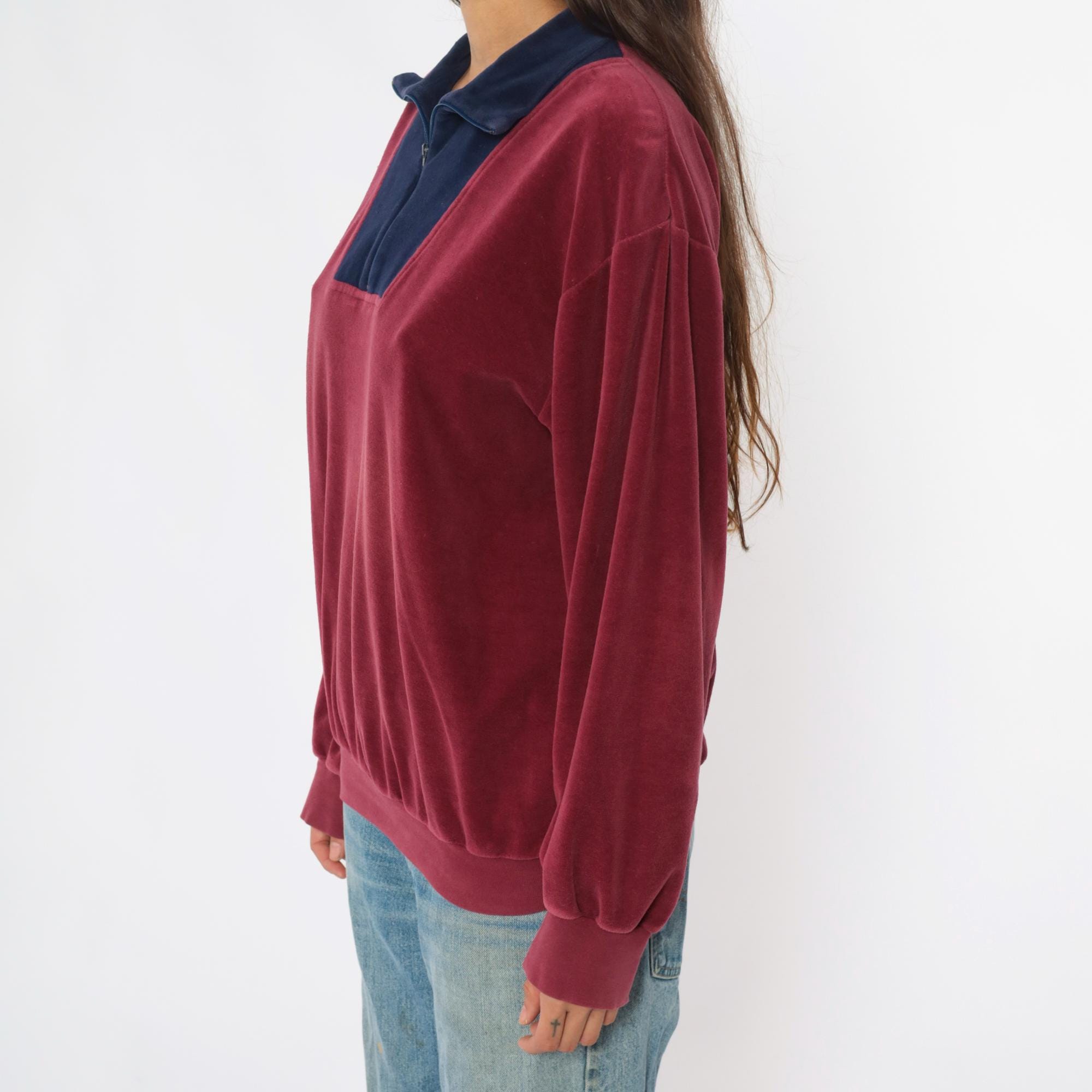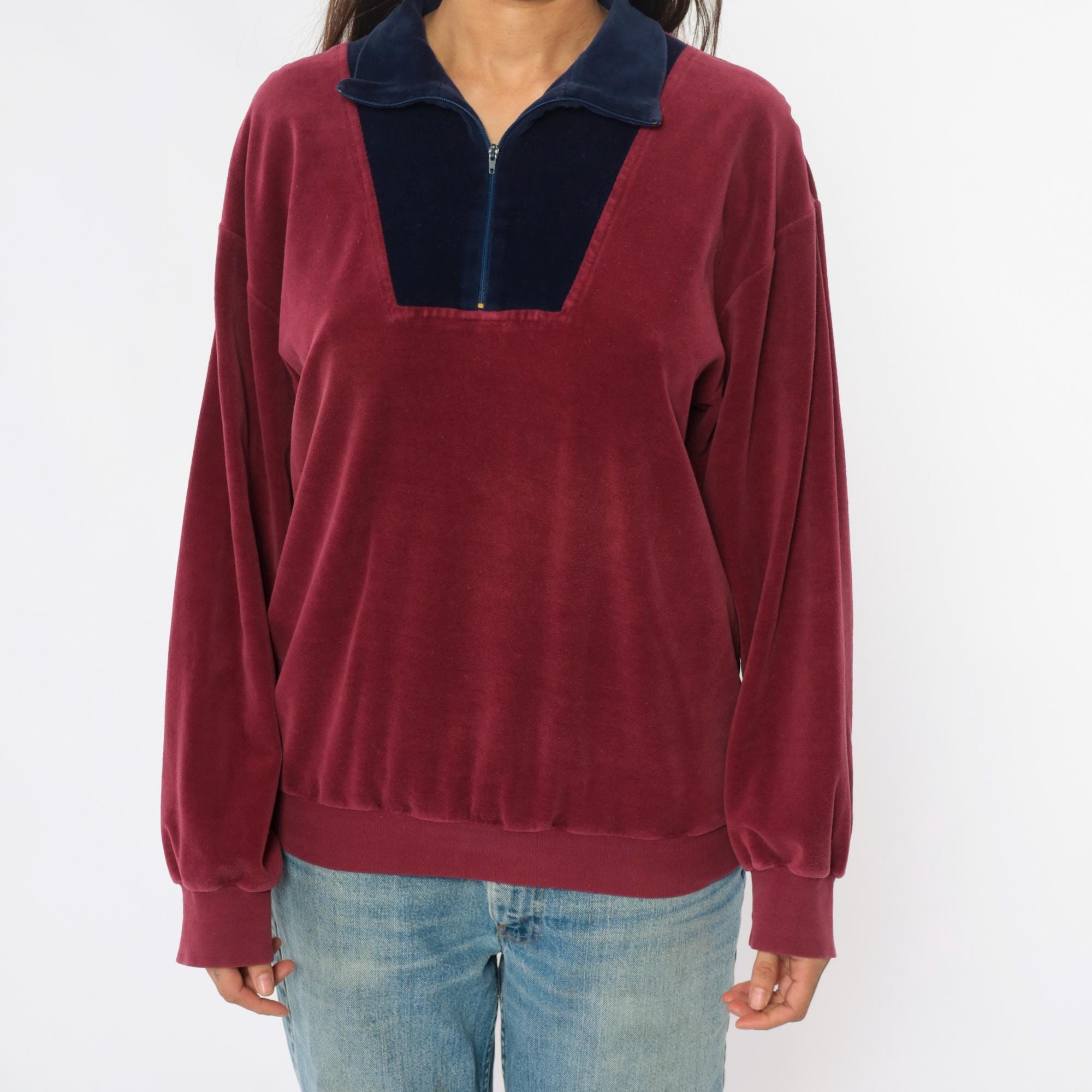 80s burgundy and navy blue velour pullover with color-blocked front panel and partial zipper closure. Navy blue collar, long sleeves with ribbed cuffs, ribbed hem. Wine-colored body with contrasting navy front section.