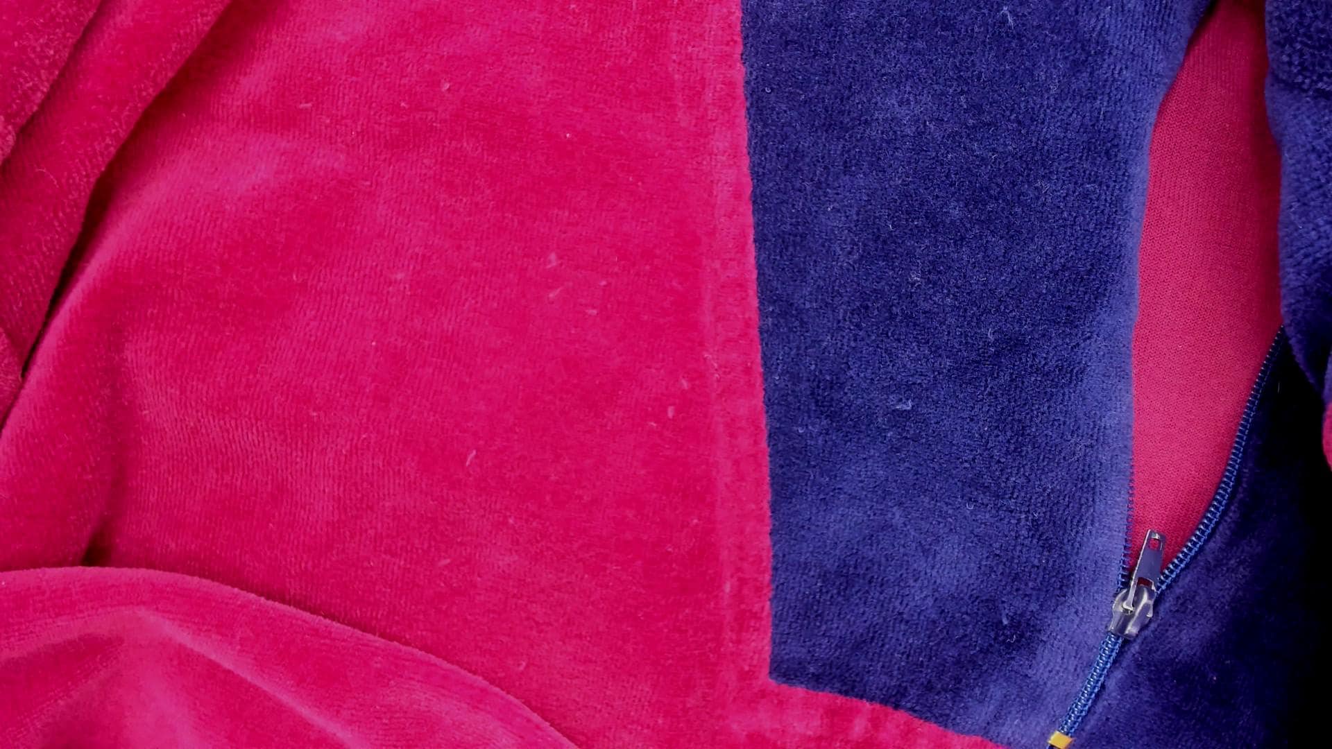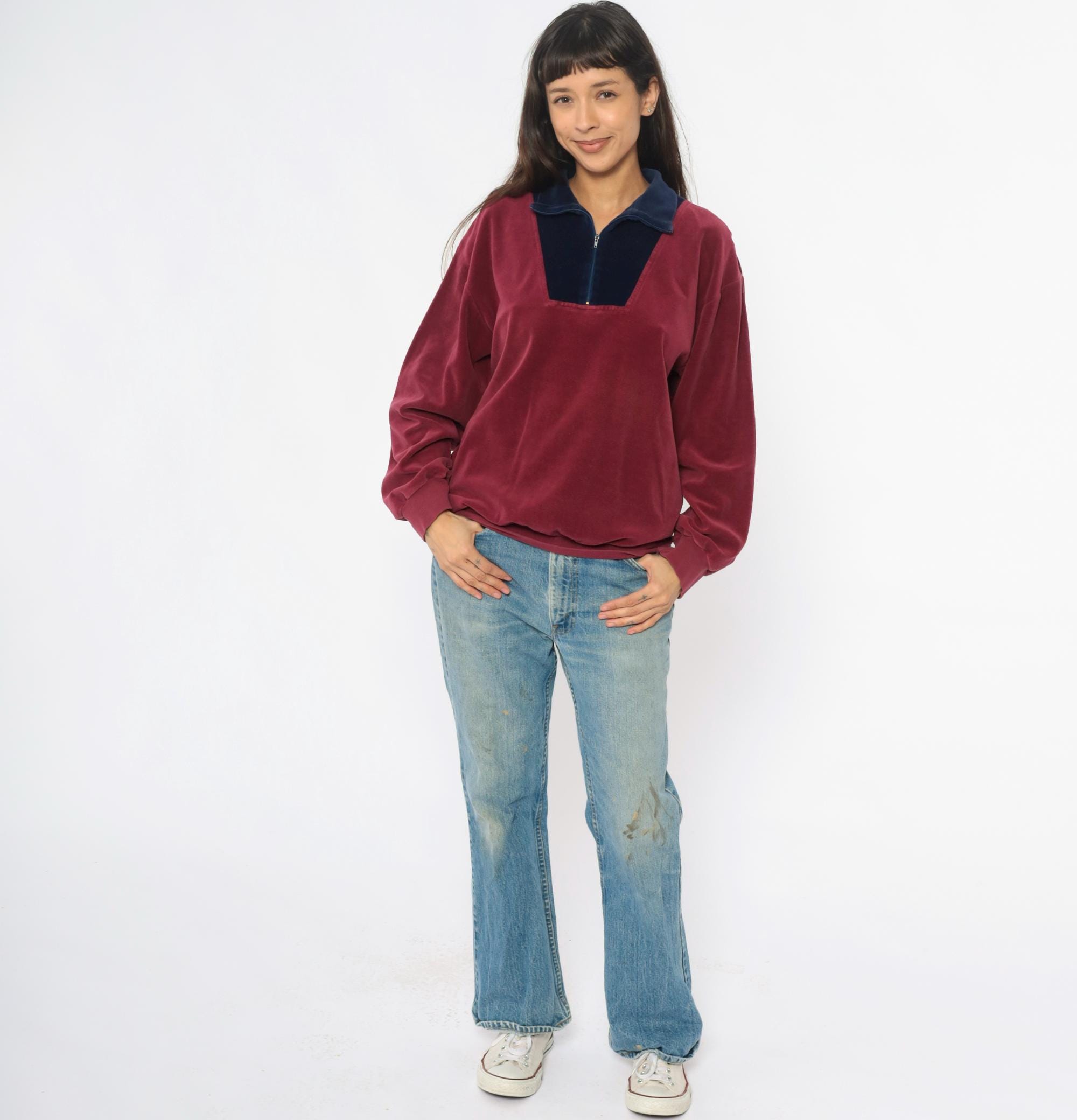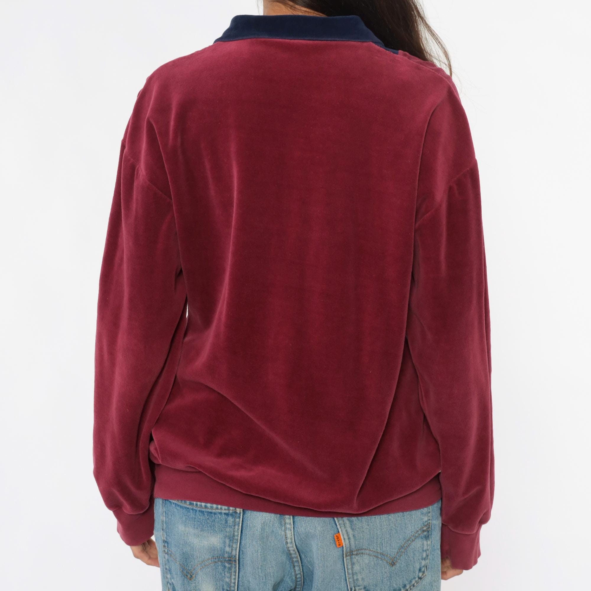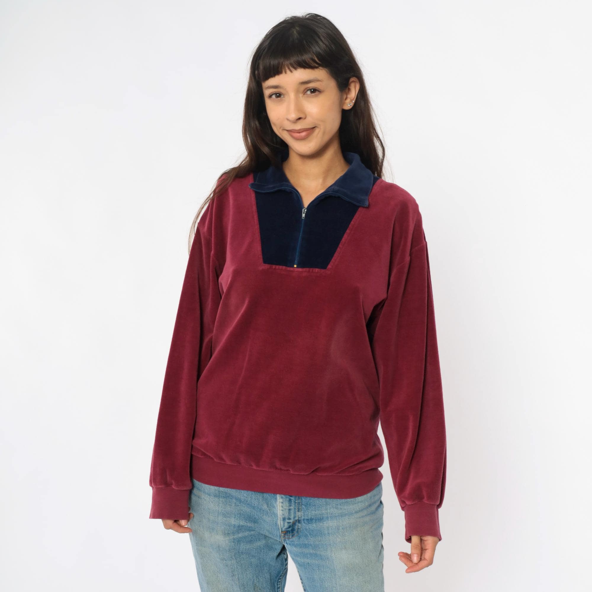 80s burgundy and navy blue velour pullover with color-blocked front panel and partial zipper closure. Navy blue collar, long sleeves with ribbed cuffs, ribbed hem. Wine-colored body with contrasting navy front section.