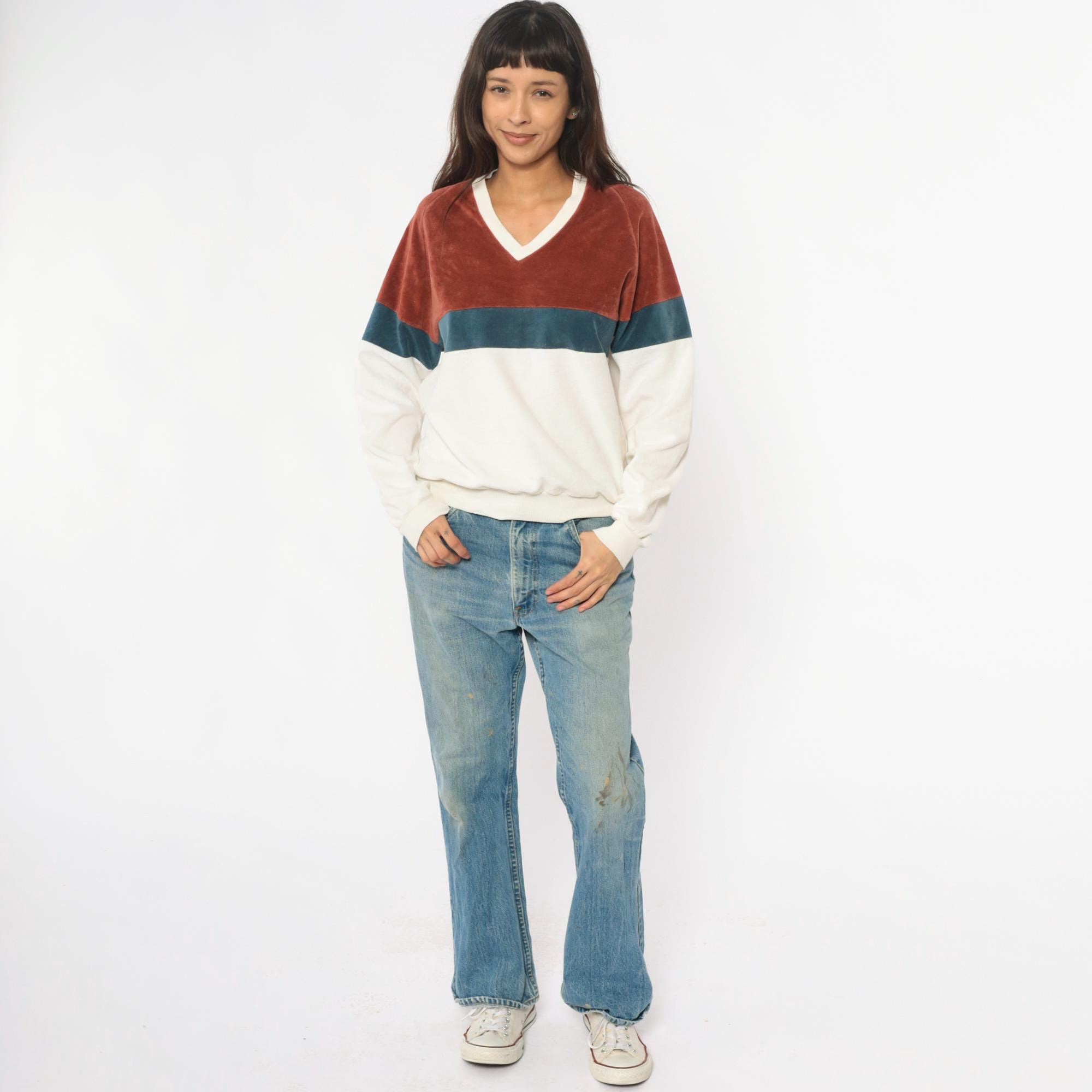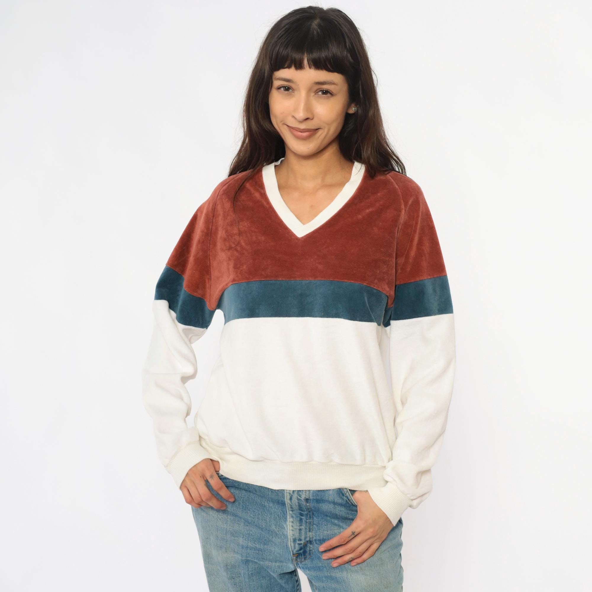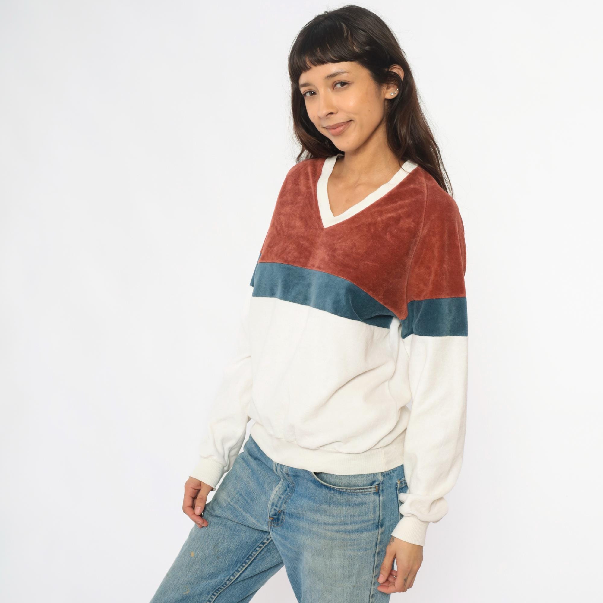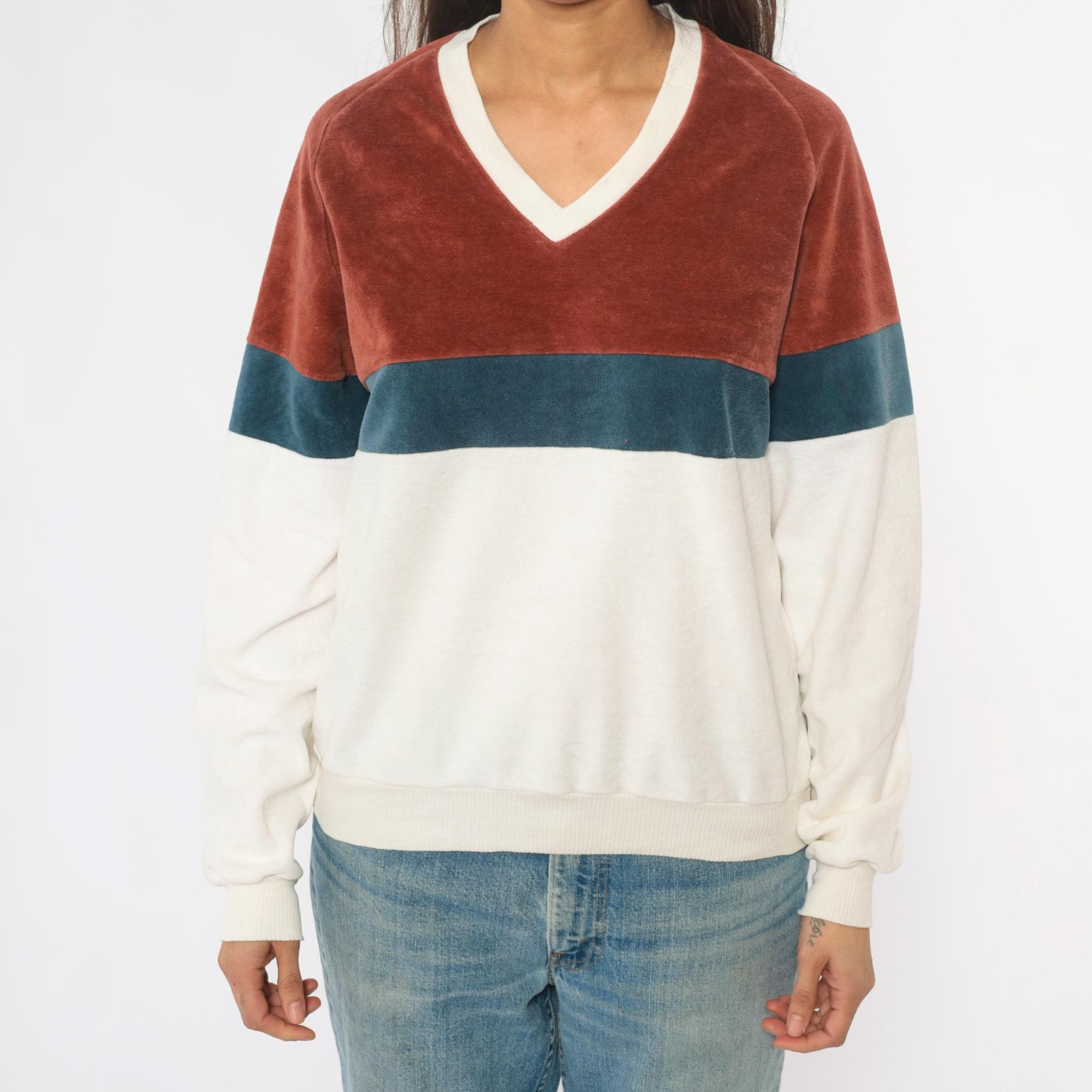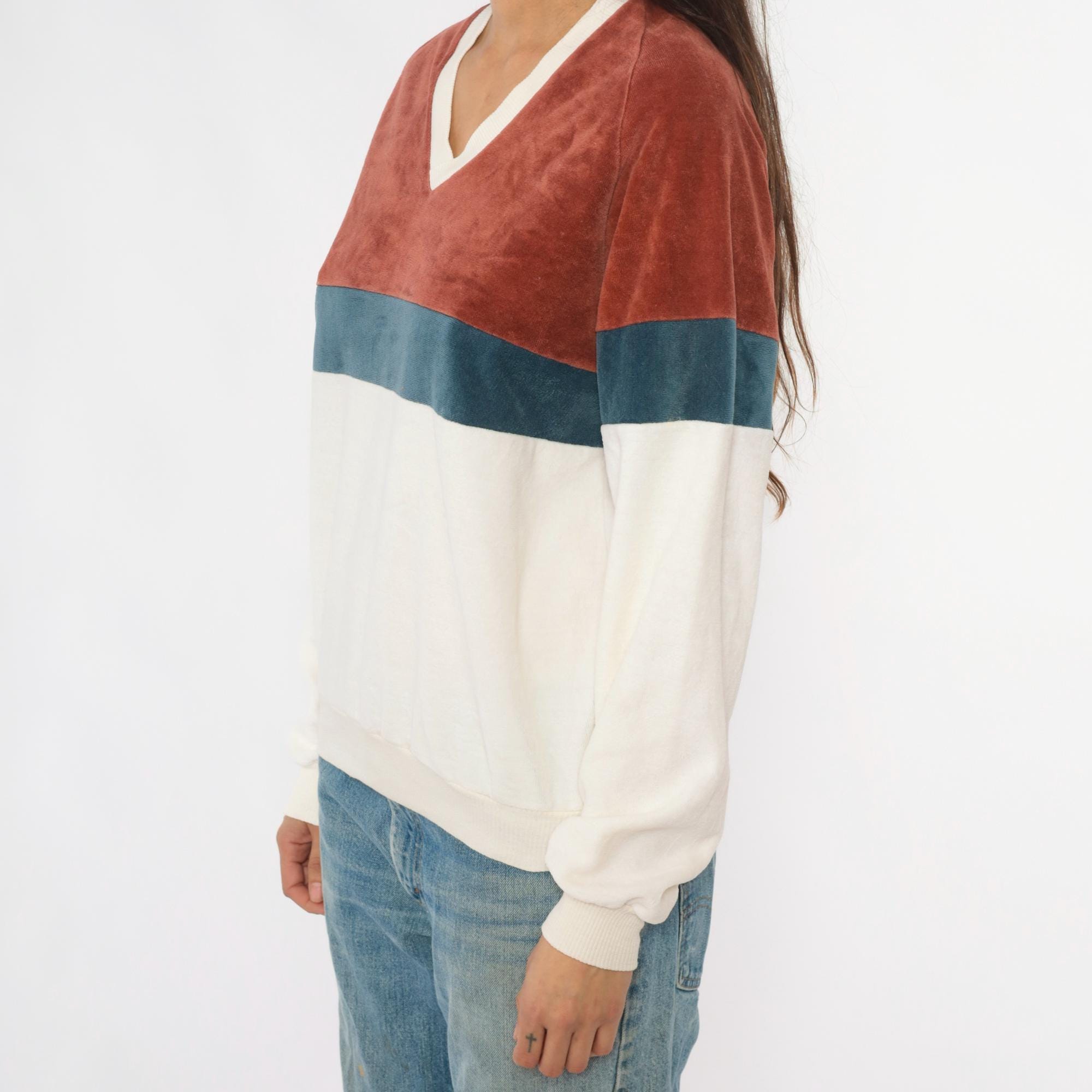 80s color blocked velour sweatshirt from expressions in rust brown, teal blue, and cream with matching raglan sleeves. V-neckline with contrast cream trim, ribbed cuffs and hem.