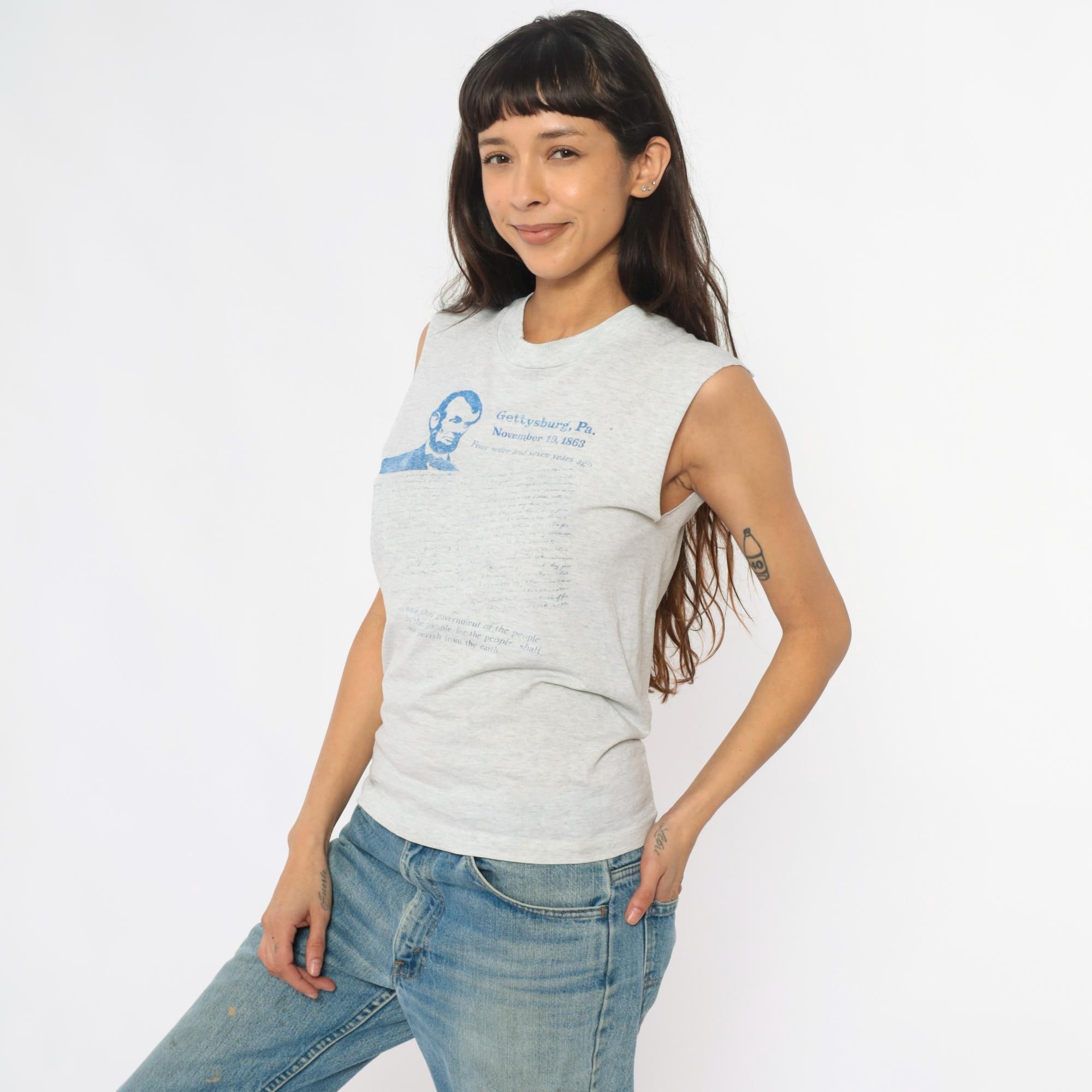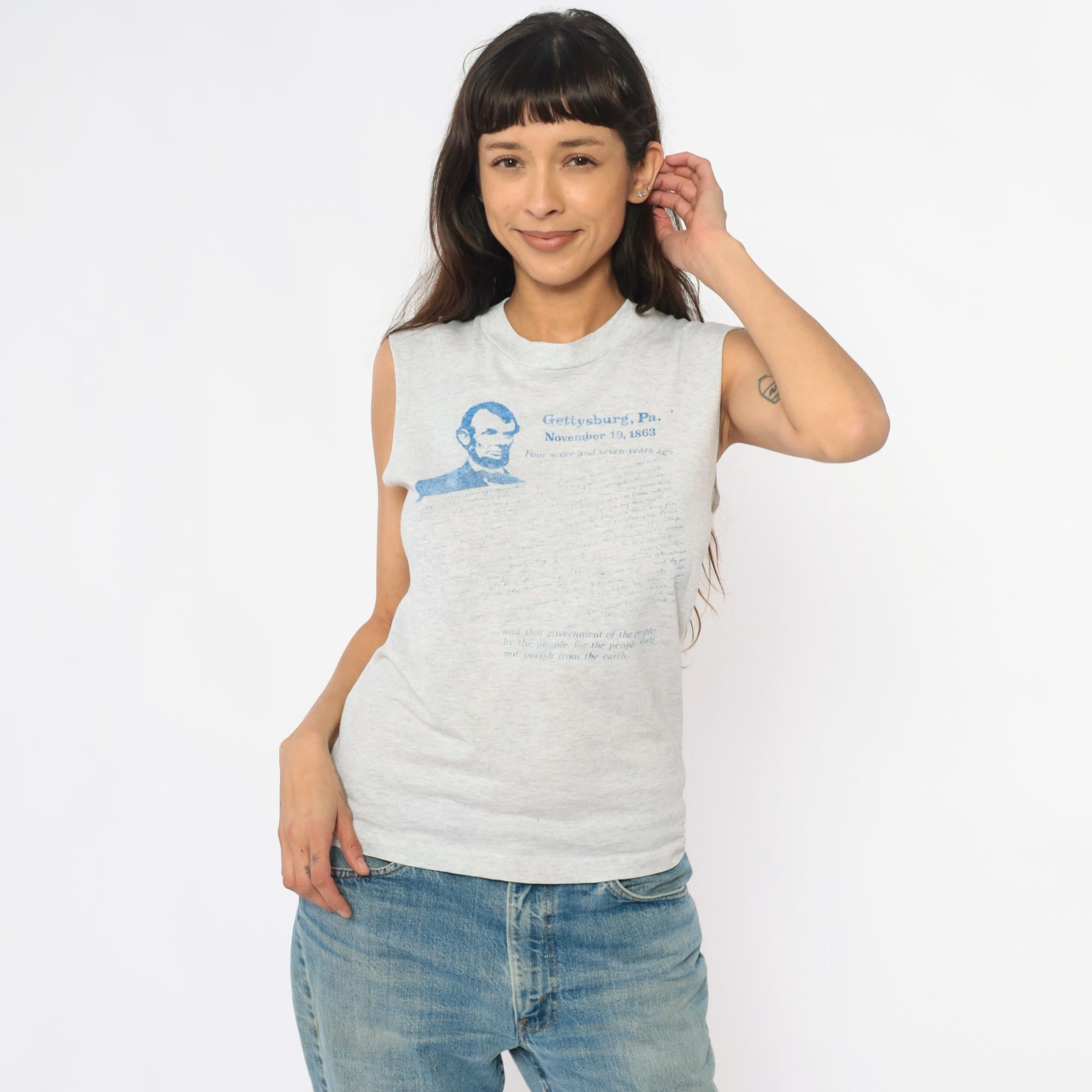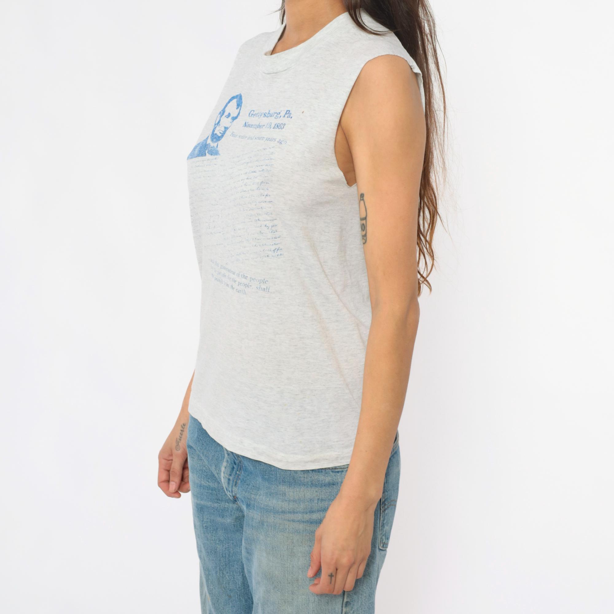 90s gray heathered sleeveless tank with Gettysburg Address graphic print in blue. Abraham Lincoln portrait and text reading "Gettysburg, Pa. November 19, 1863" with the full speech text printed below. Crew neckline and raw, unfinished sleeve edges.