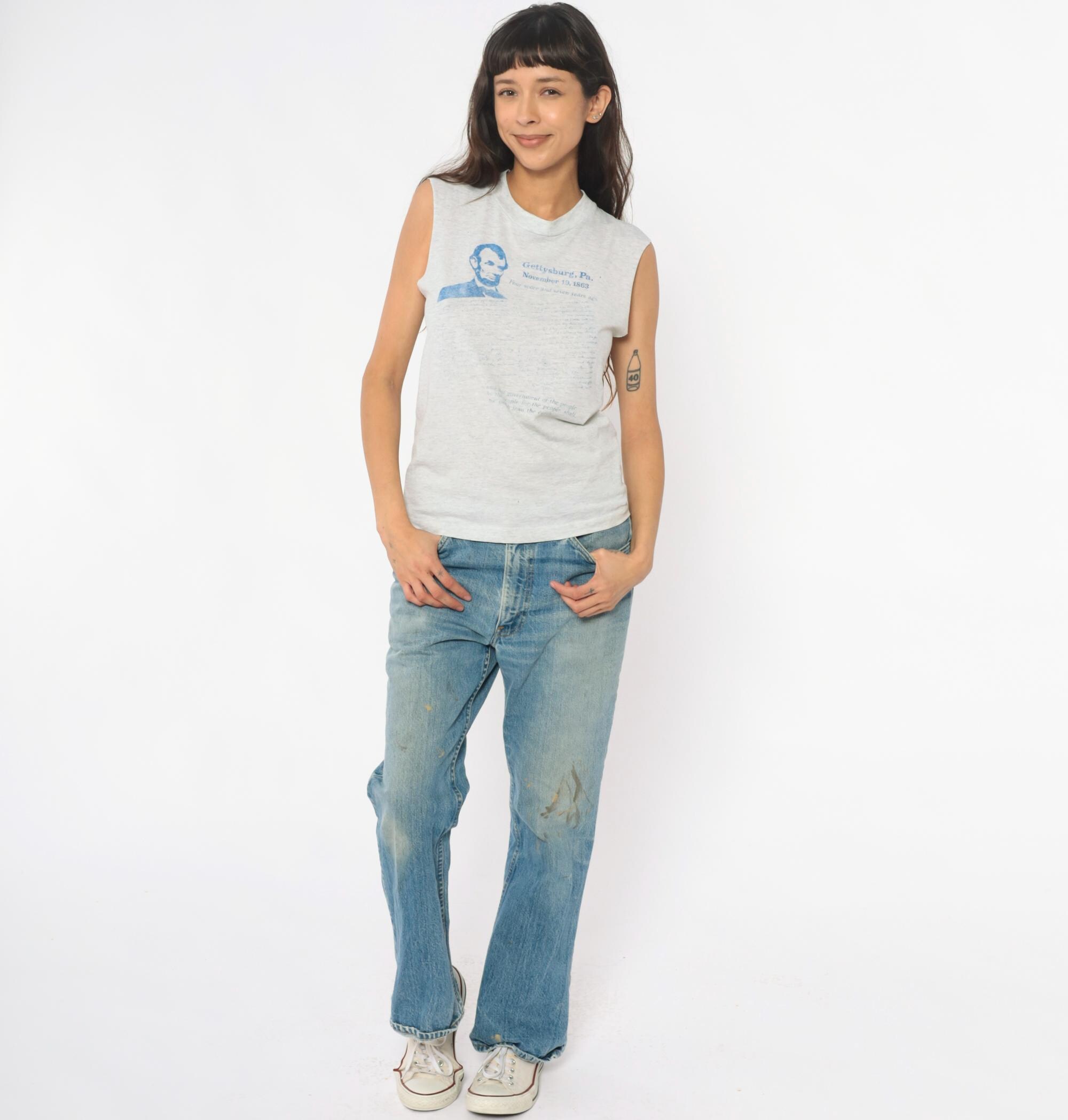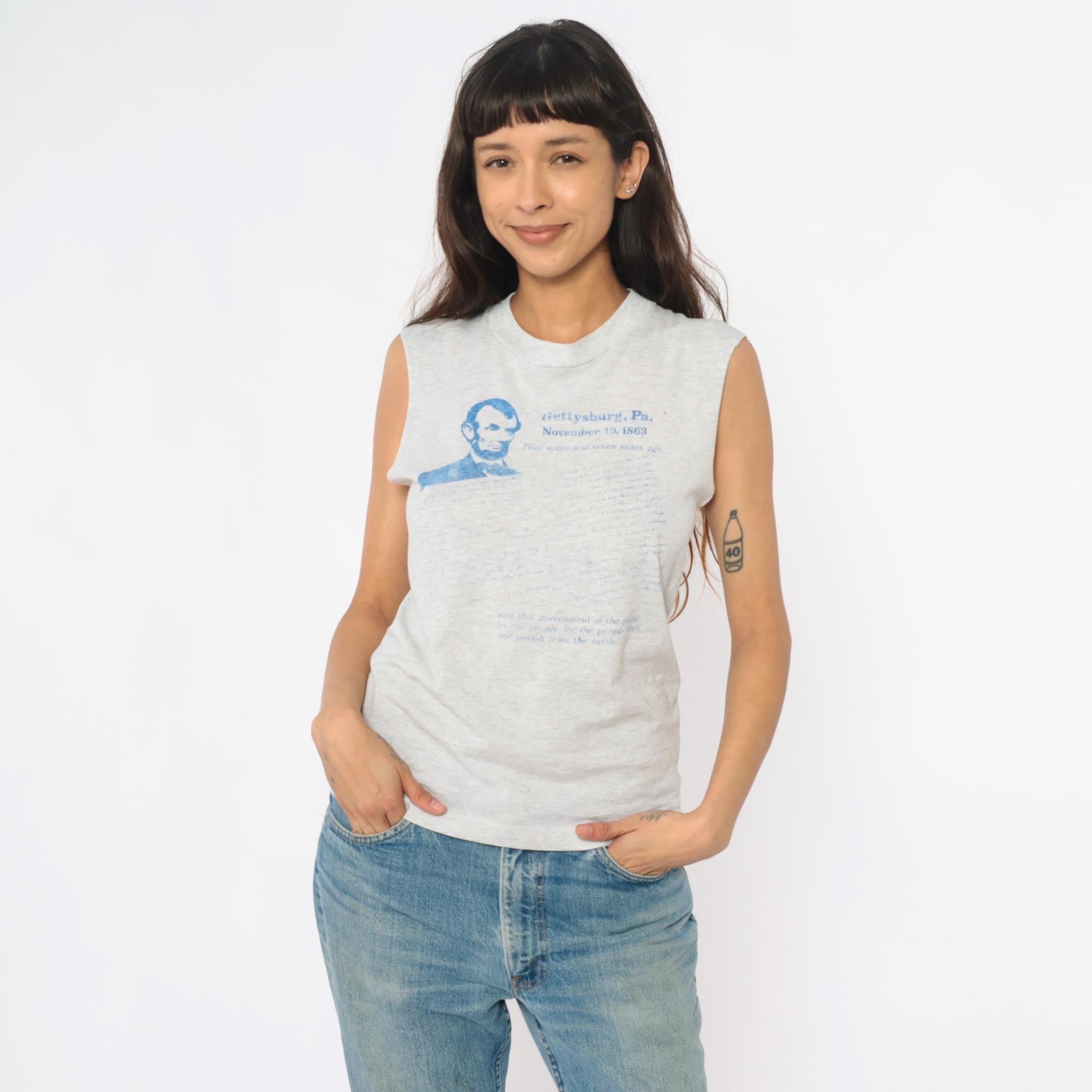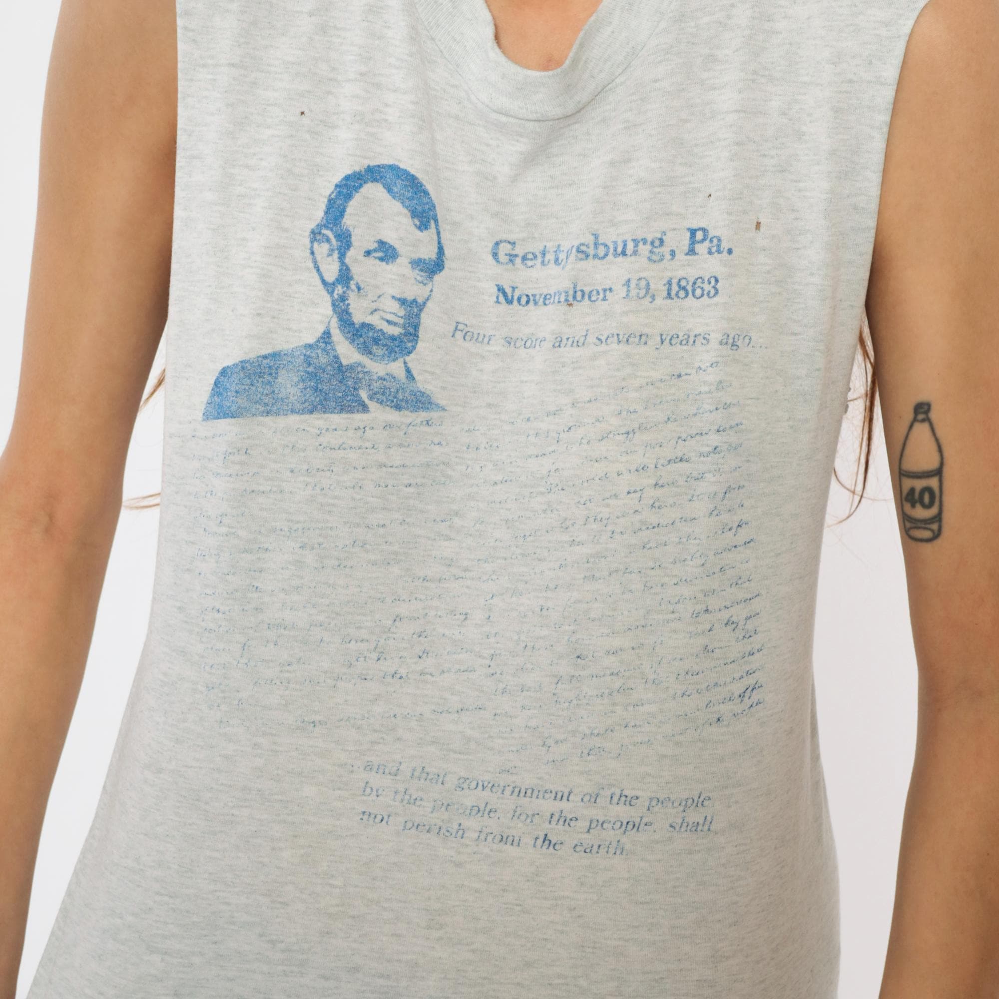 90s gray heathered sleeveless tank with Gettysburg Address graphic print in blue. Abraham Lincoln portrait and text reading "Gettysburg, Pa. November 19, 1863" with the full speech text printed below. Crew neckline and raw, unfinished sleeve edges.