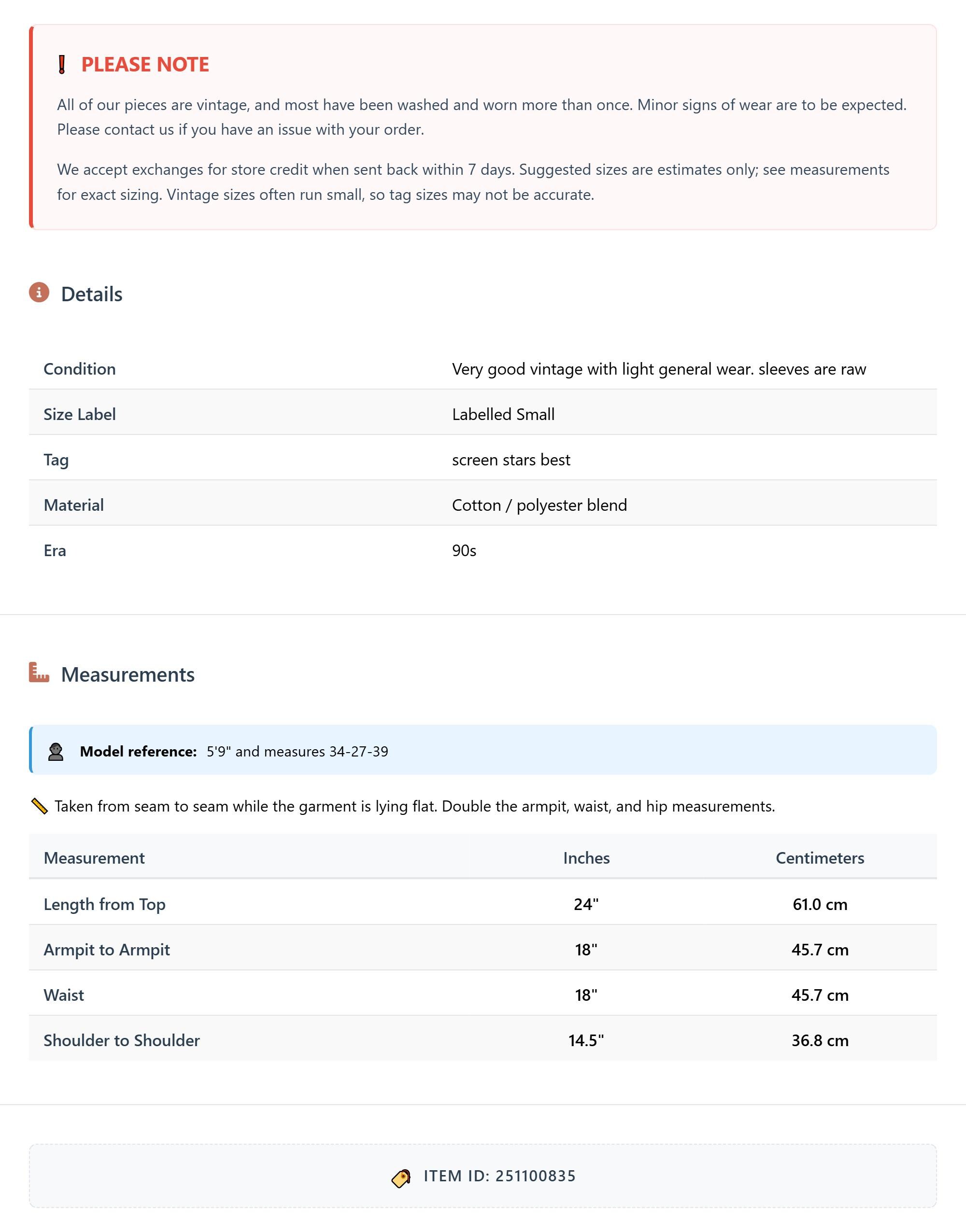 All of our pieces are vintage, and most have been washed and worn more than once. Minor signs of wear are to be expected. Please contact us if you have an issue with your order. We accept exchanges for store credit when sent back within 7 days.