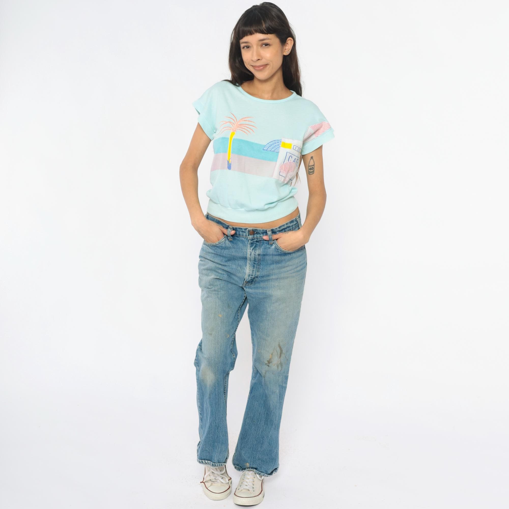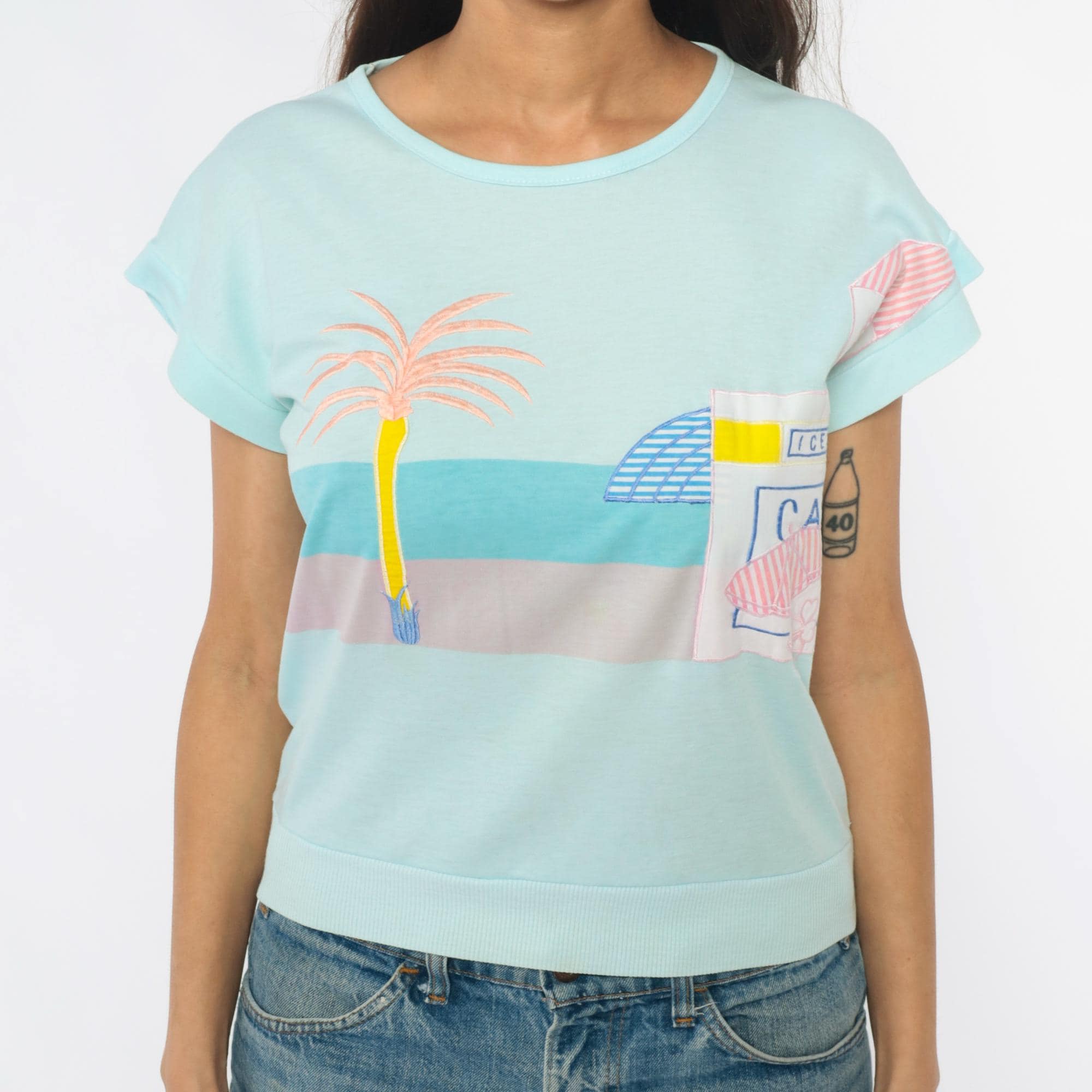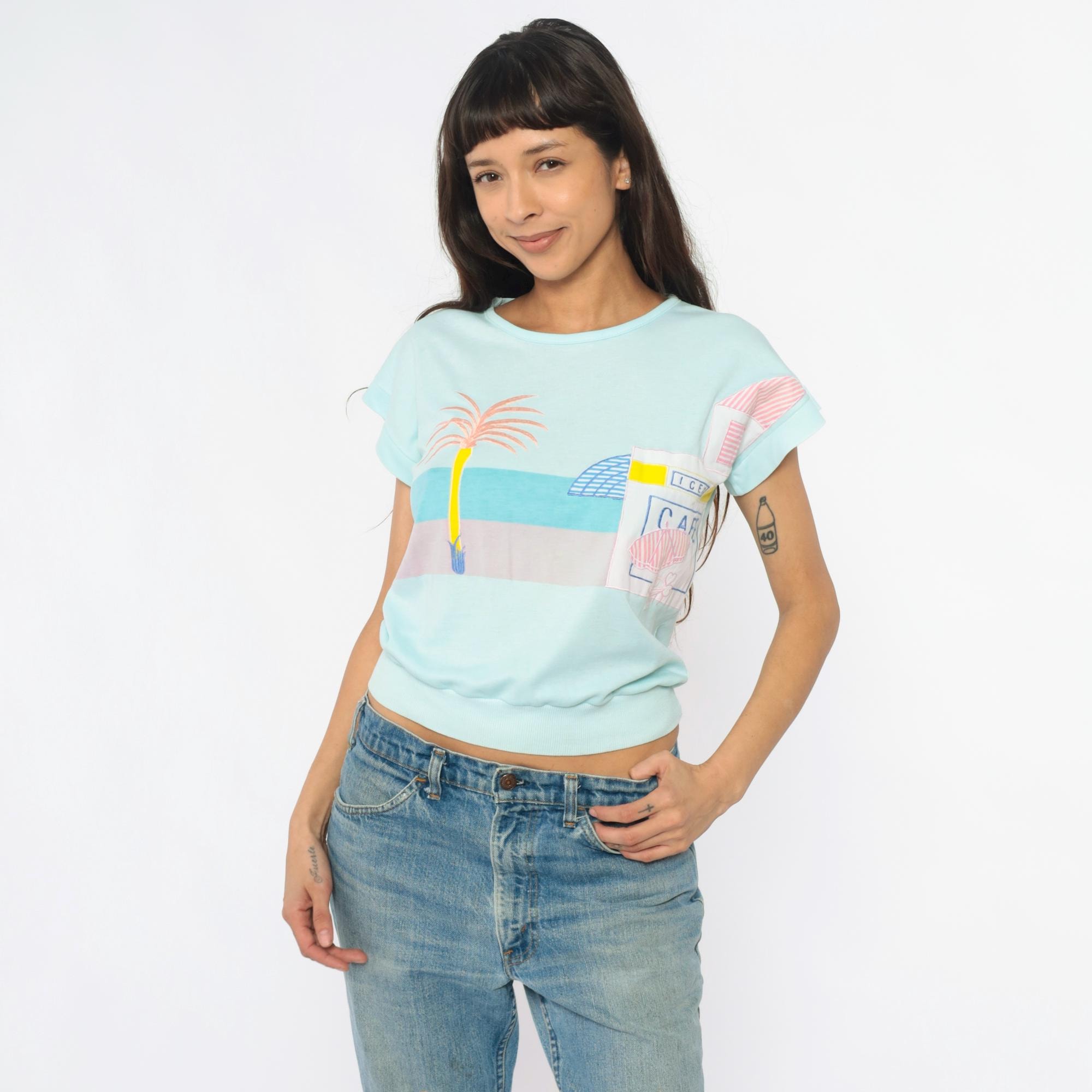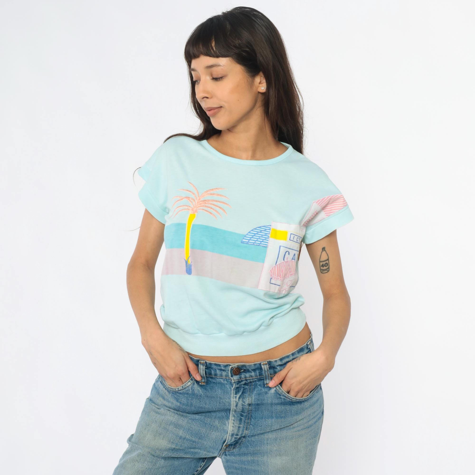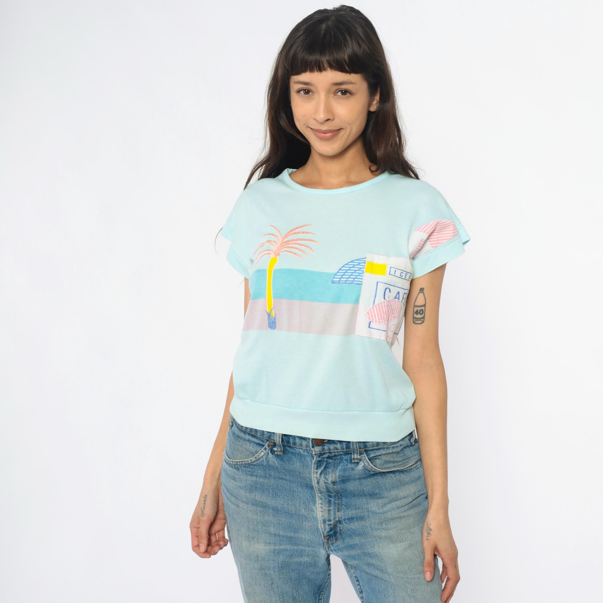 80s mint blue short sleeve sweatshirt with chest pocket featuring a beach cafe graphic design including a palm tree, striped umbrella, cafe sign, and bottle in pink, blue, yellow, and white. Rolled short sleeves and ribbed hem band.