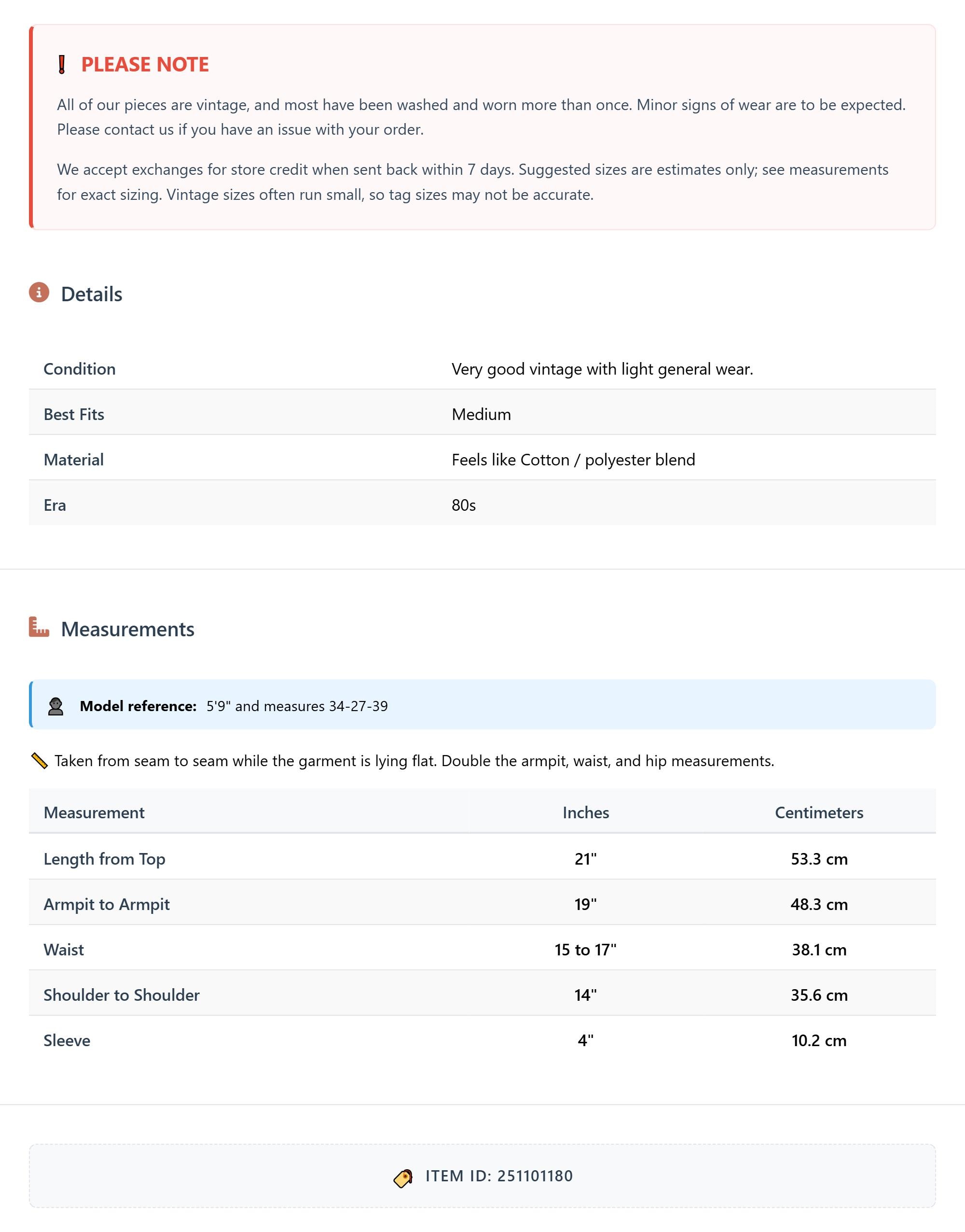 Suggested sizes are estimates only; see measurements for exact sizing. Vintage sizes often run small, so tag sizes may not be accurate.