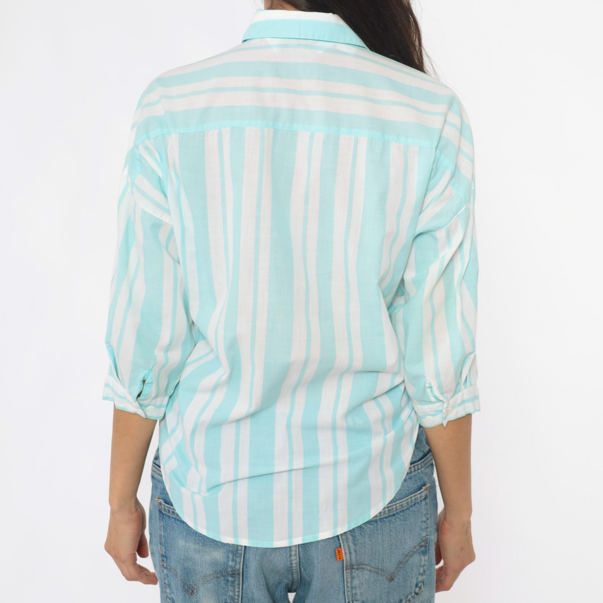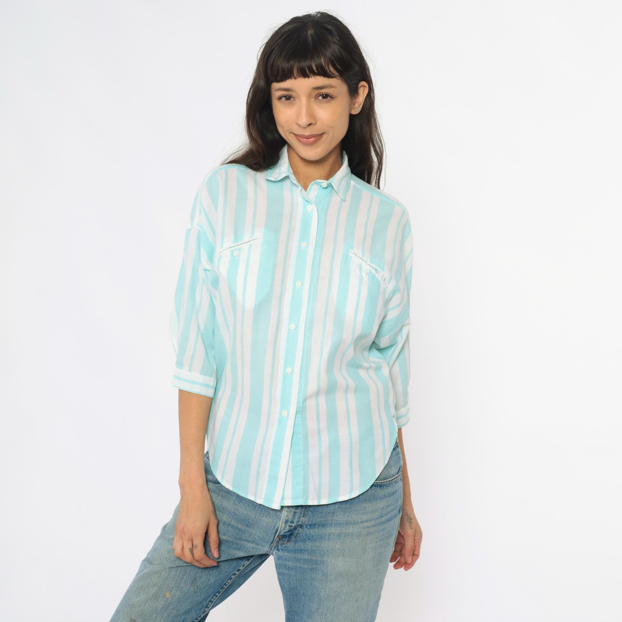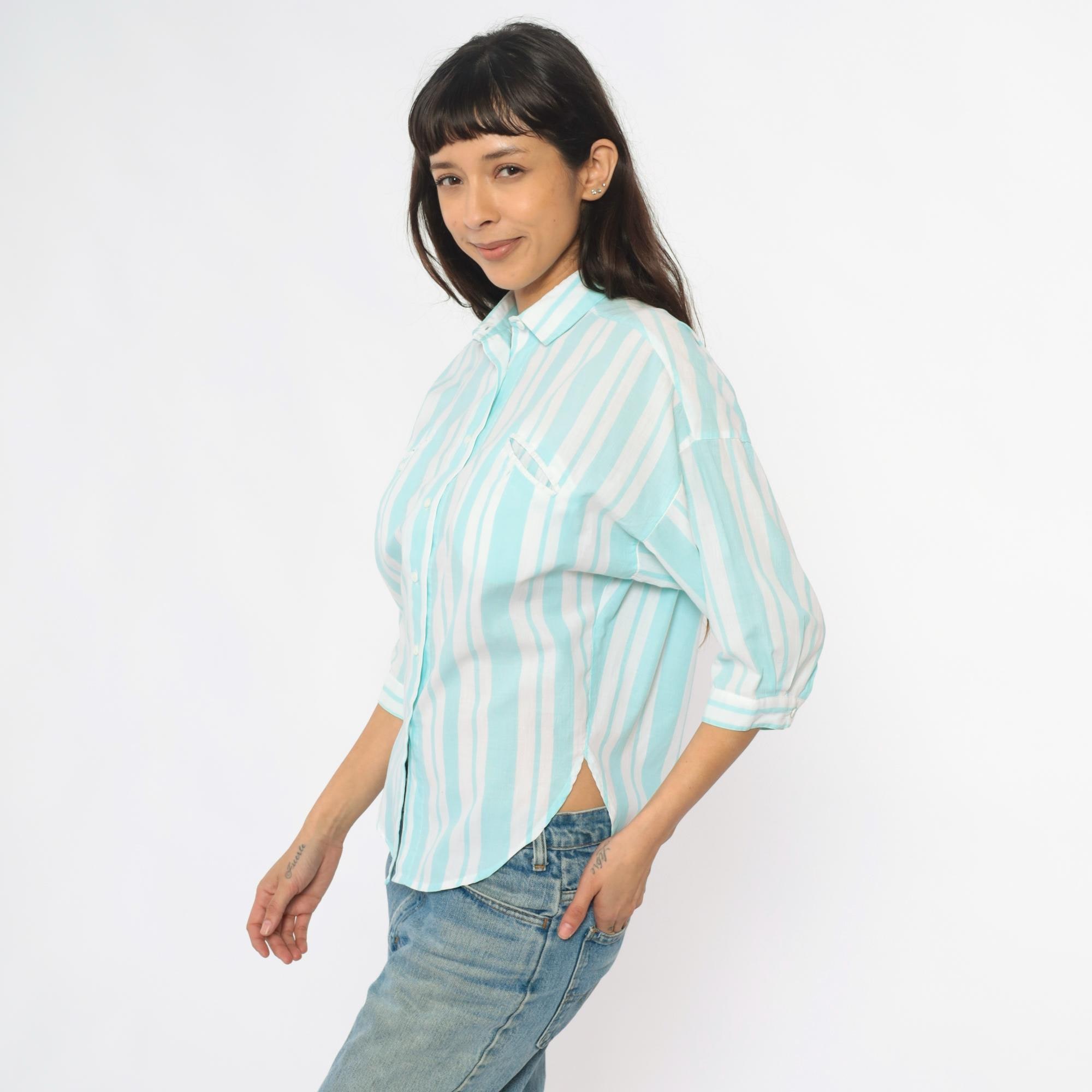 80s mint and white vertical striped button-up shirt from Diane von Furstenberg. Collared neckline with chest pockets, button front closure, three-quarter sleeves with rolled cuffs.