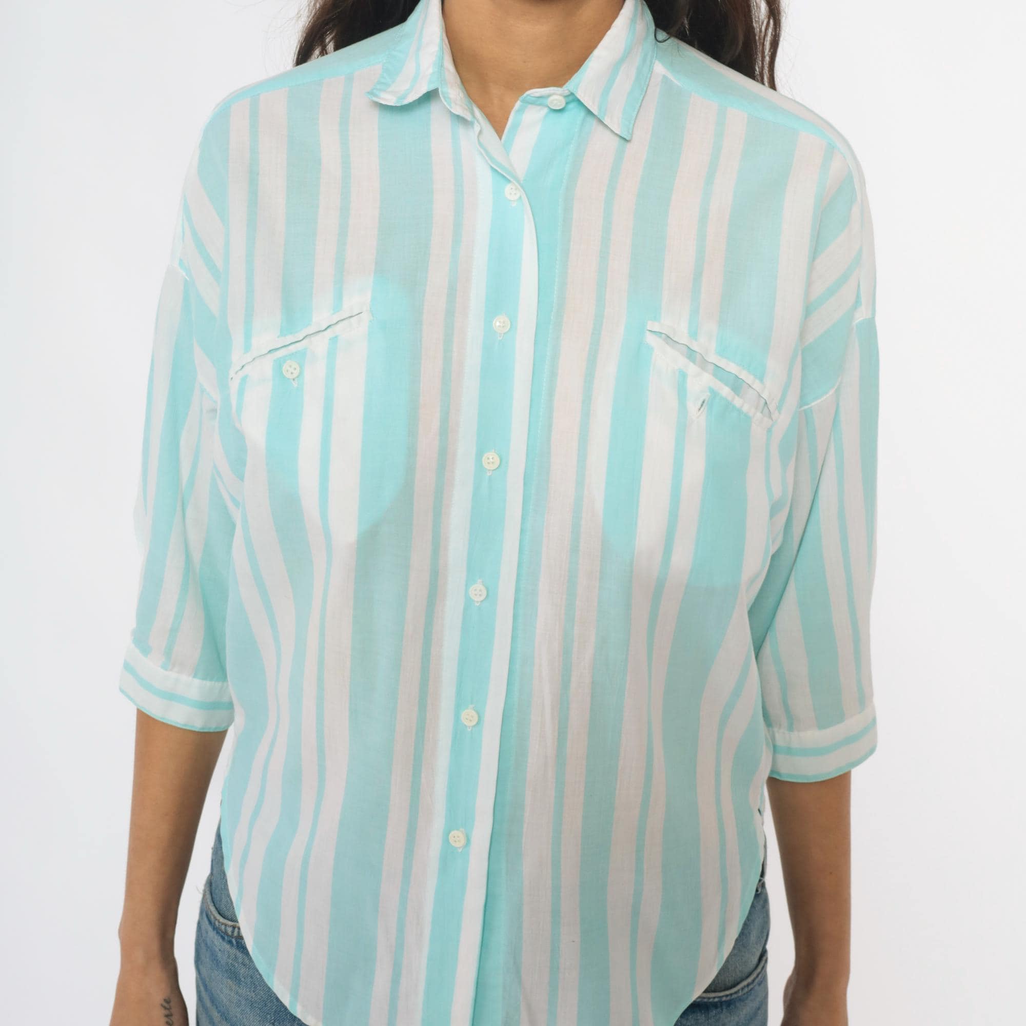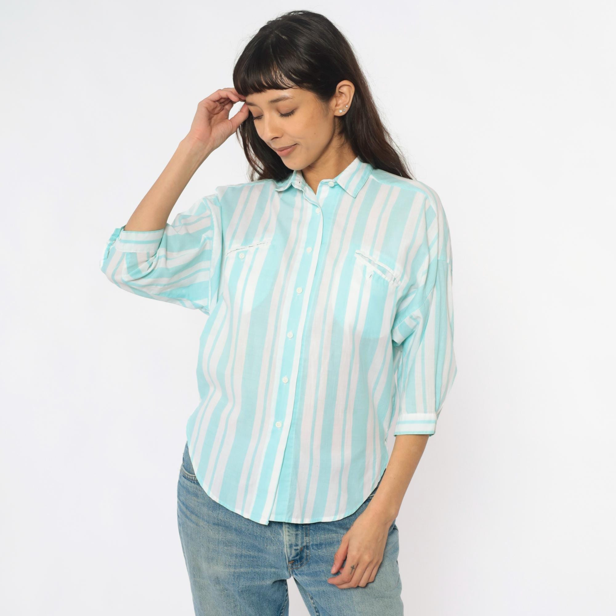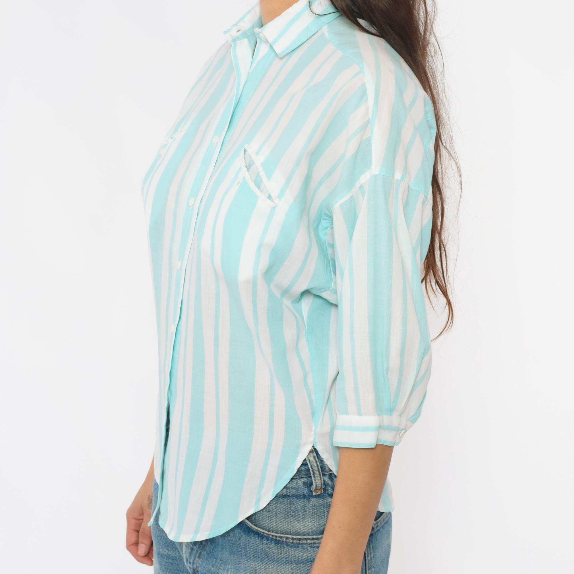 80s mint and white vertical striped button-up shirt from Diane von Furstenberg. Collared neckline with chest pockets, button front closure, three-quarter sleeves with rolled cuffs.