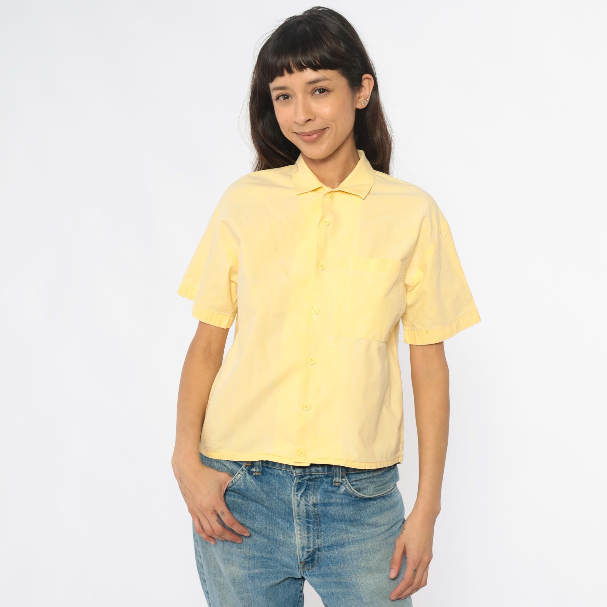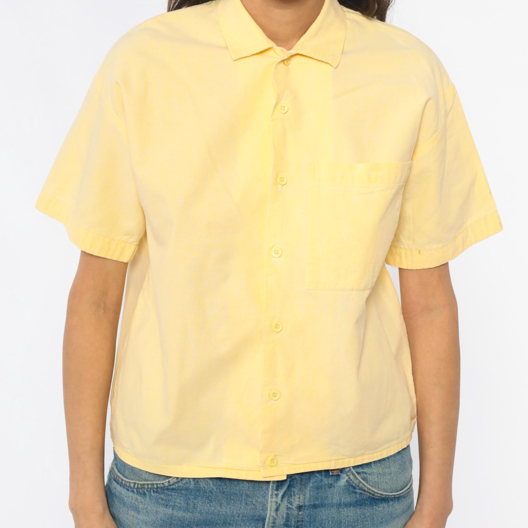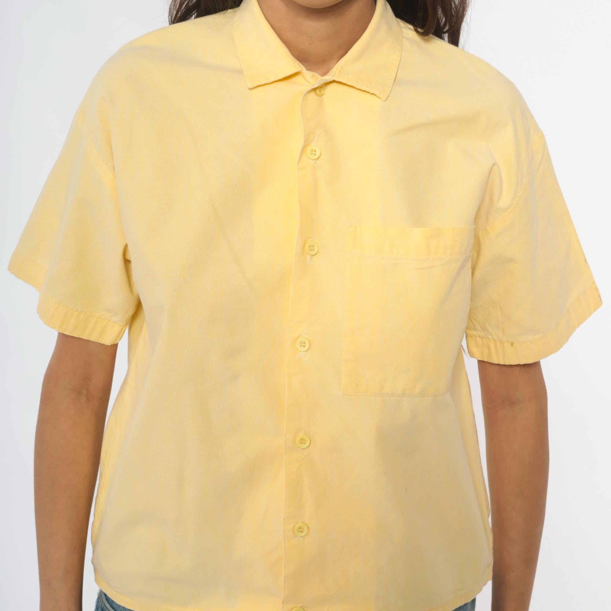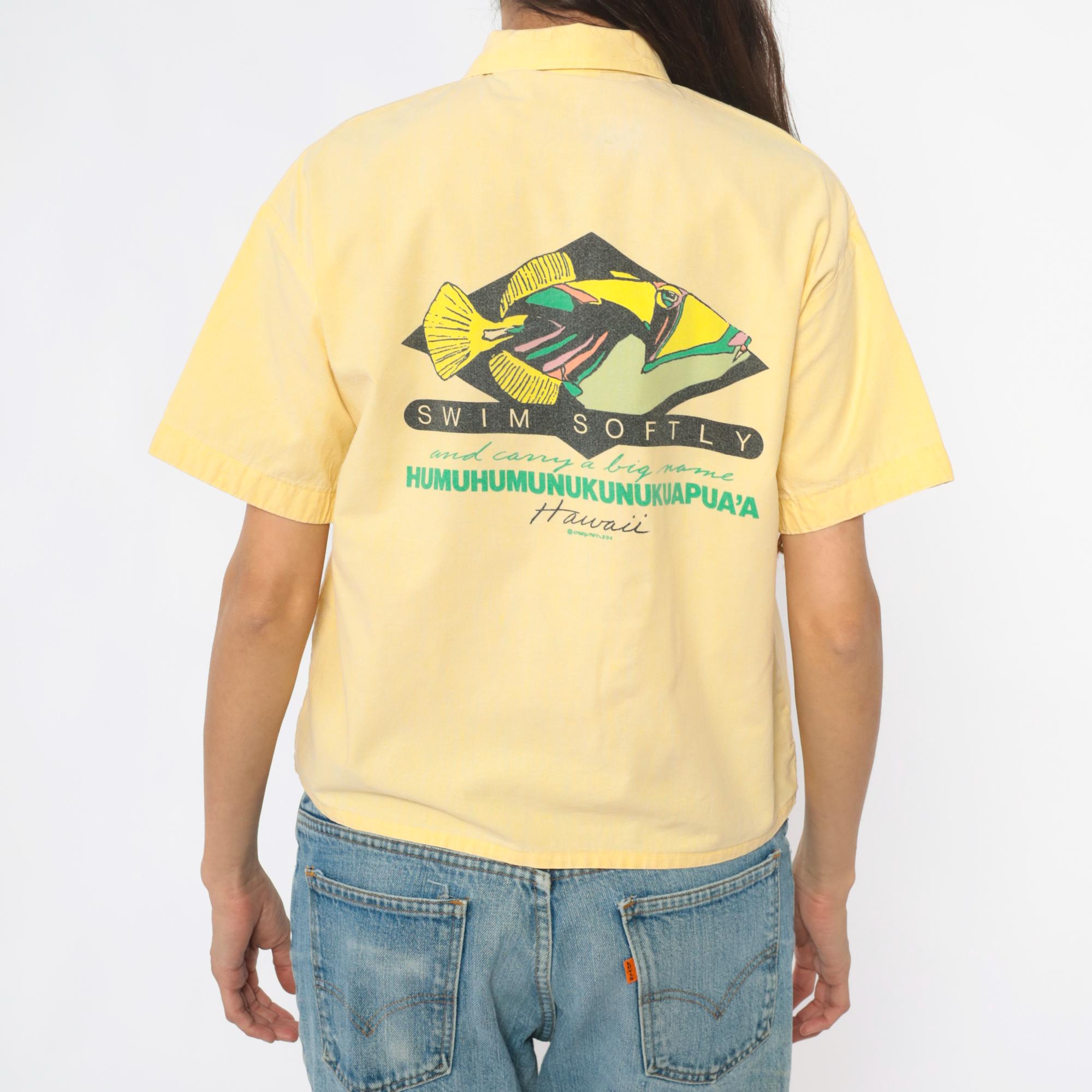 90s yellow short-sleeve button-up shirt from crazy shirts with tropical fish graphic on back reading "SWIM SOFTLY and carry a big name HUMUHUMUNUKUNUKUAPUA'A Hawaii." Pointed collar, chest pocket, and full button front closure.