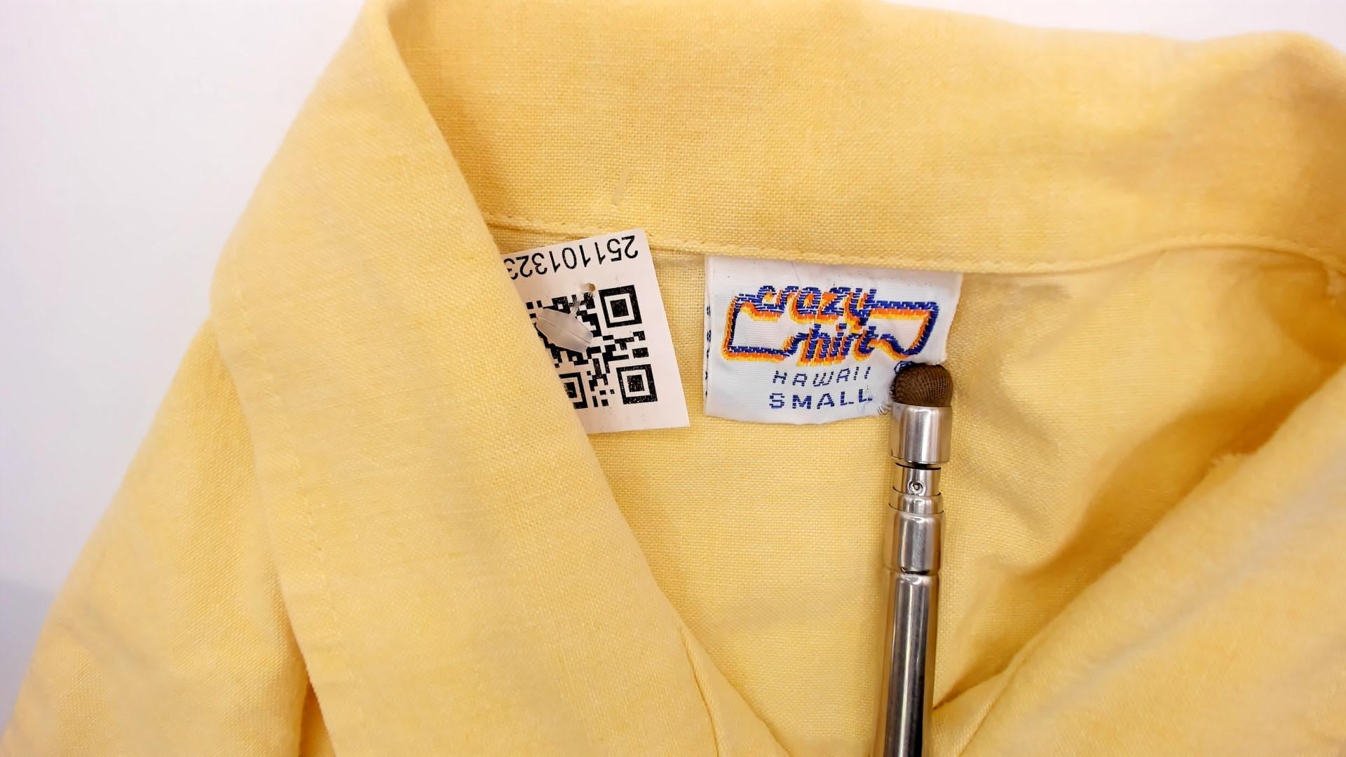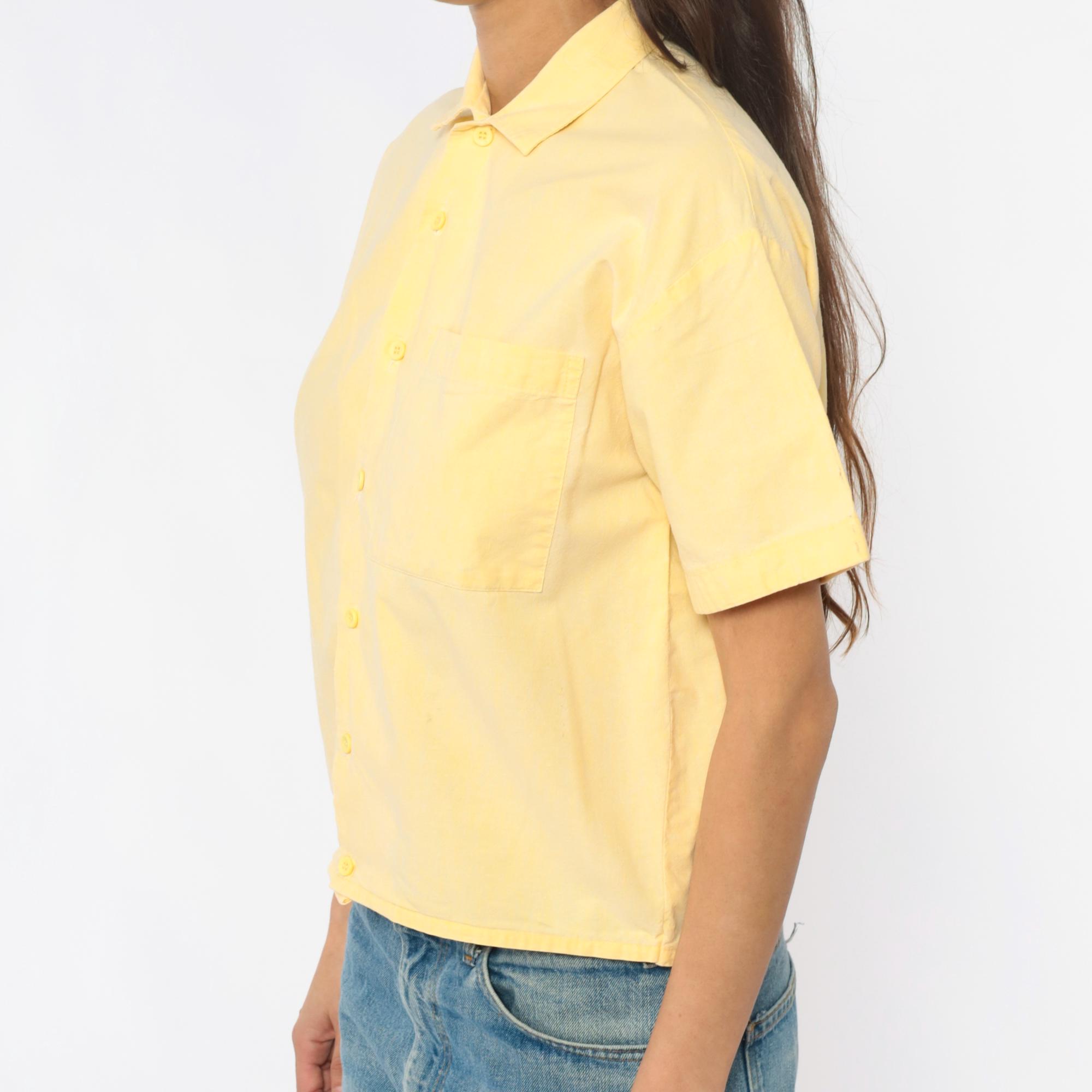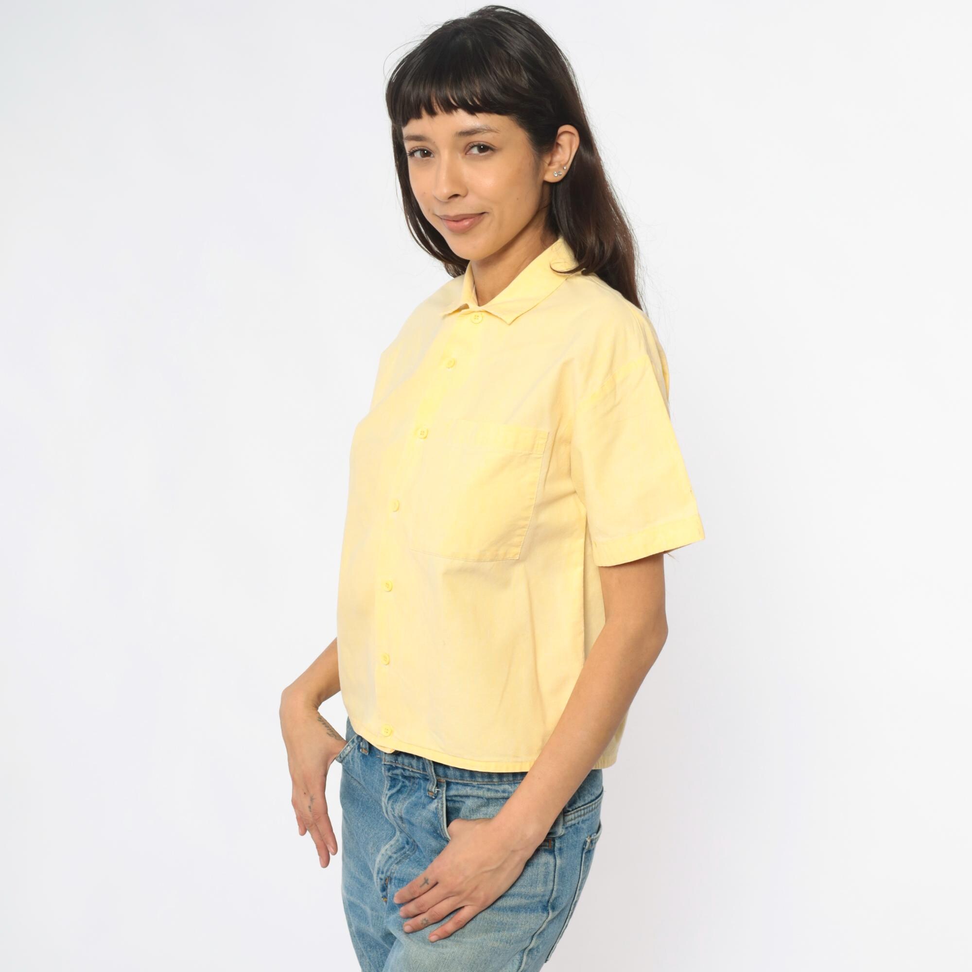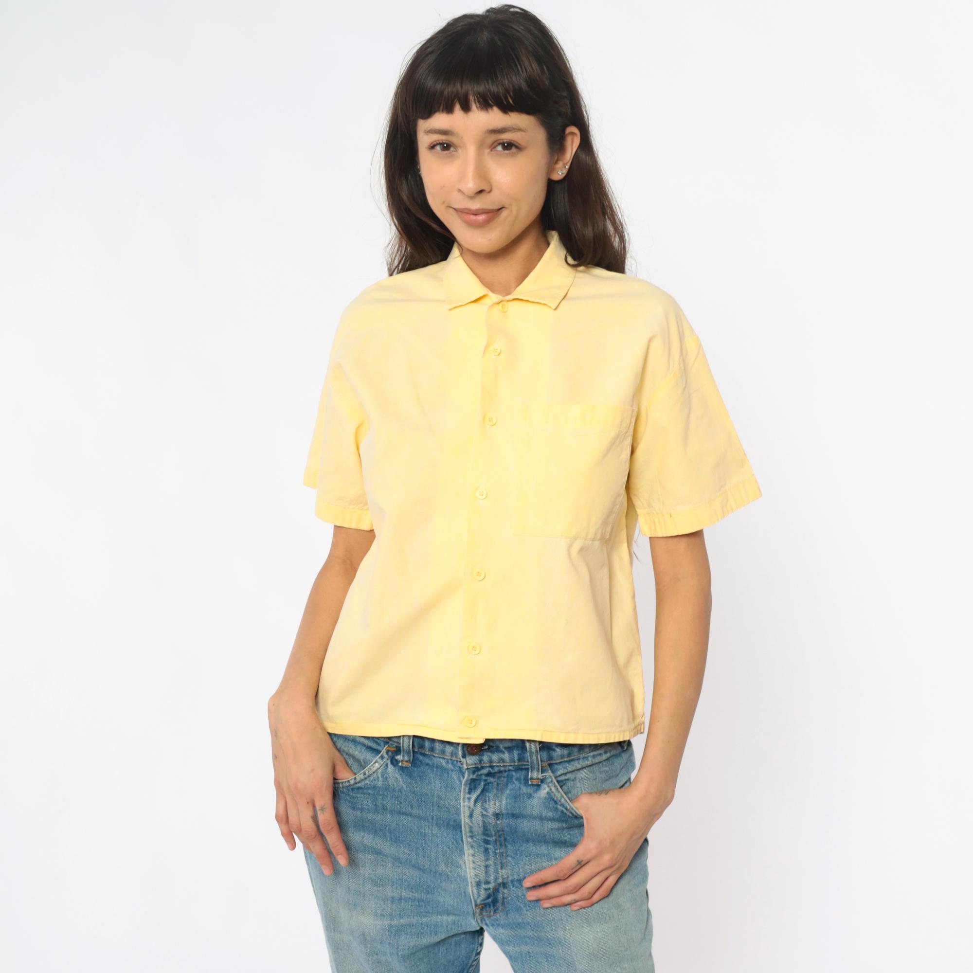 90s yellow short-sleeve button-up shirt from crazy shirts with tropical fish graphic on back reading "SWIM SOFTLY and carry a big name HUMUHUMUNUKUNUKUAPUA'A Hawaii." Pointed collar, chest pocket, and full button front closure.