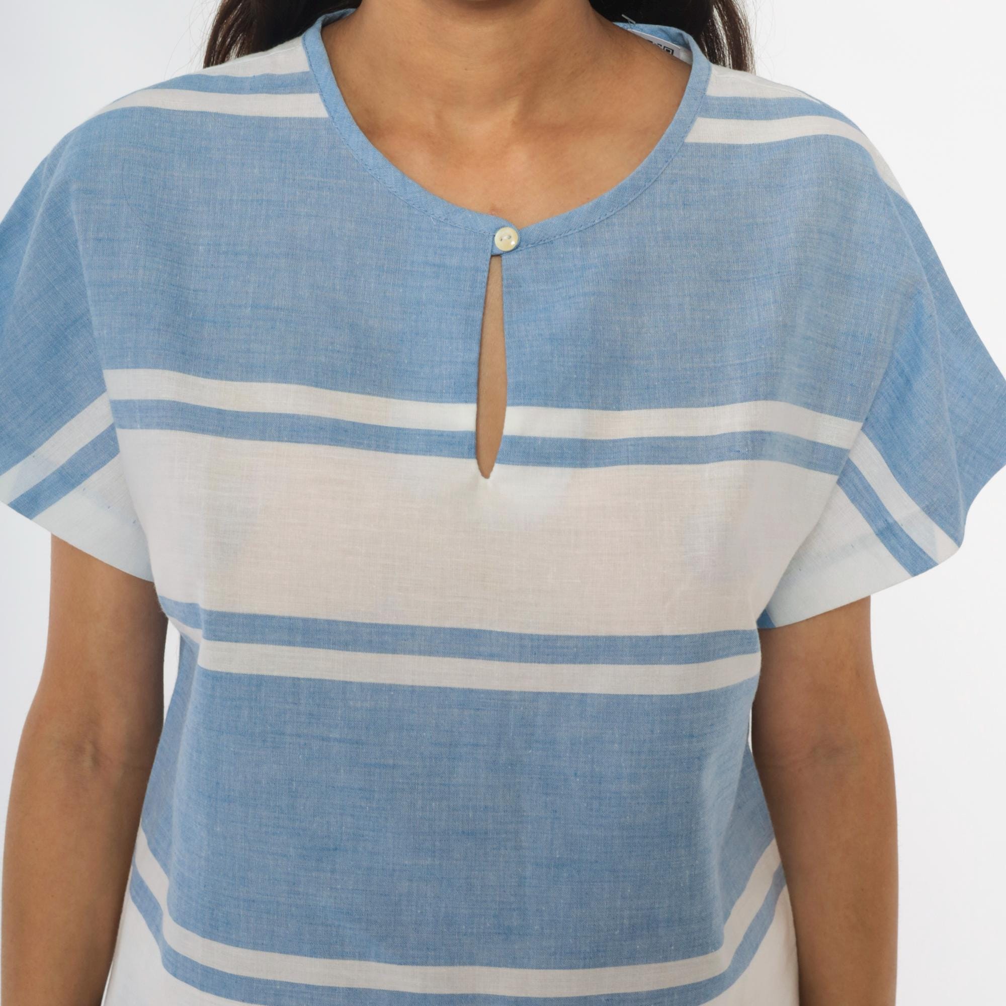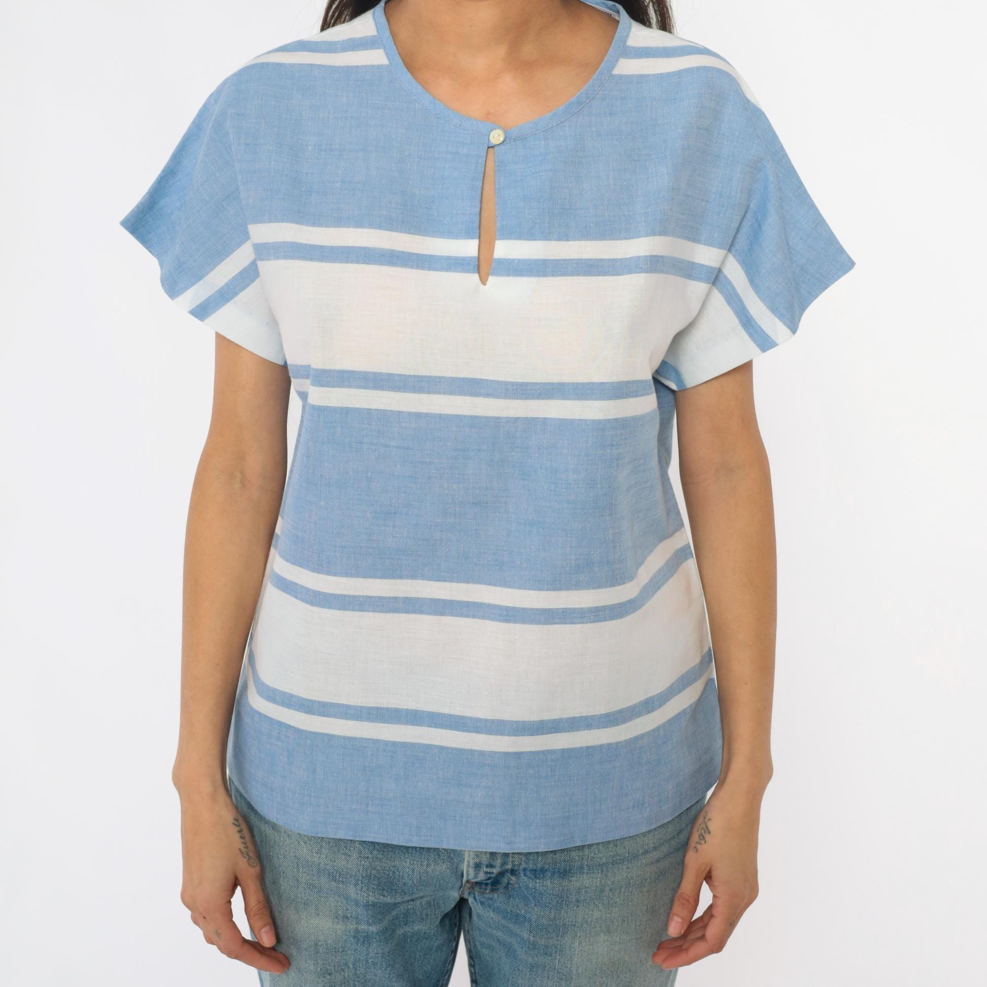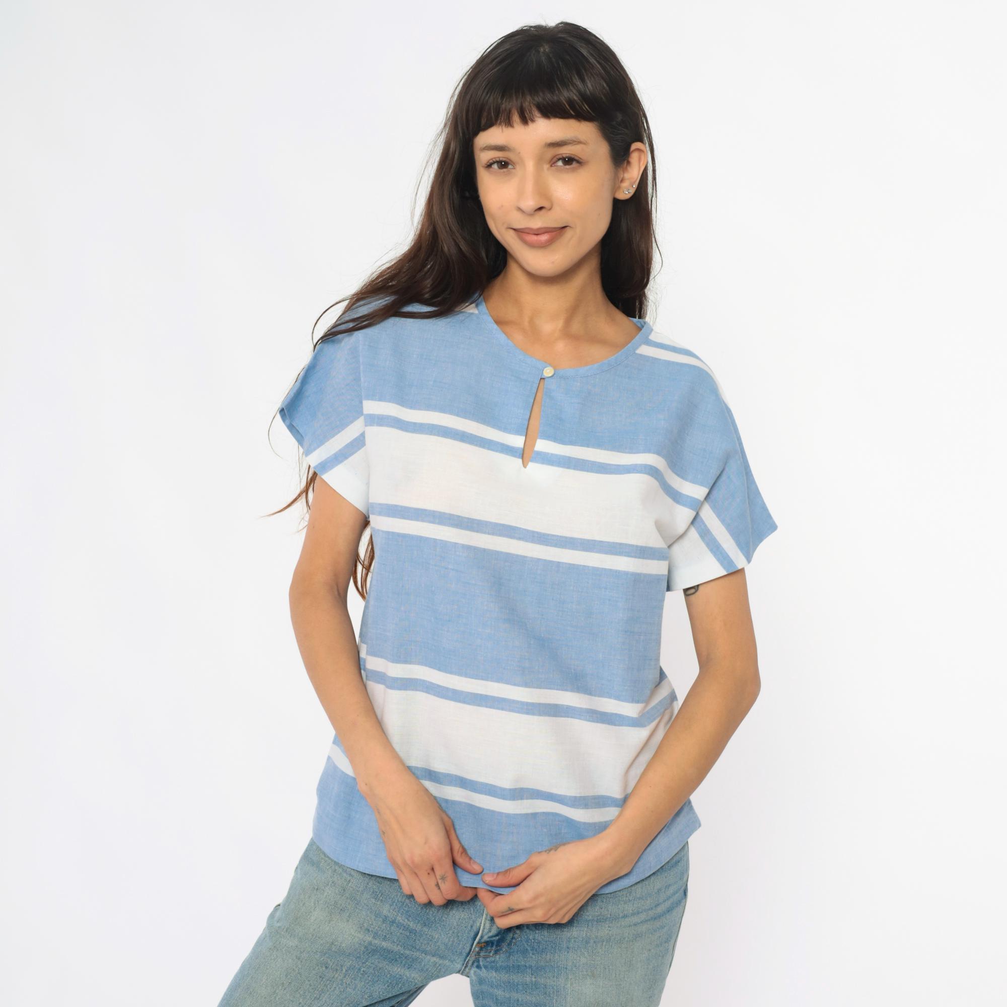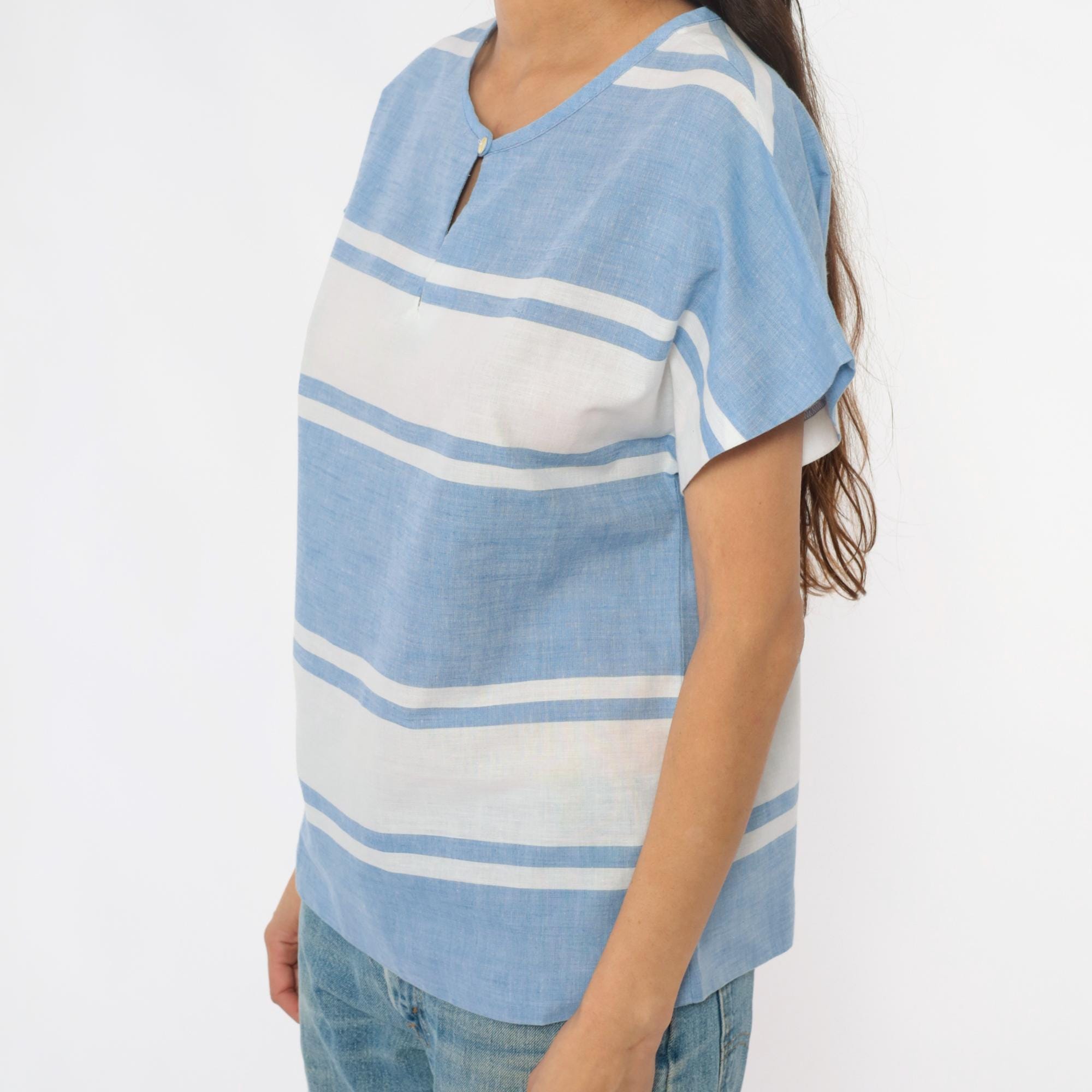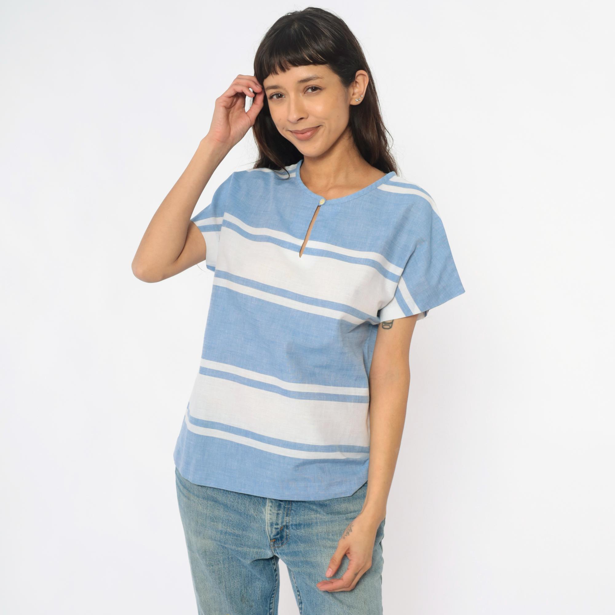 80s blue and white horizontal striped top from graff sport with single button closure at neckline and keyhole opening. Short sleeves, boxy relaxed fit, cropped length.