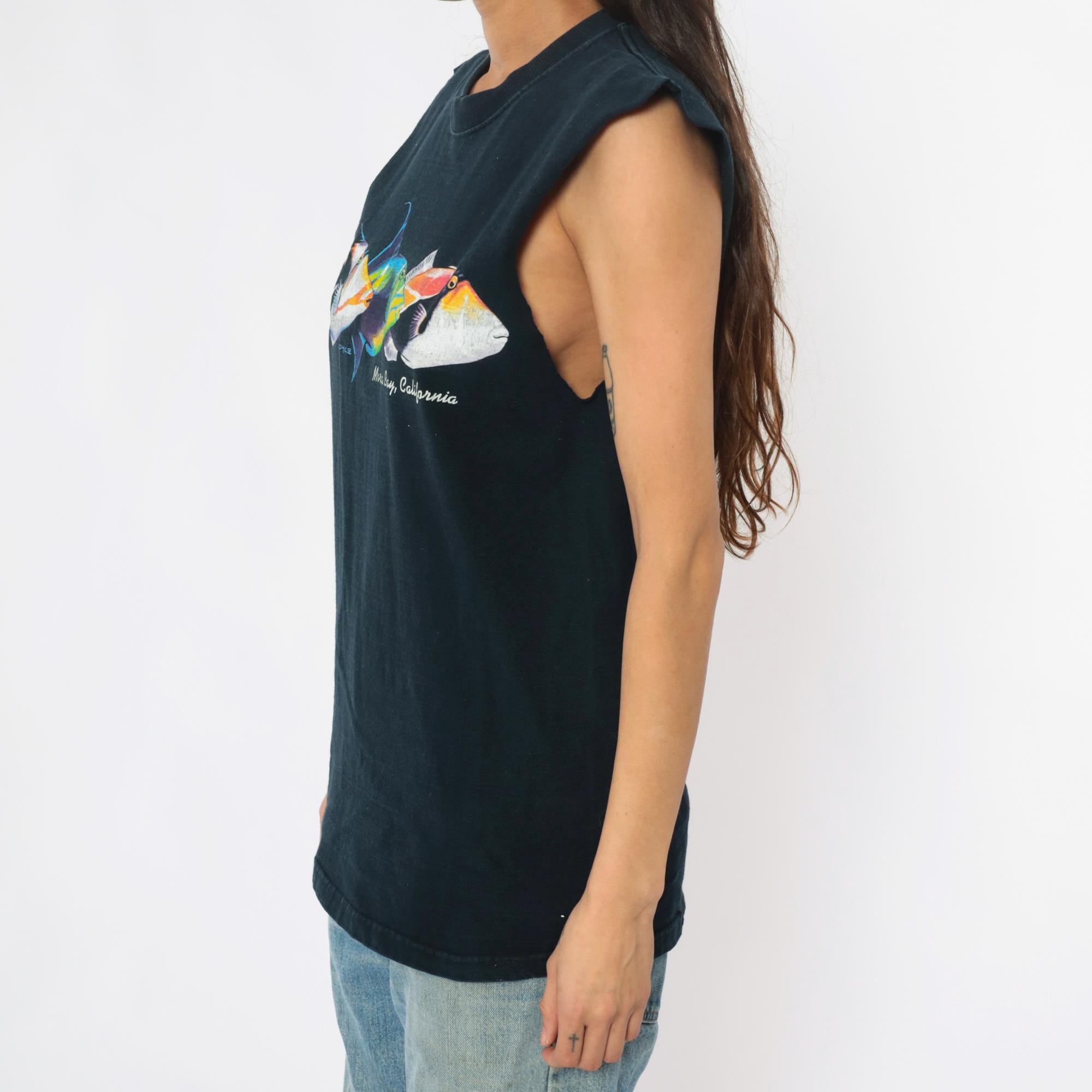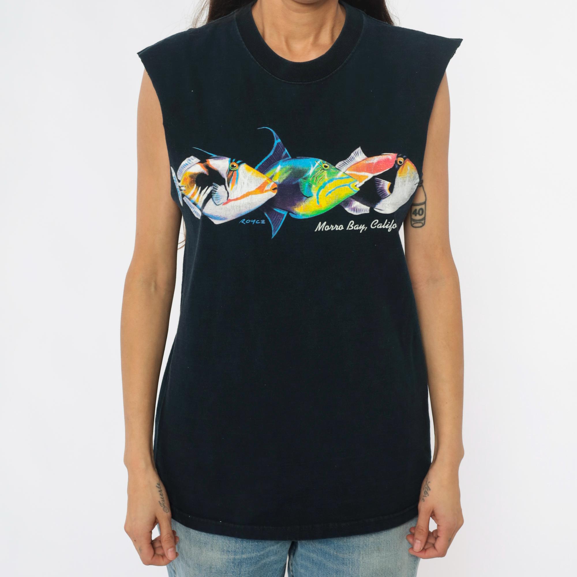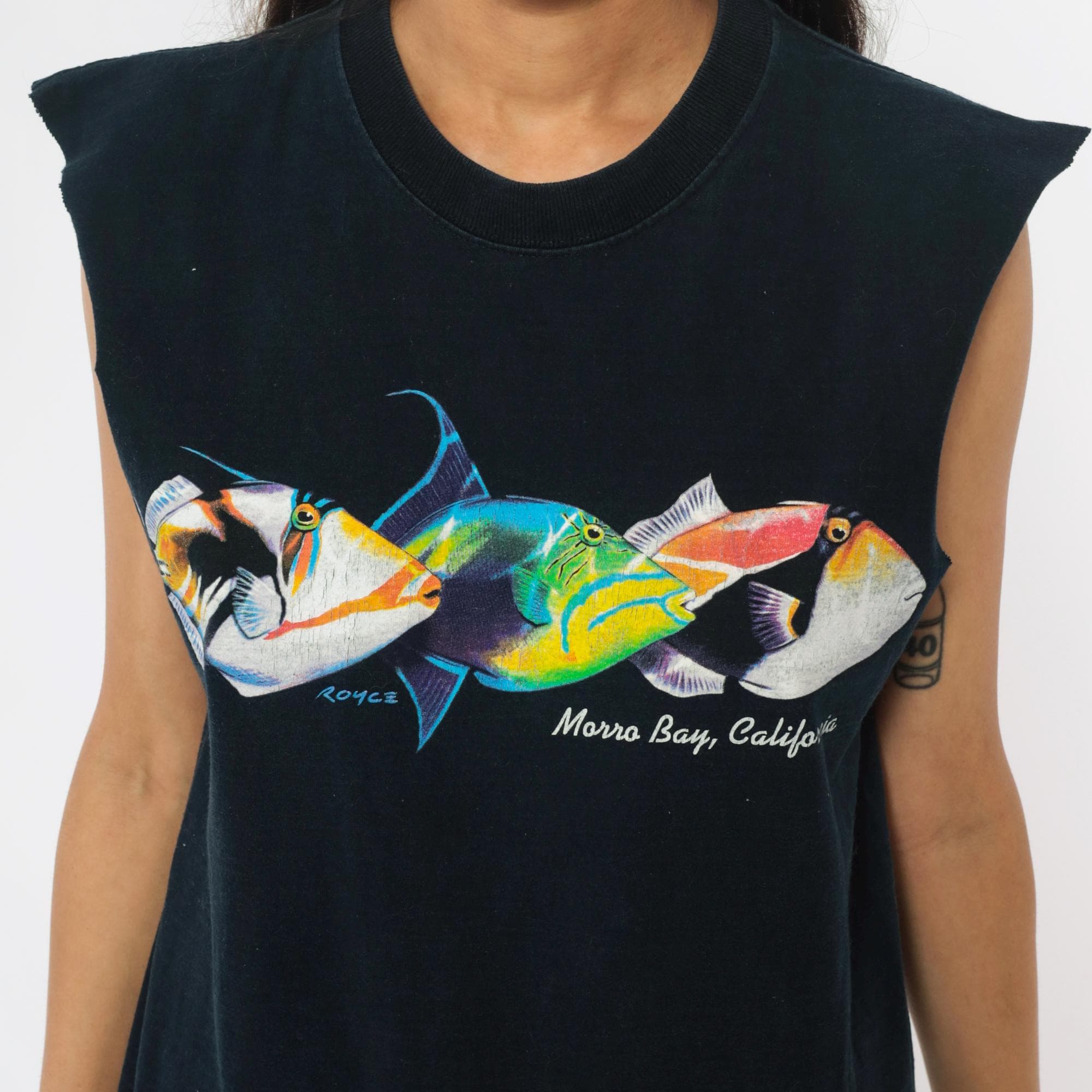 90s black sleeveless tank top from Fruit of the Loom with tropical fish graphic across the chest, featuring multiple colorful fish and "Morro Bay, Calif." text with artist signature. Shoulder pads and raw unfinished sleeve hems.