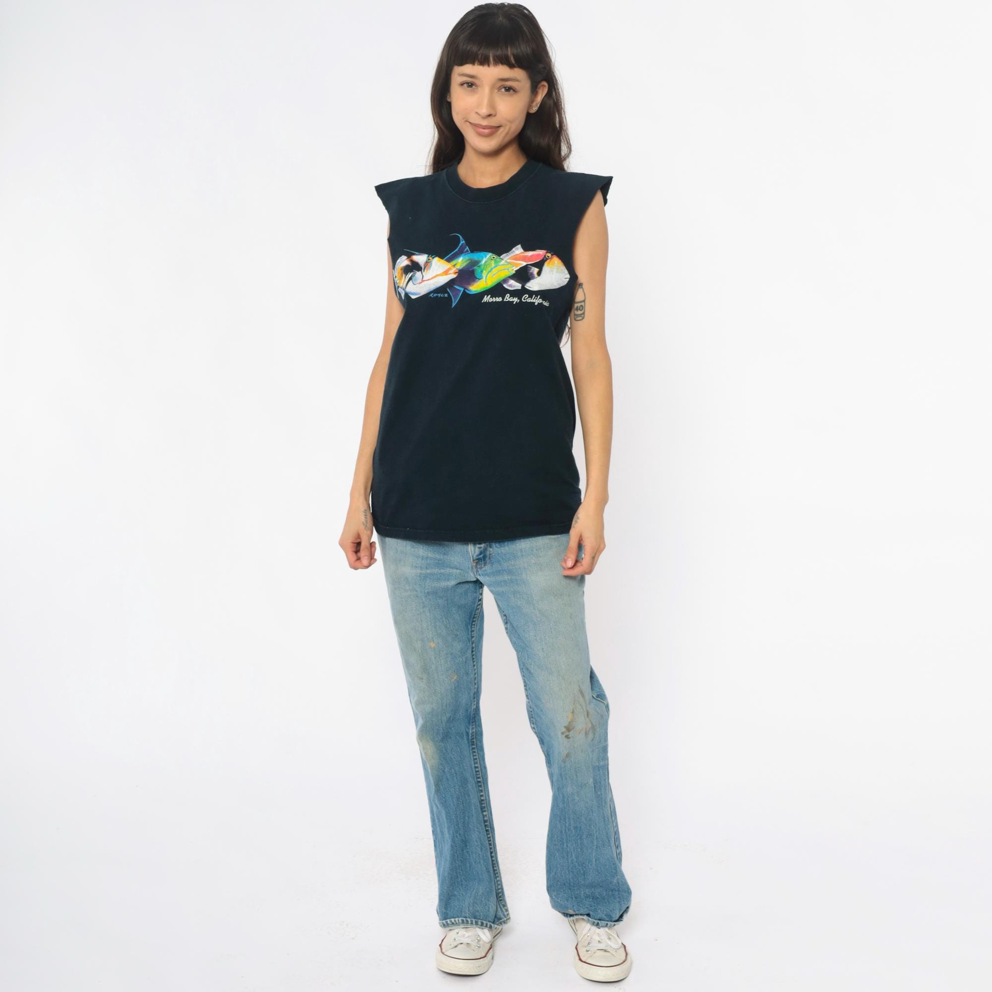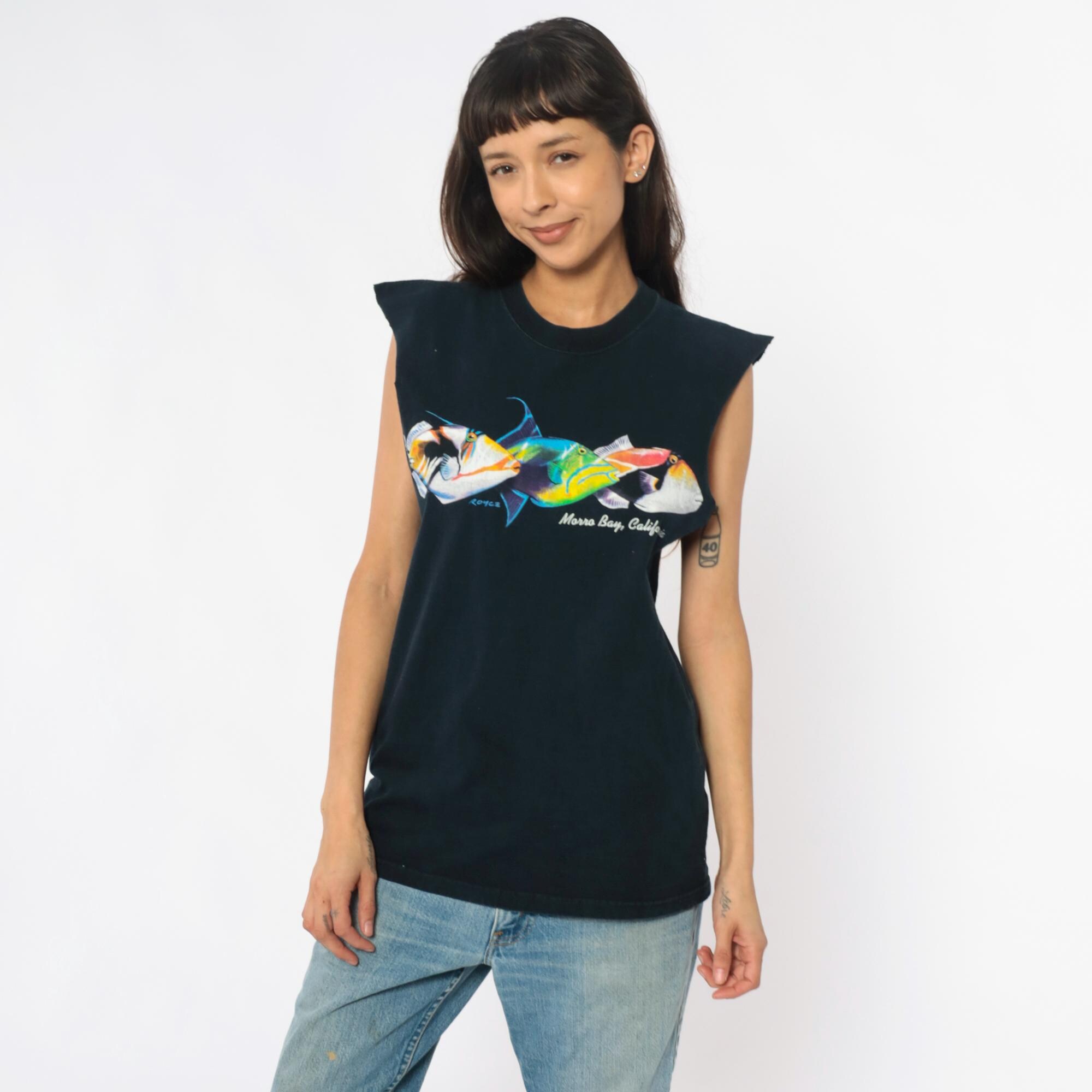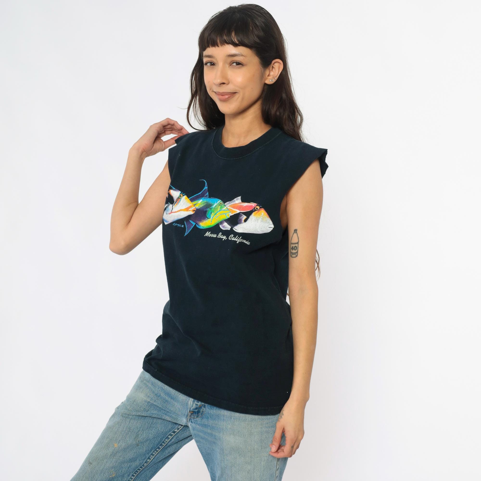 90s black sleeveless tank top from Fruit of the Loom with tropical fish graphic across the chest, featuring multiple colorful fish and "Morro Bay, Calif." text with artist signature. Shoulder pads and raw unfinished sleeve hems.