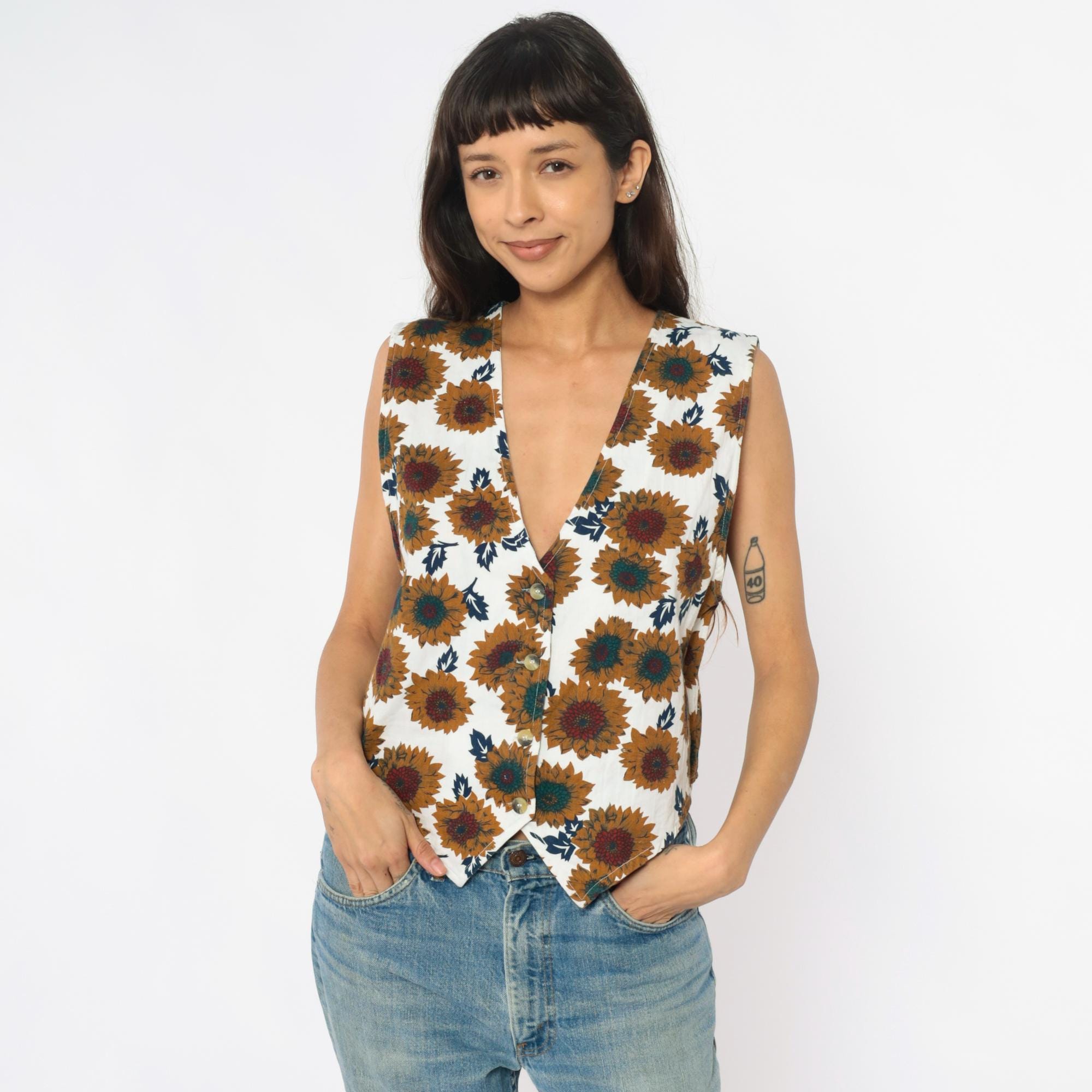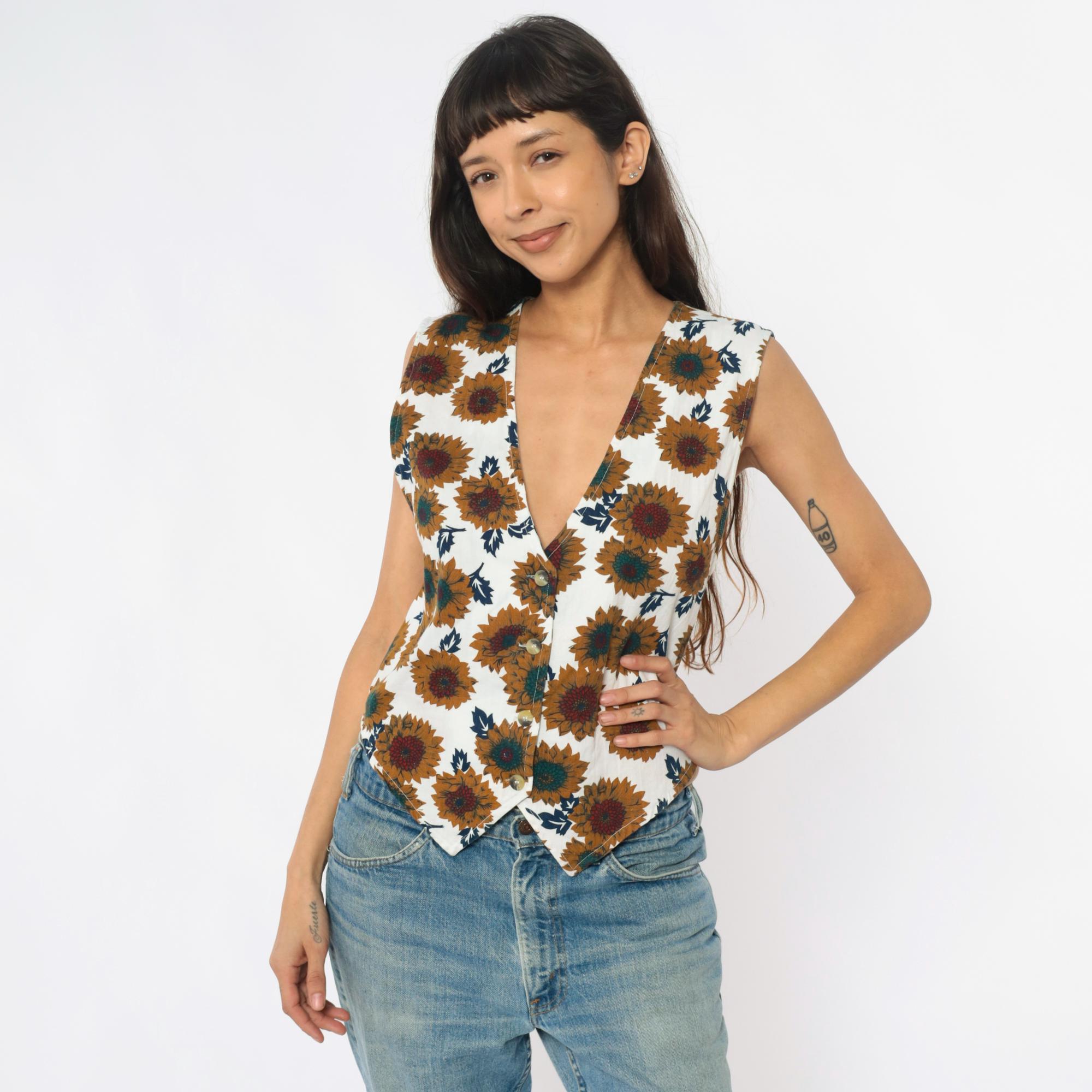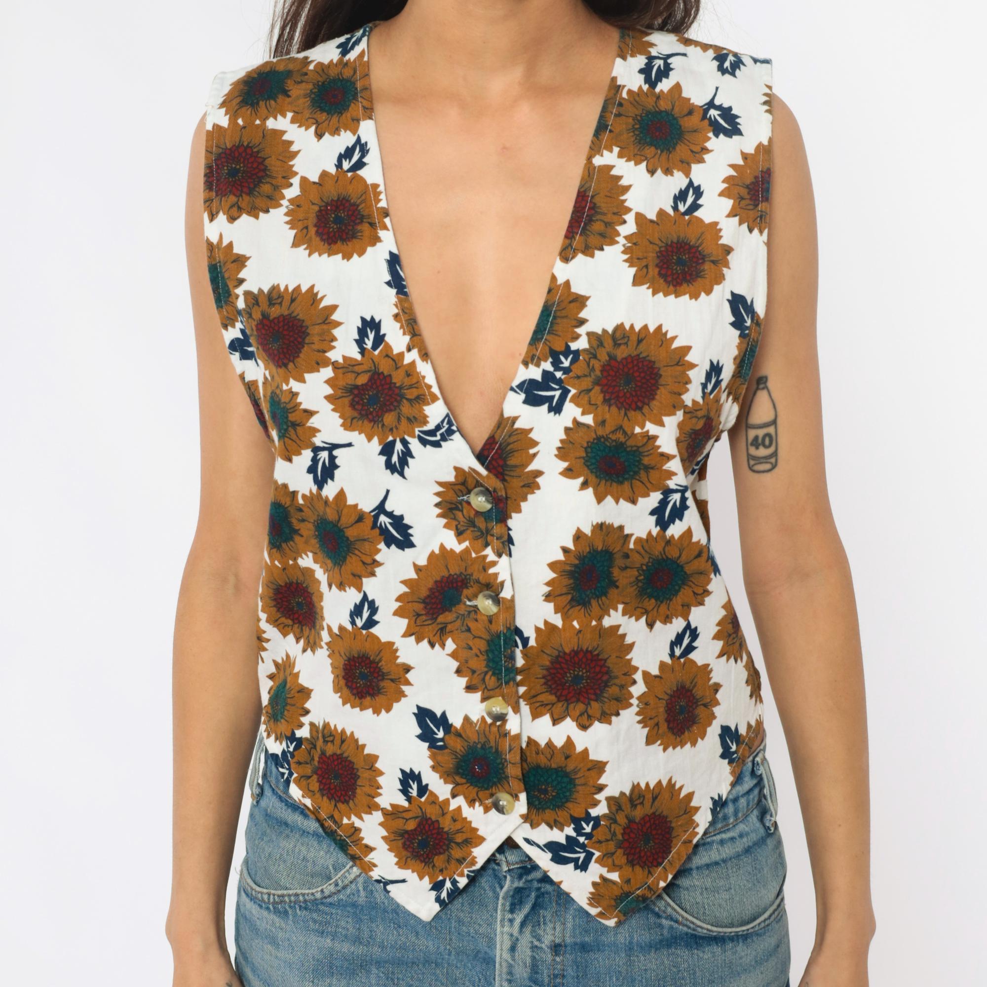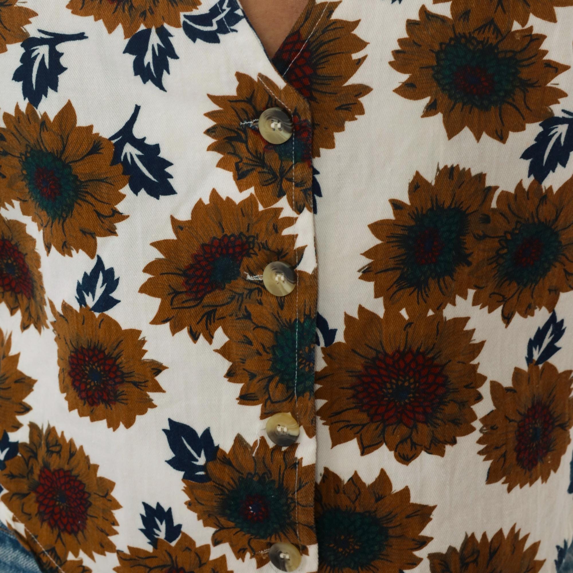 90s cream sunflower print vest from carolina colours with yellow, teal, and burgundy sunflowers and navy blue leaves across the fabric. V-neck with button front closure, sleeveless.
